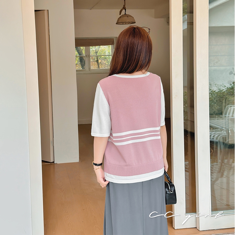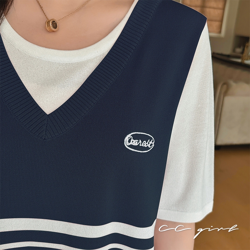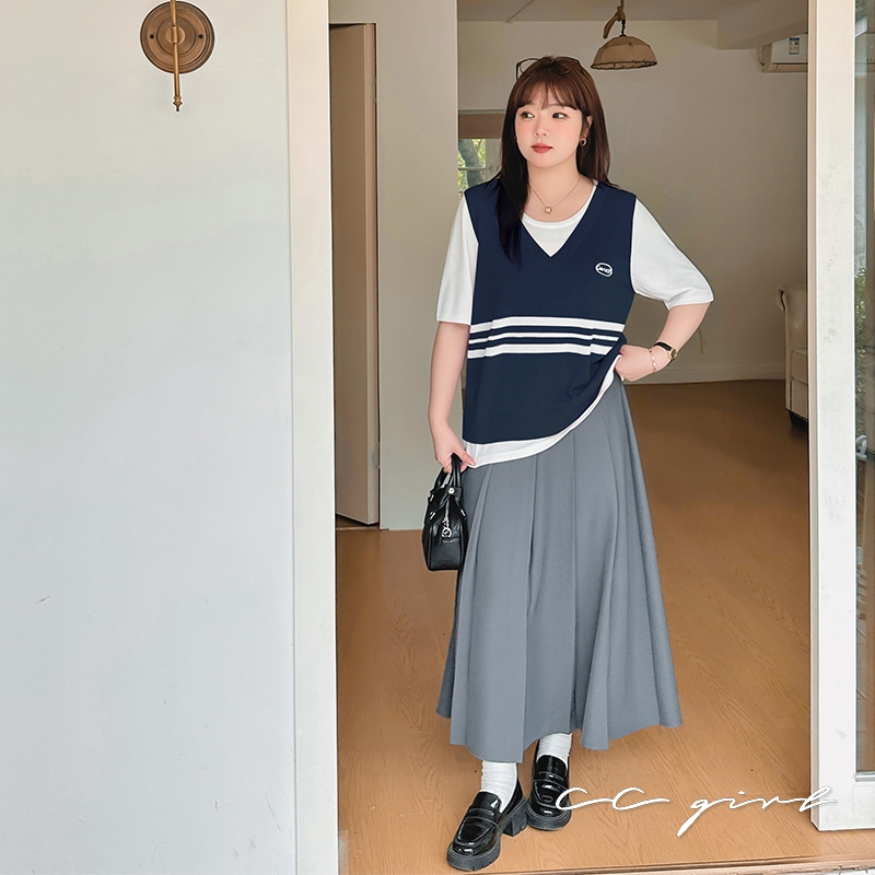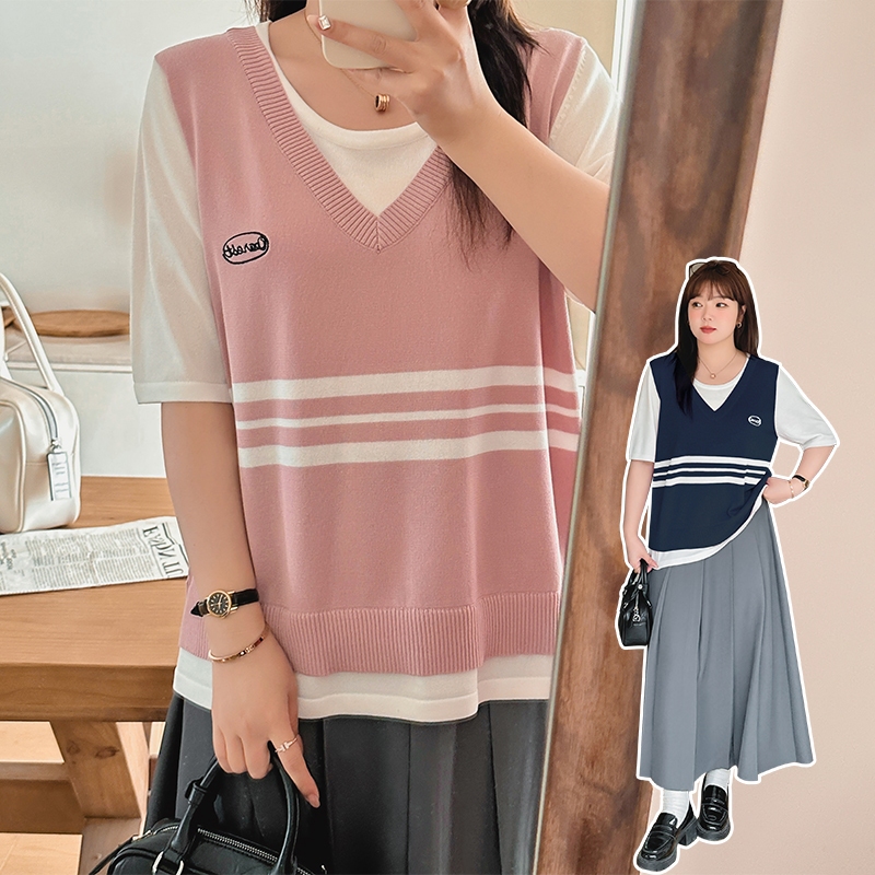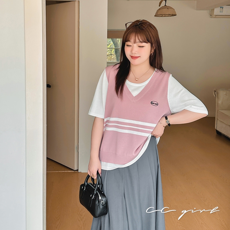 CCGIRL中大尺碼 氣質學院風假兩件刺繡設計針織圓領上衣-共2色-適L~4L《N0200》大尺碼女裝 中大尺碼上衣