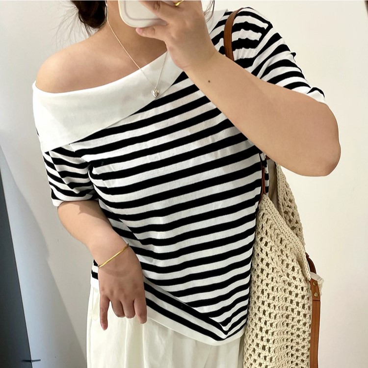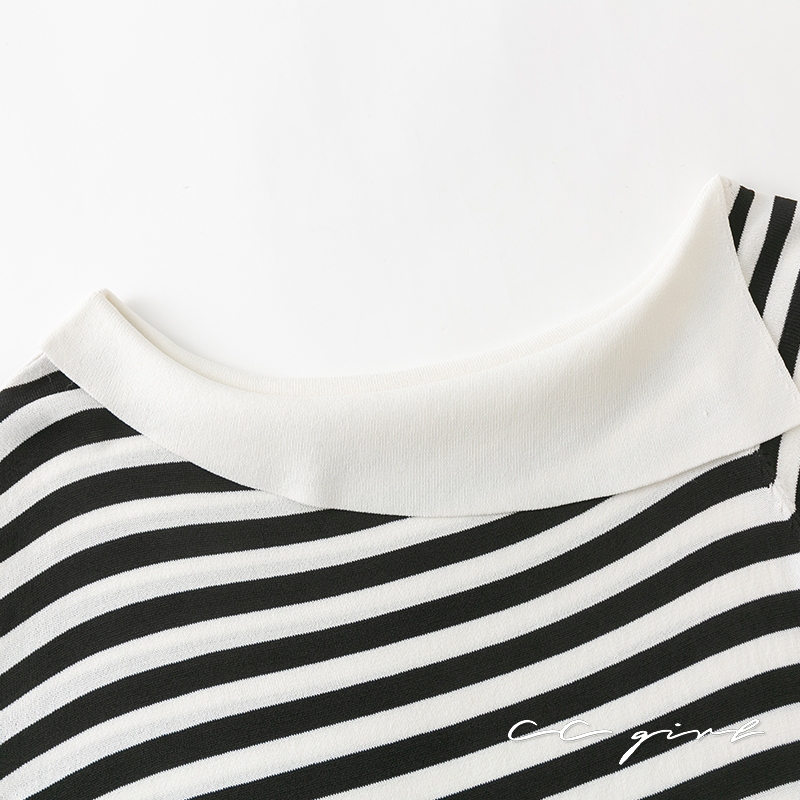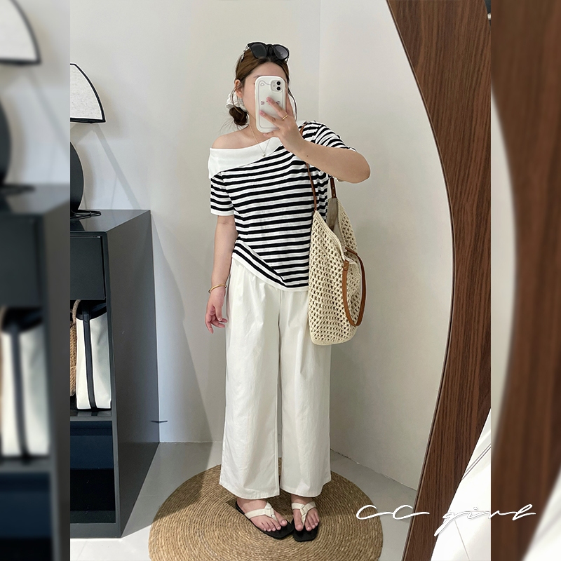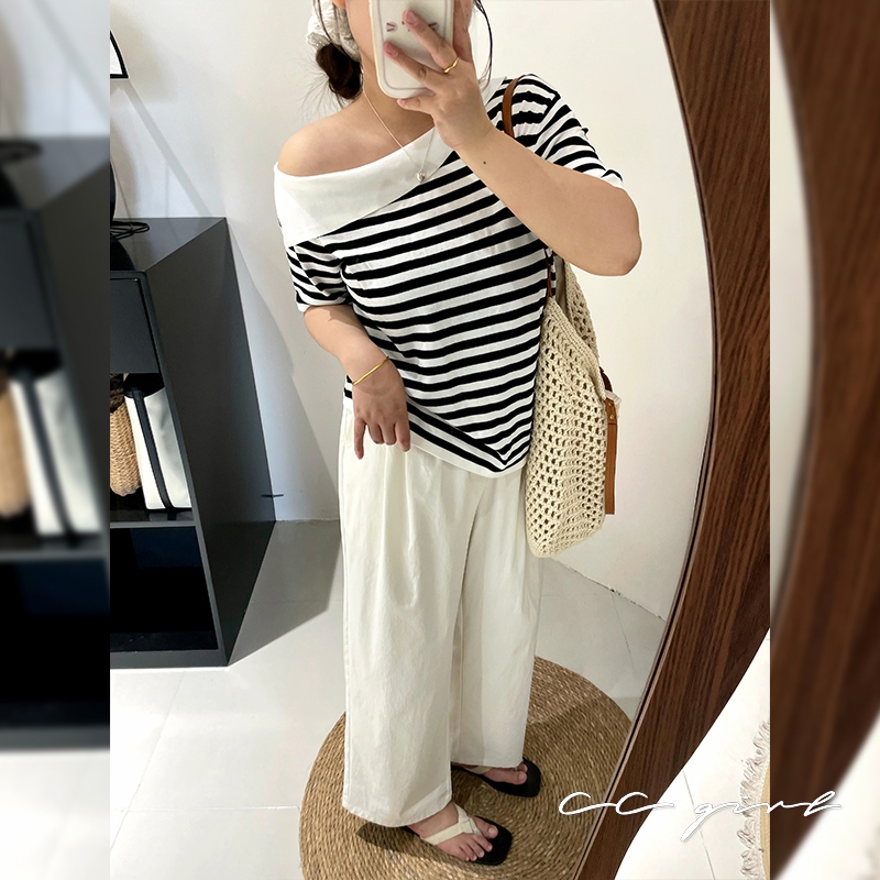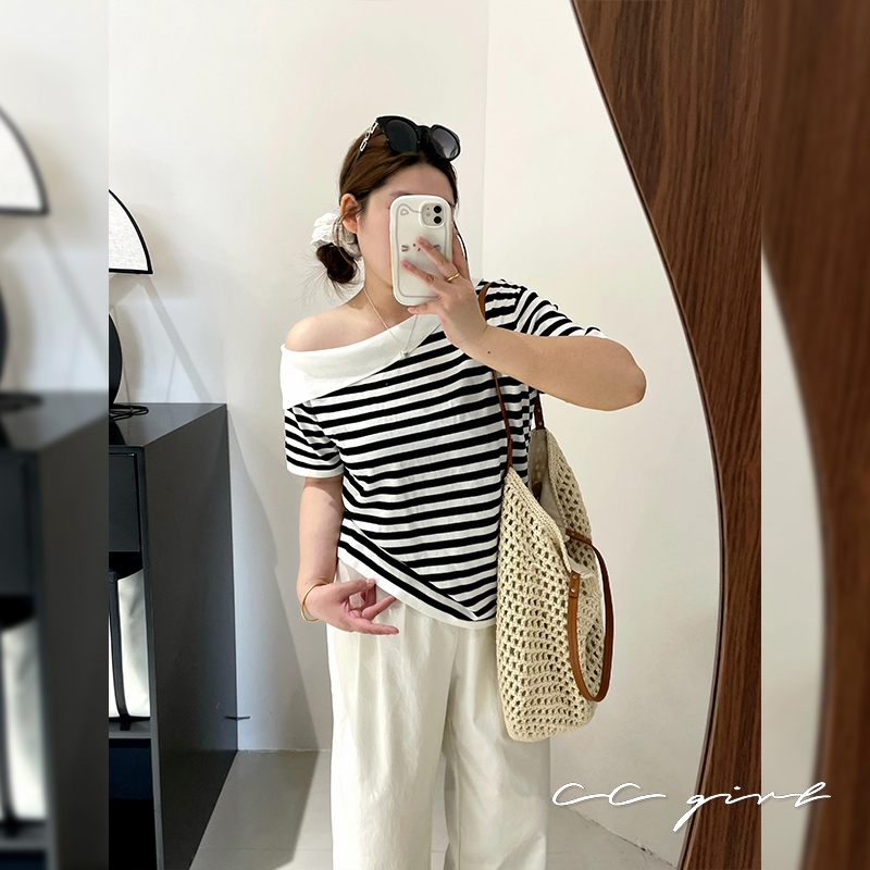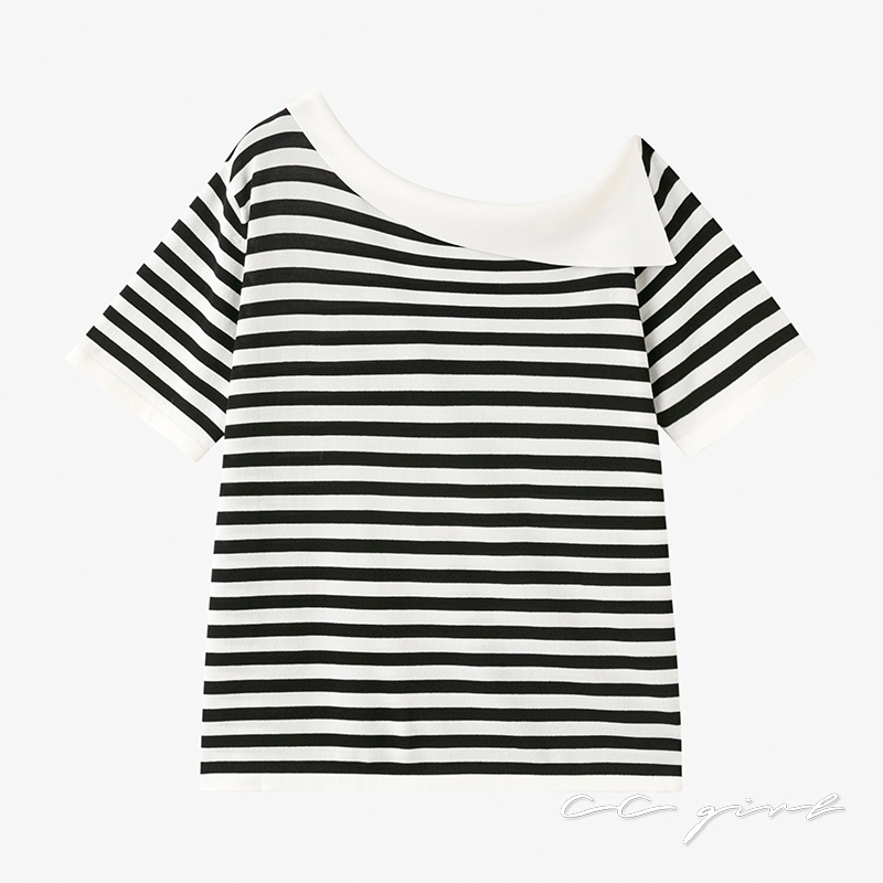 CCGIRL中大尺碼 小露香肩翻式一字領♡日系海軍風針織短袖上衣-適2L~4L《20869》大尺碼女裝 中大尺碼上衣日系海軍風-2L(建議2L和3L適穿)|日系海軍風-3L(建議3L和4L適穿)CCGIRL中大尺碼女裝