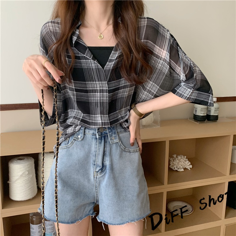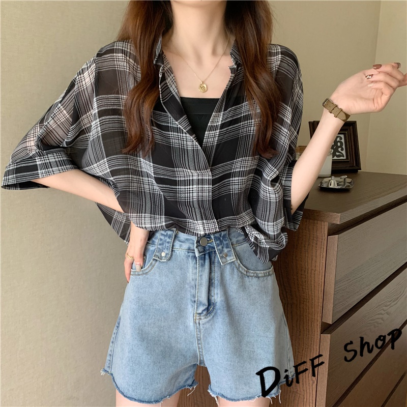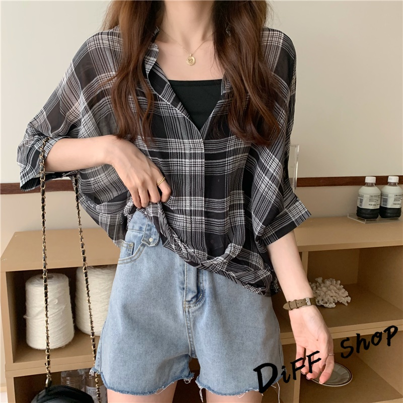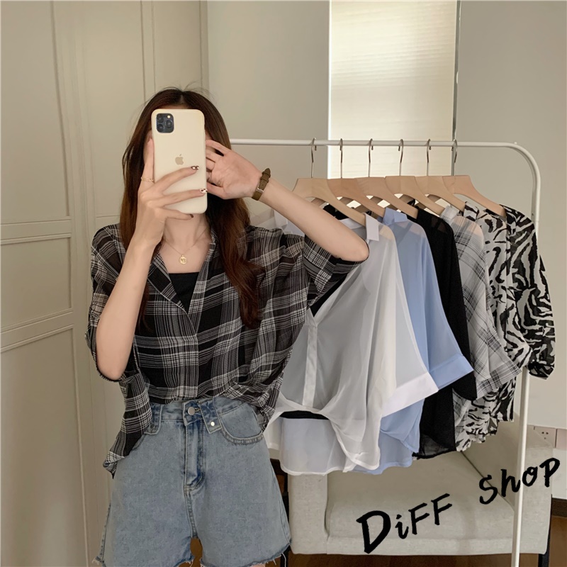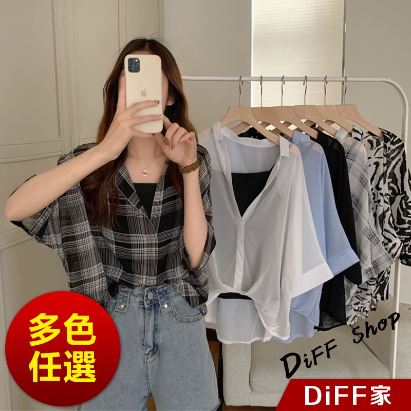 【DIFF】韓版雪紡顯瘦蝙蝠袖襯衫+背心 套裝 短袖上衣 短袖t恤 女裝 顯瘦上衣 衣服 寬鬆上衣 防曬上衣【S182】【S182】白色|【S182】黑色格子Shirts & BlousesDiFF shop