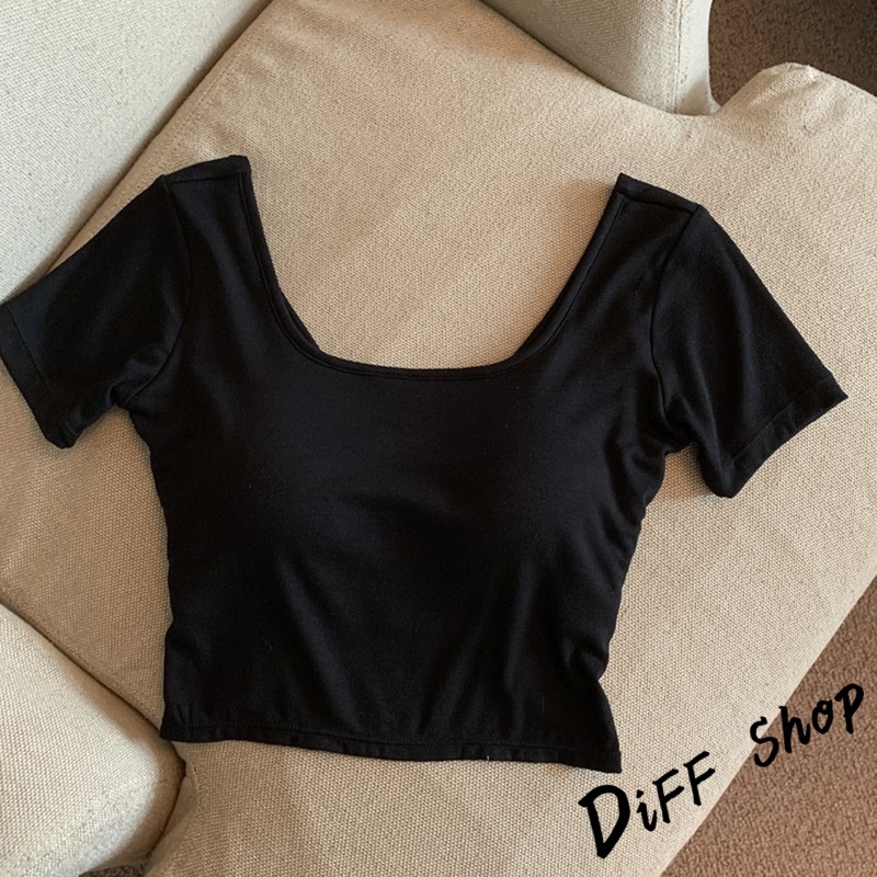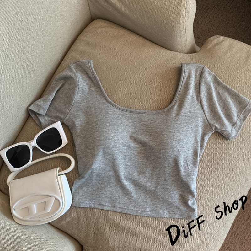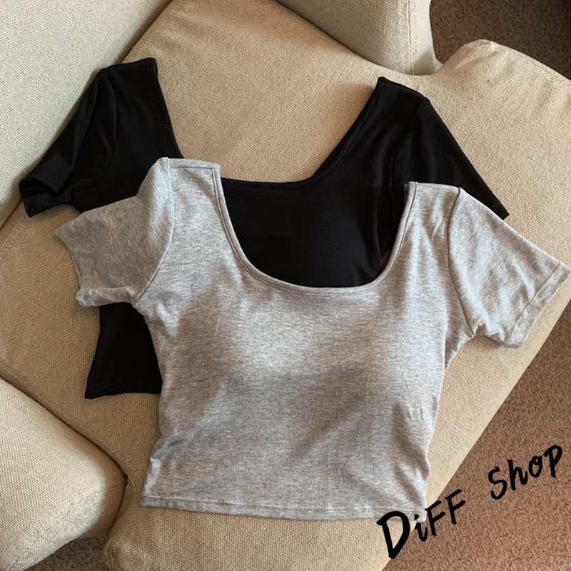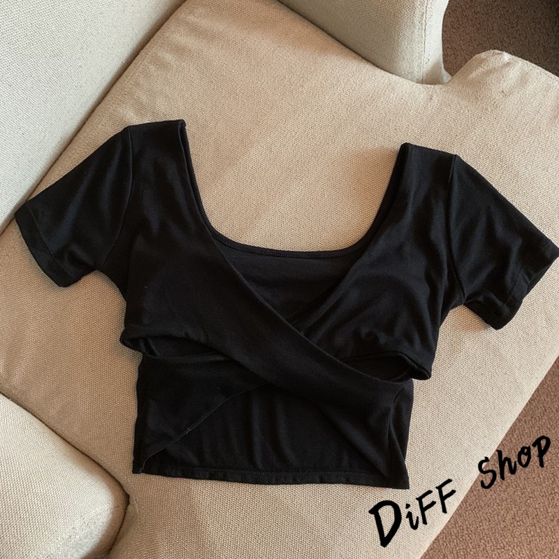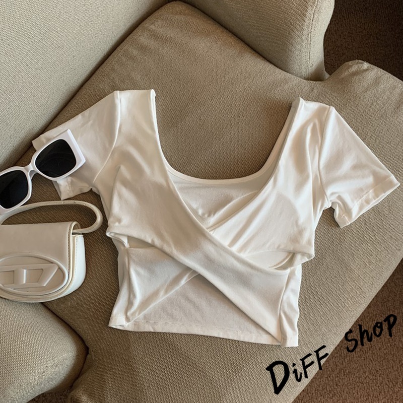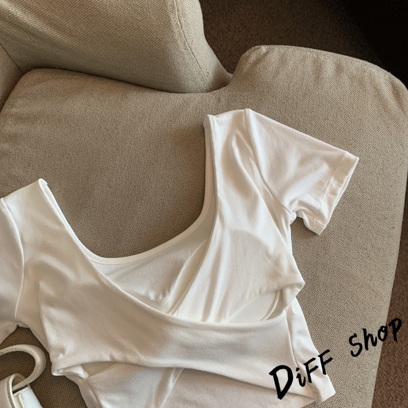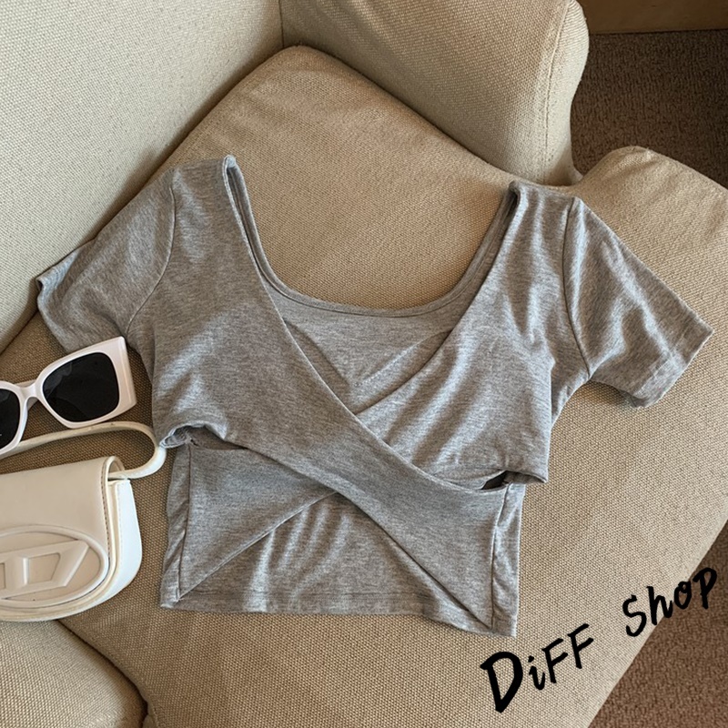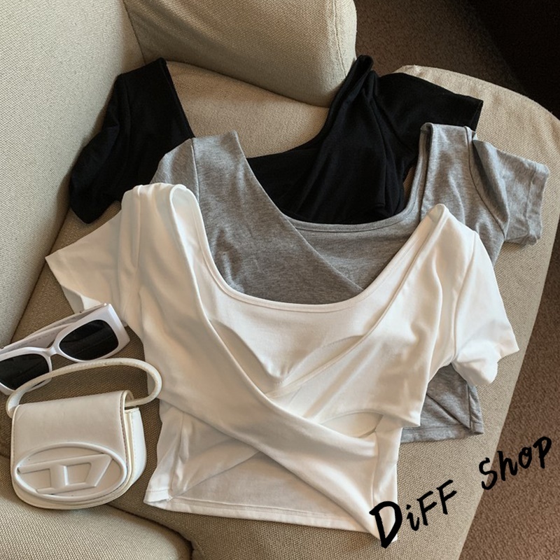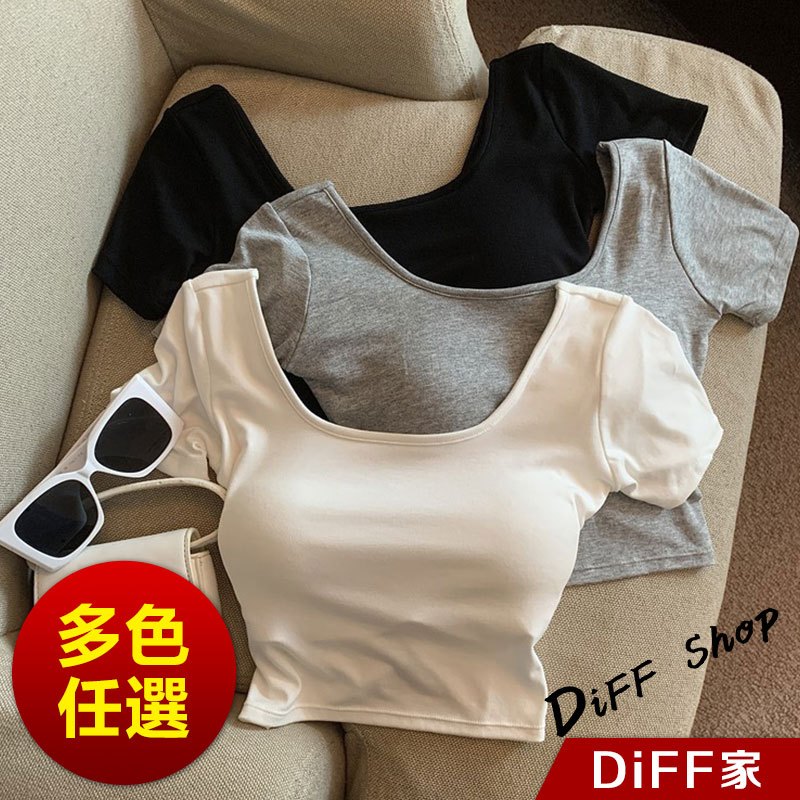 【DIFF】韓版方領設交叉後美背短袖上衣 帶胸墊免穿內衣 短版上衣衣服 夏天女裝 短板上衣 短版t恤 女裝【T628】【T628】白色|【T628】黑色|【T628】灰色T-shirtsDiFF shop