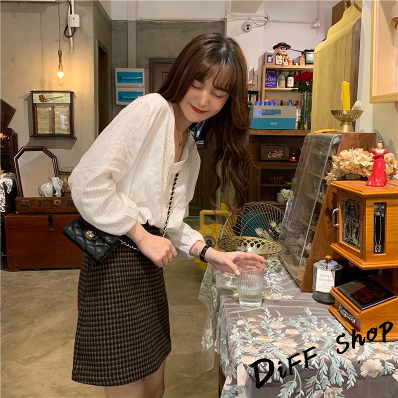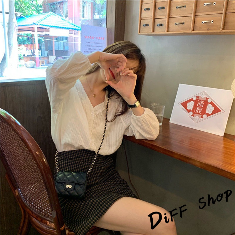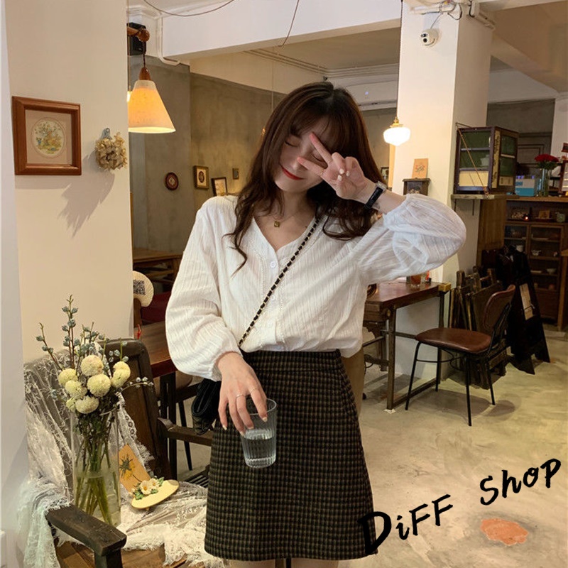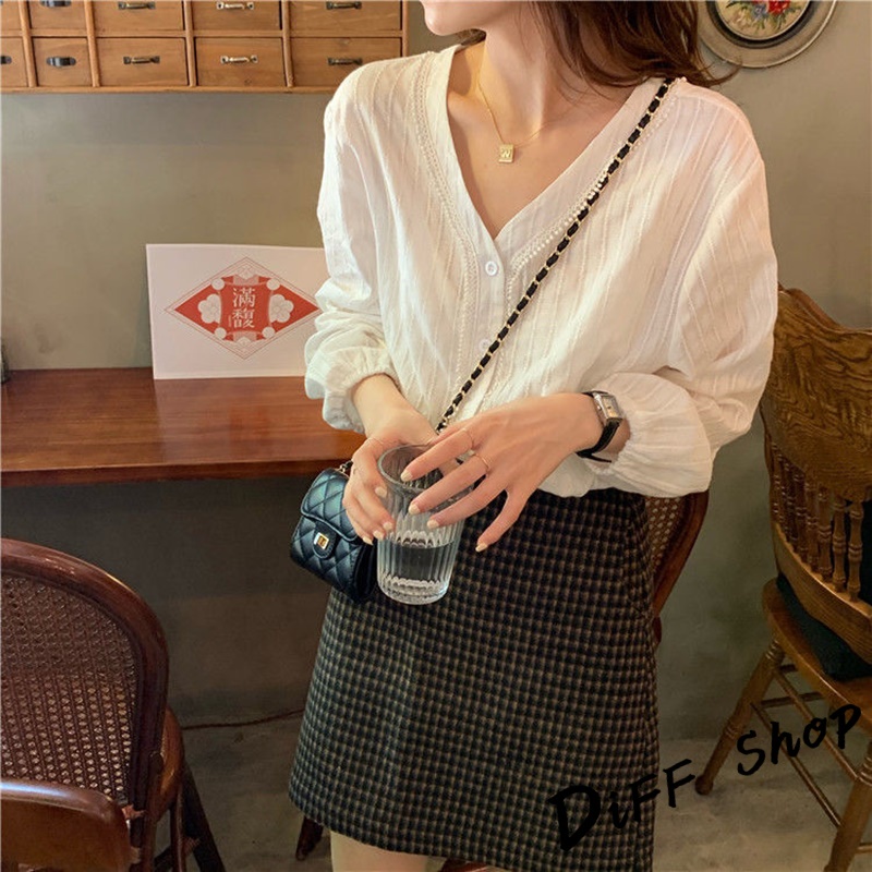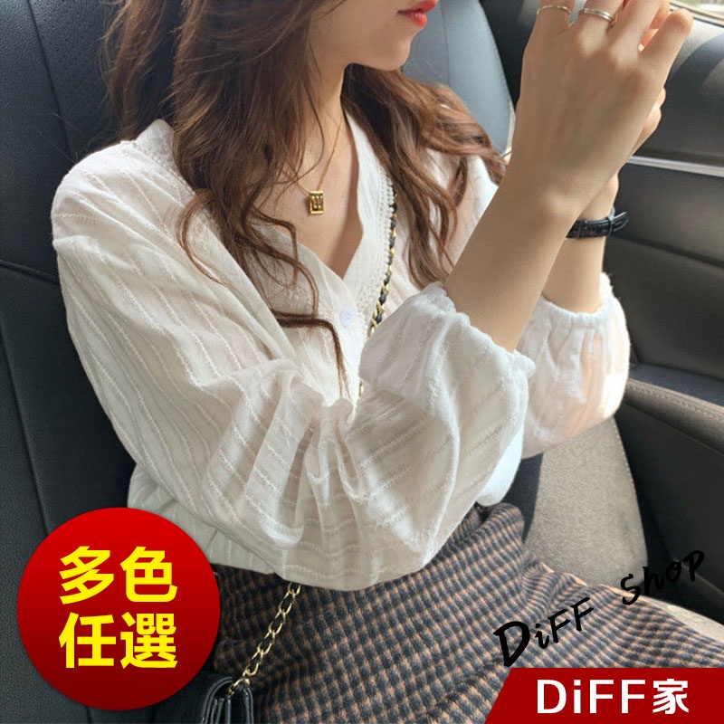 【DIFF】韓版元氣甜美排扣V領蕾絲長袖襯衫 長袖上衣 女裝 衣服 寬鬆上衣 顯瘦上衣 冬裝 長袖t恤 素T【W210】【W210】白色Shirts & BlousesDiFF shop