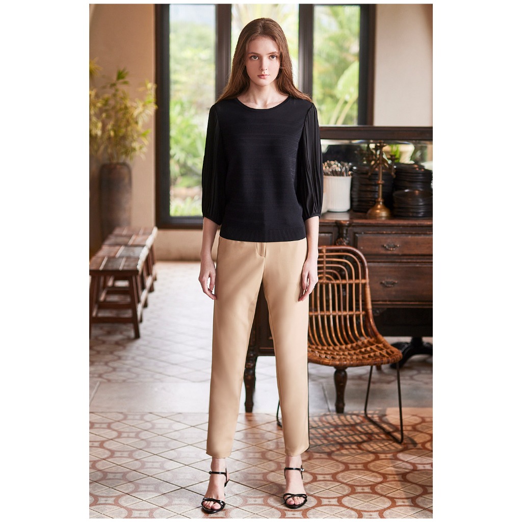【en-suey 銀穗】雪紡壓褶袖圓領橫紋組織線衫 – 白/黑 5113-5301黑,XL|白,M|白,L|白,XL|黑,M|黑,Len-suey 銀穗