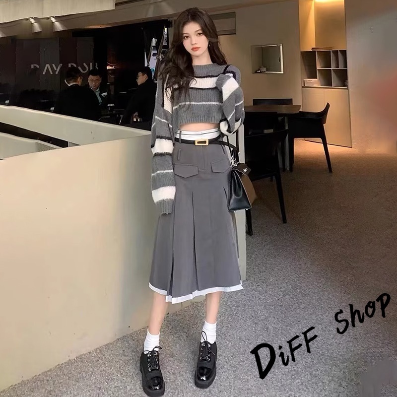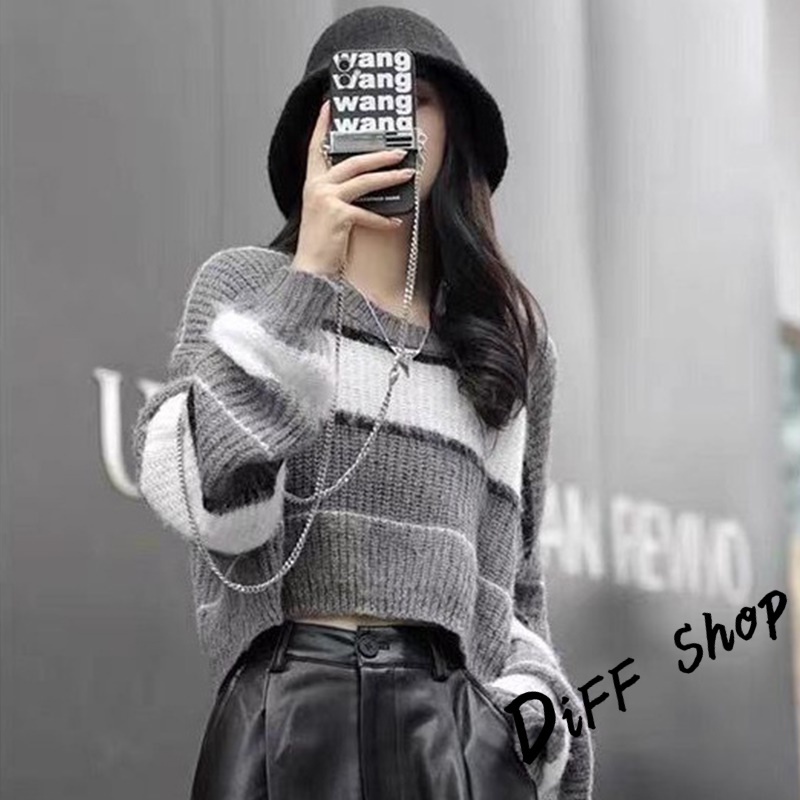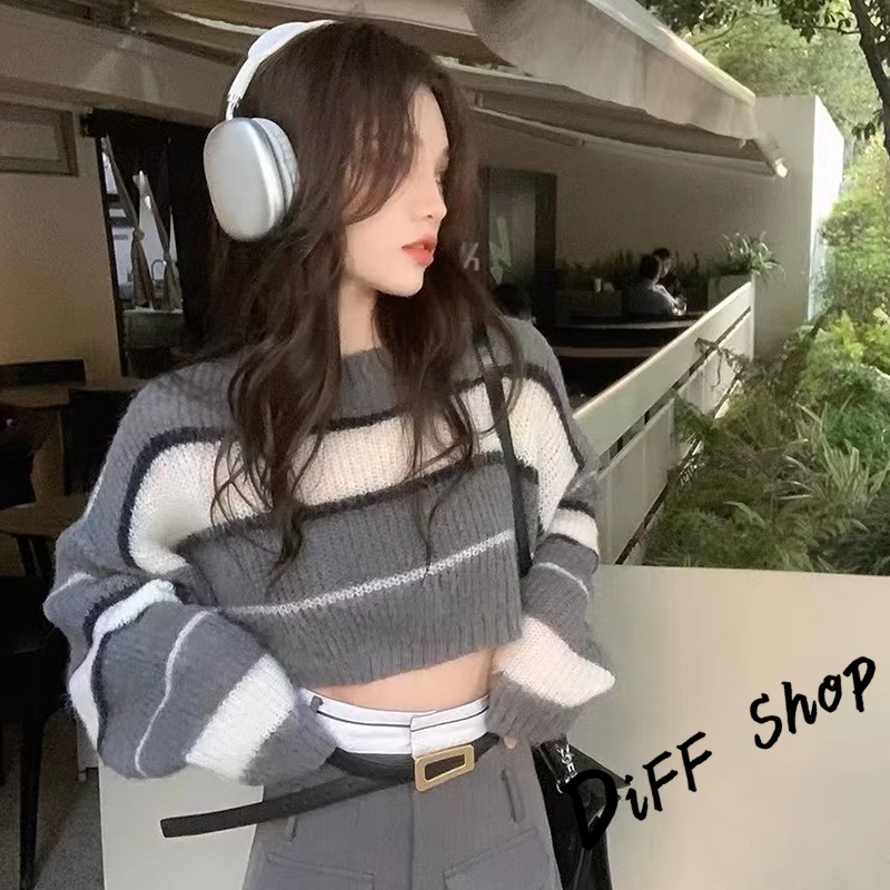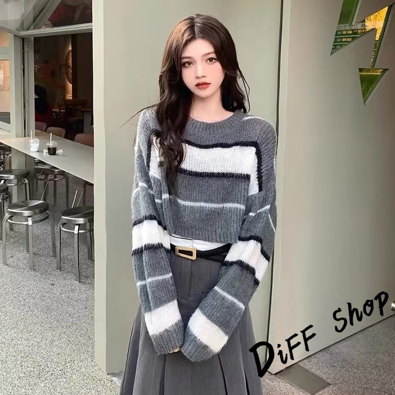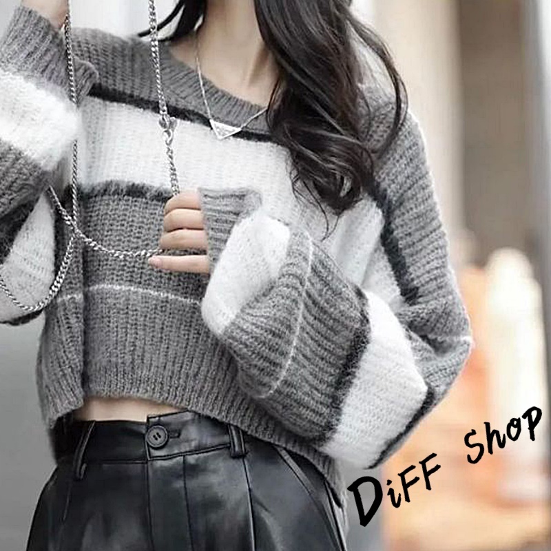 【DIFF】韓版條紋撞色拼接短版毛衣 針織上衣 長袖上衣 女裝 衣服 長袖t恤 保暖上衣 冬天女裝 秋冬女裝【W552】【W552】灰色DiFF shop