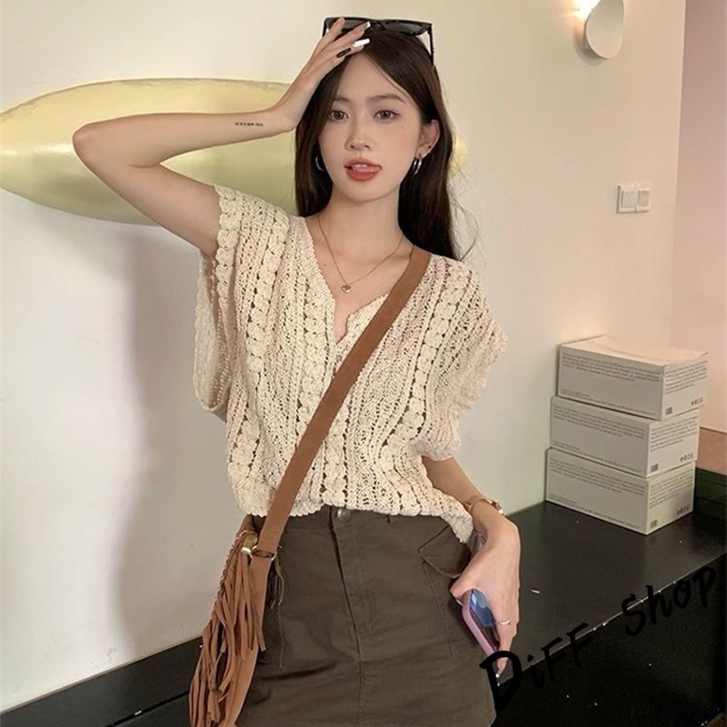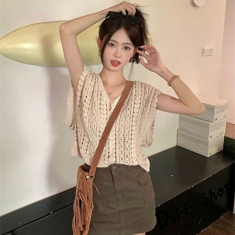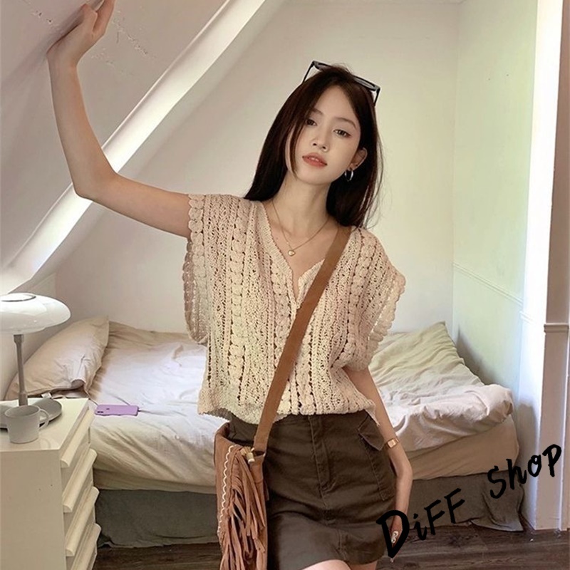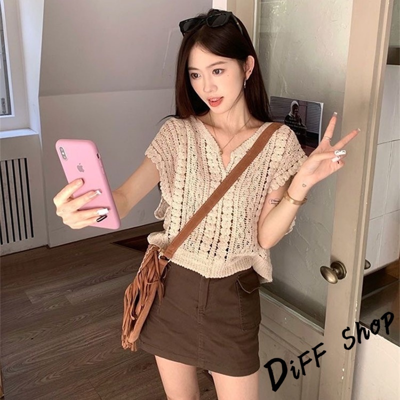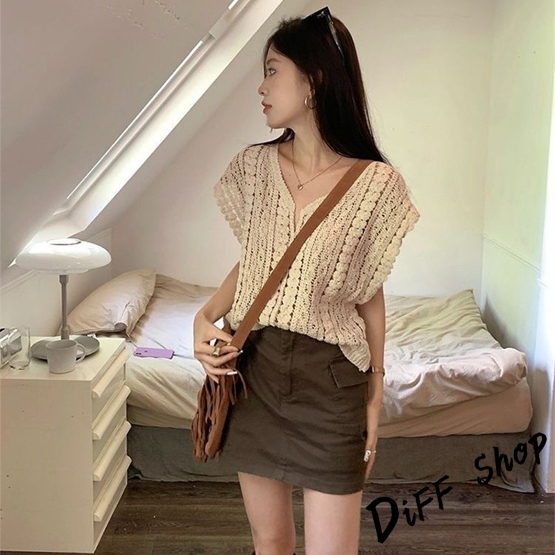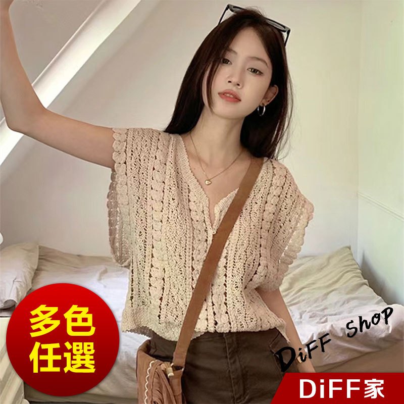 【DIFF】韓版鏤空鉤花V領疊穿針織背心 小可愛 女裝 衣服 短版上衣 小背心 夏天女裝 短袖上衣 罩衫【V299】【V299】杏色DiFF shop