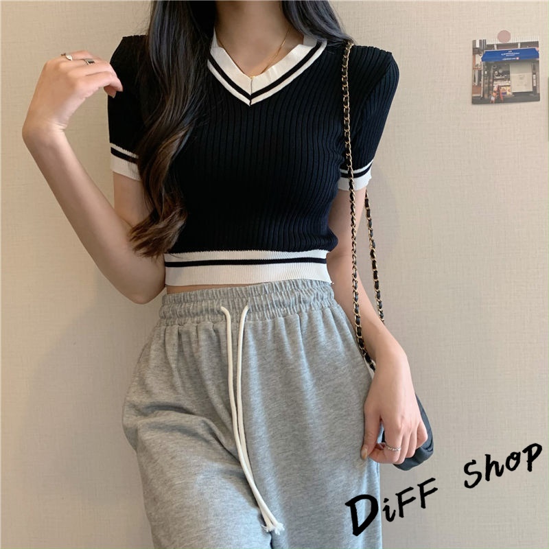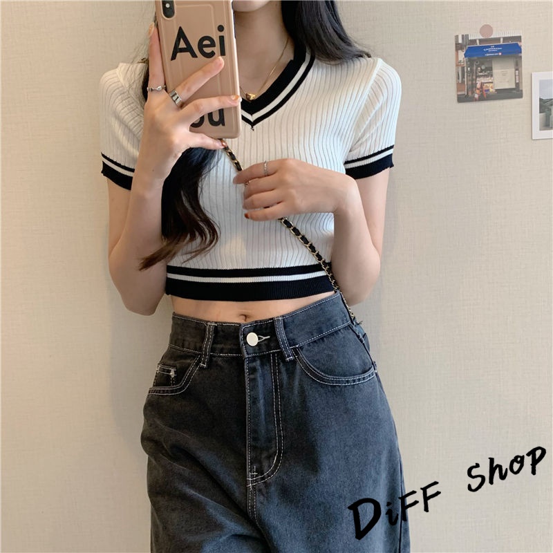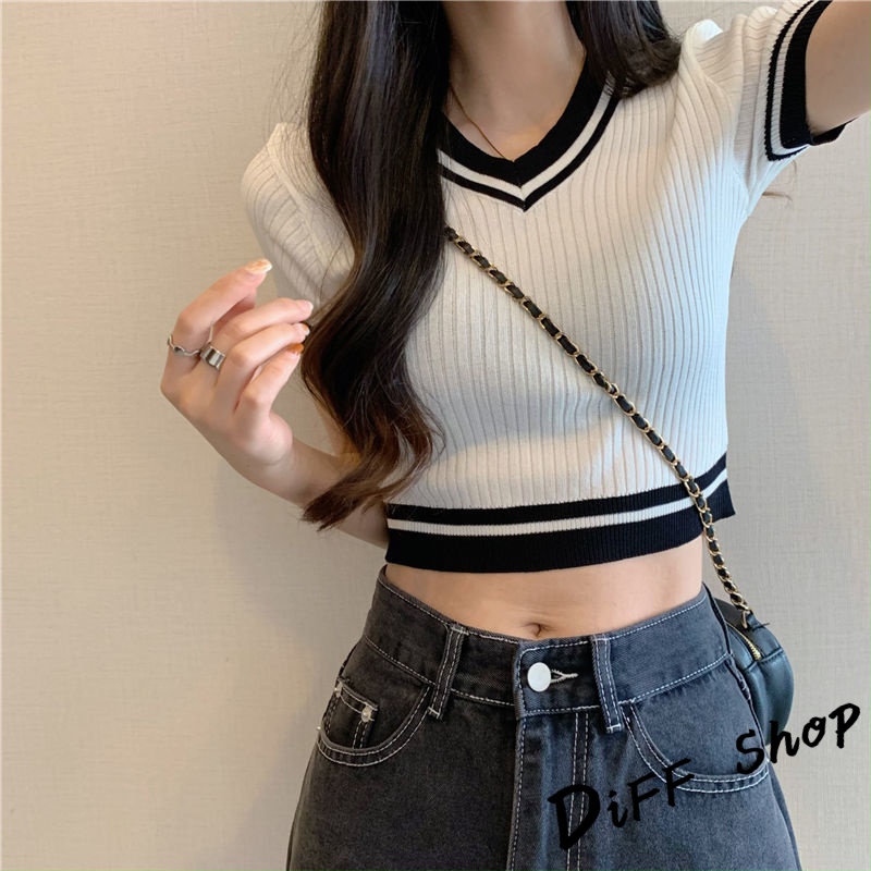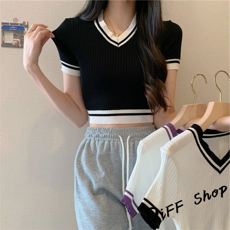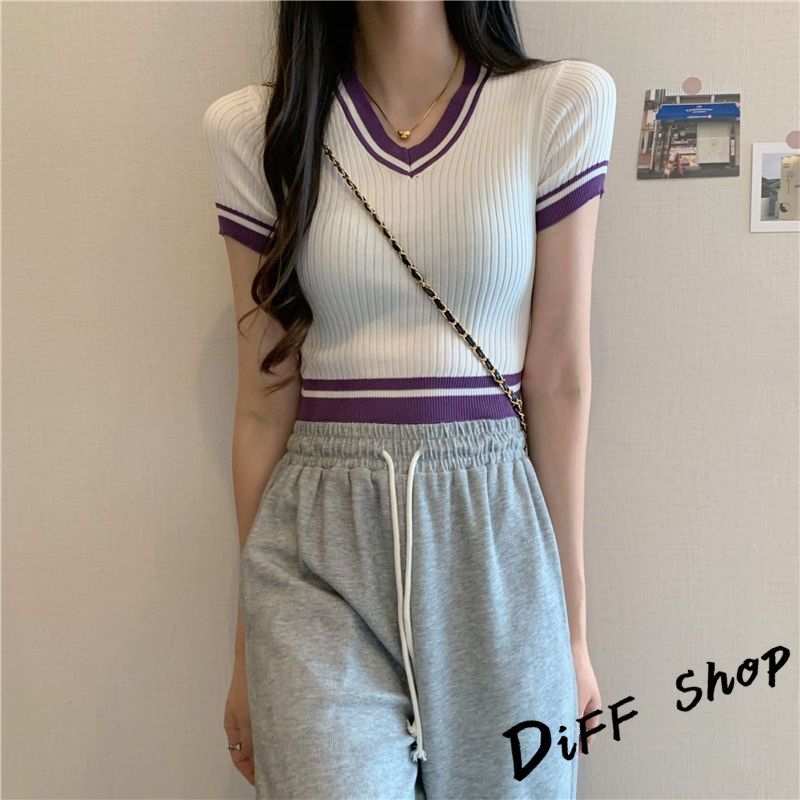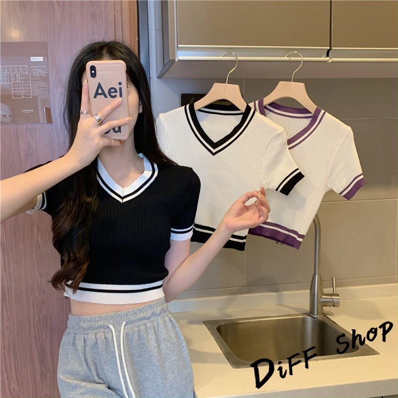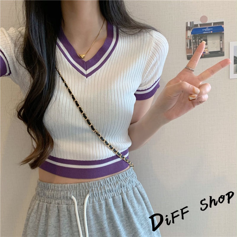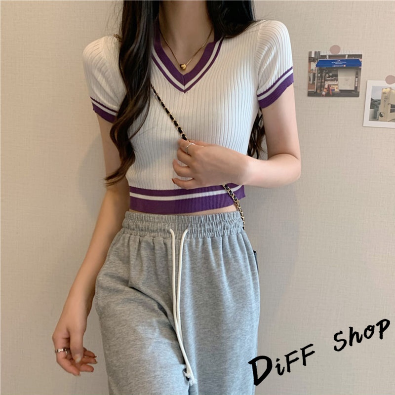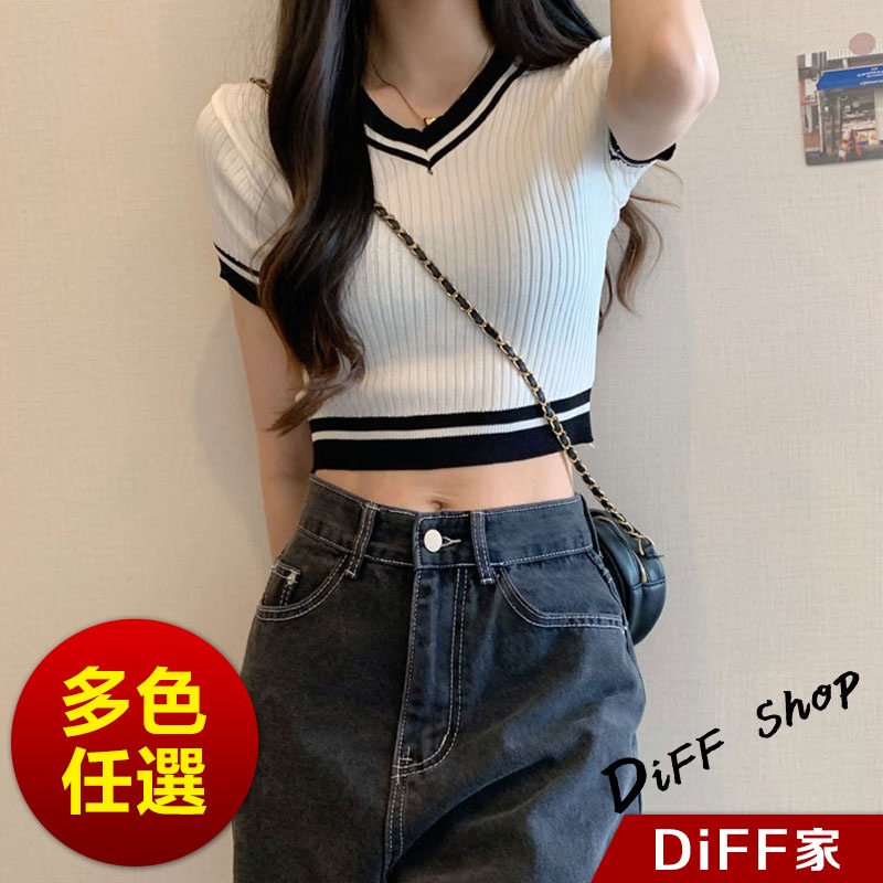 【DIFF】韓版復古V領針織短版上衣 短袖上衣 短袖t恤 女裝 顯瘦上衣 衣服 素T 短板上衣【T485】【T485】白色|【T485】紫色|【T485】黑色T-shirtsDiFF shop