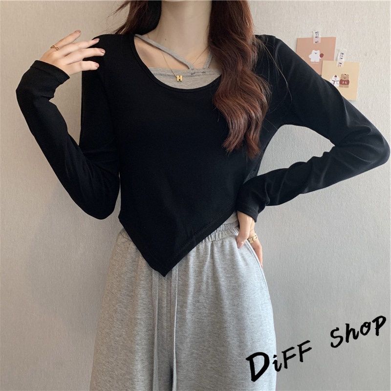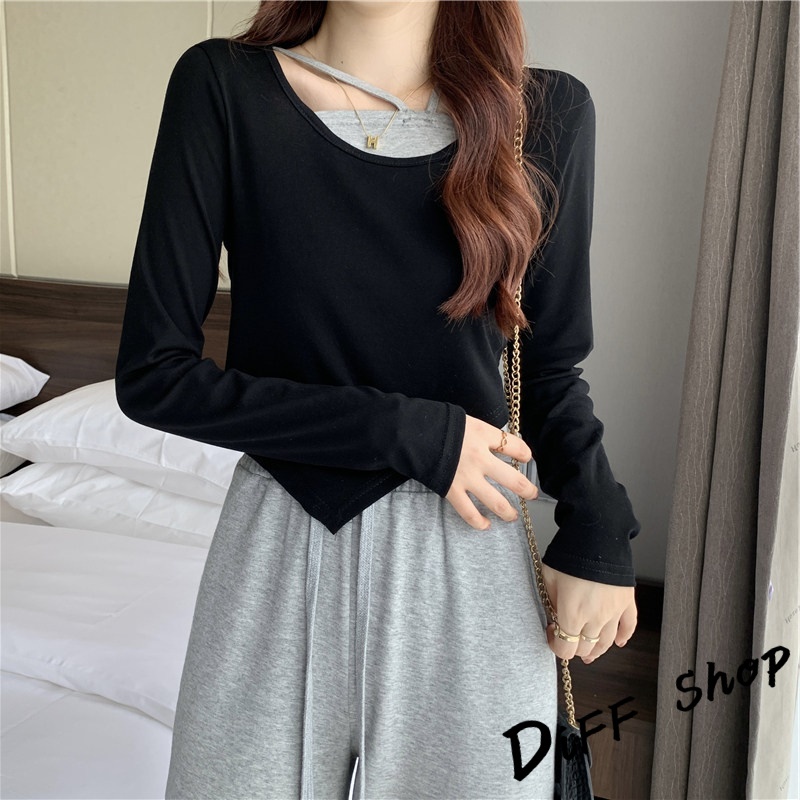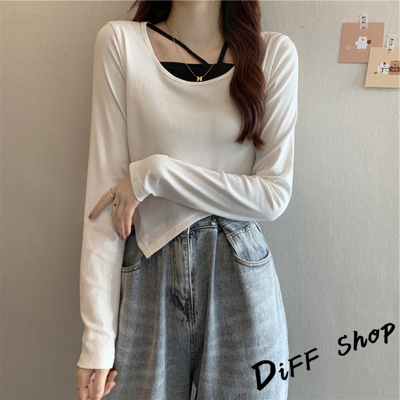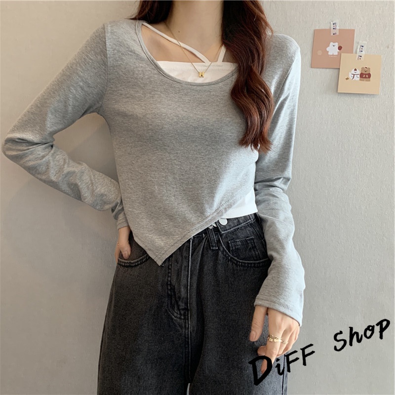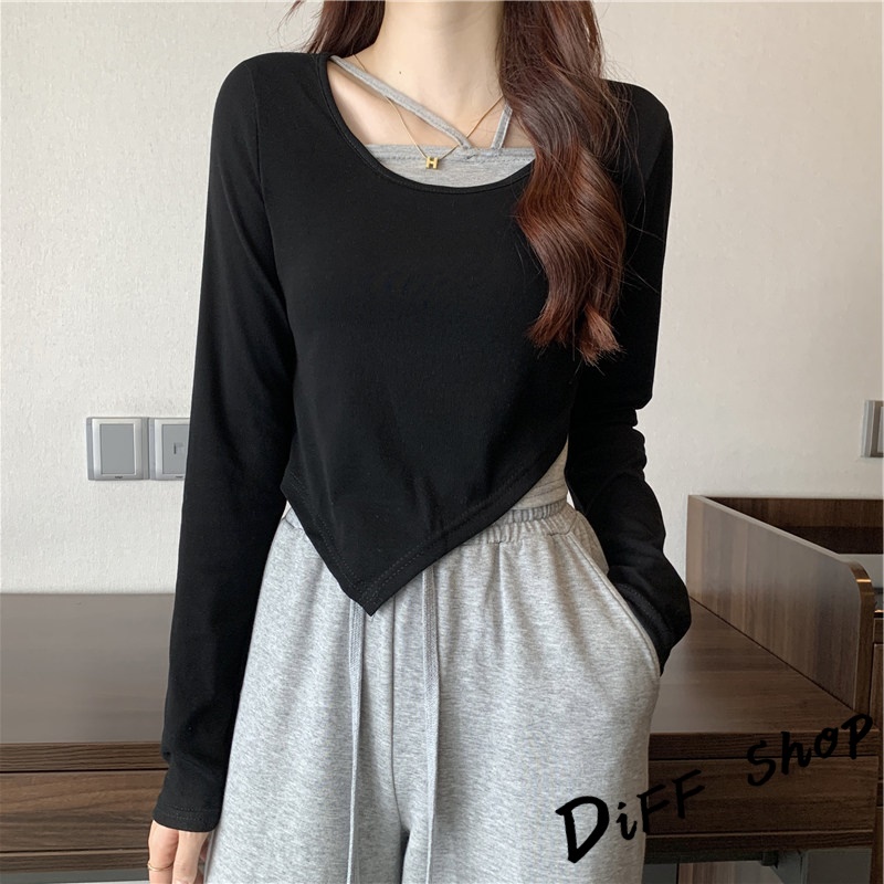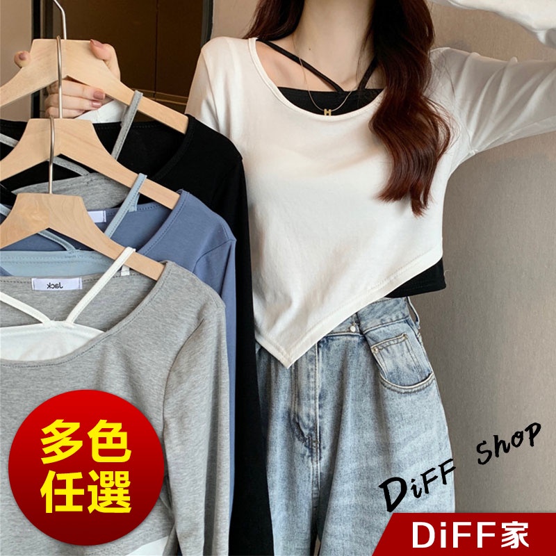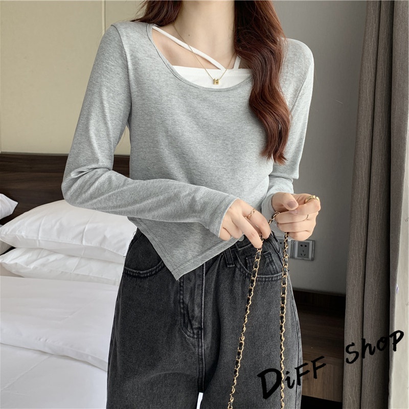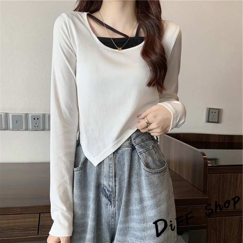 【DIFF】韓版慵懶風假兩件撞色不規則長袖上衣 女裝 衣服 寬鬆上衣 顯瘦上衣 長袖t恤 冬裝【W365】【W365】黑色|【W365】白色|【W365】灰色T-shirtsDiFF shop