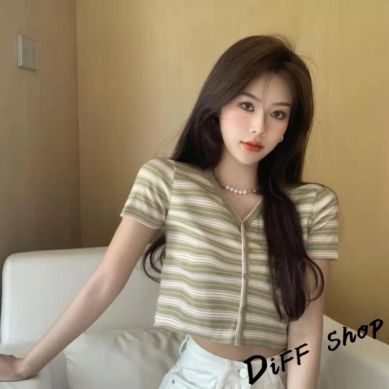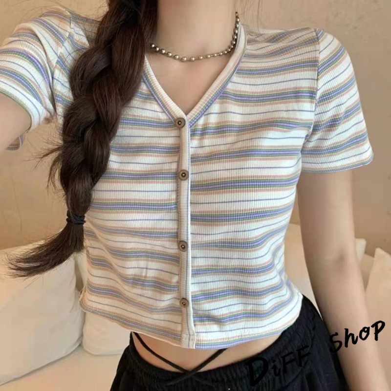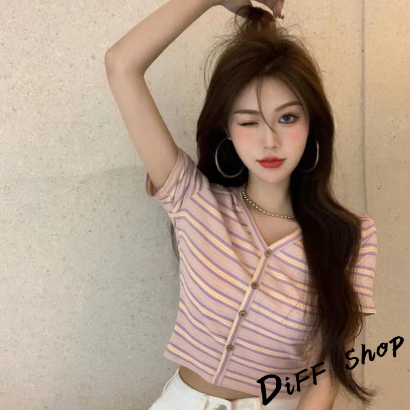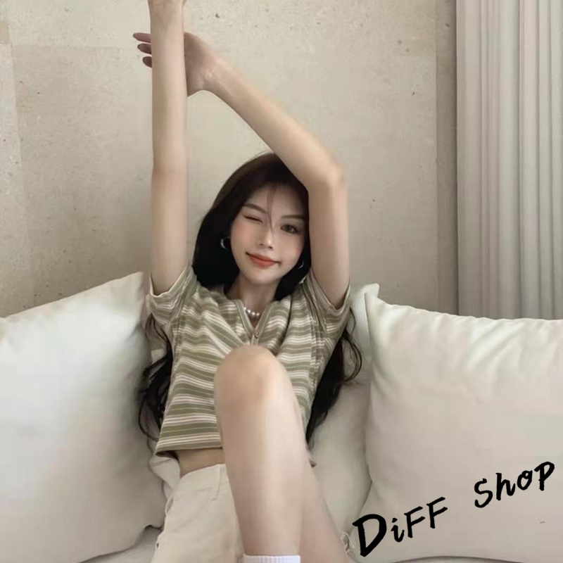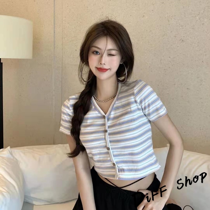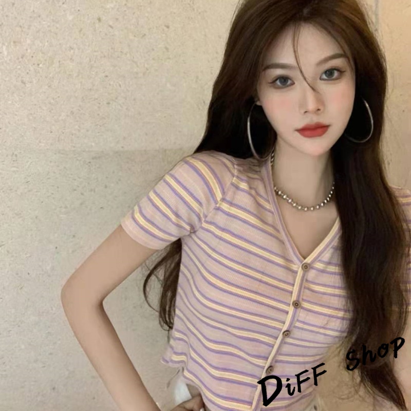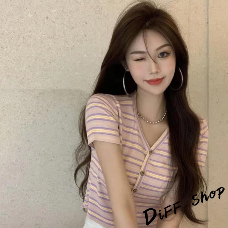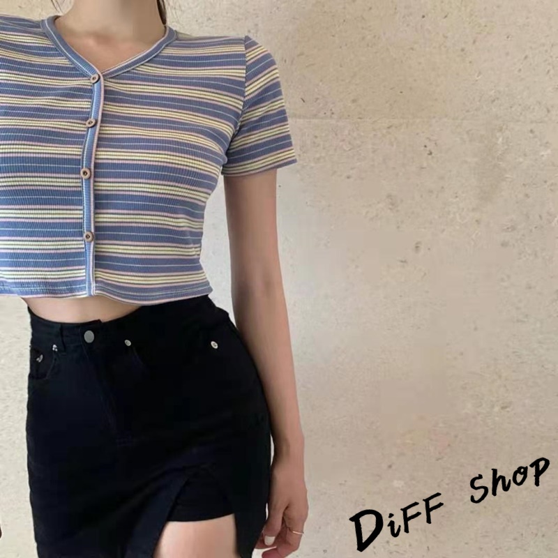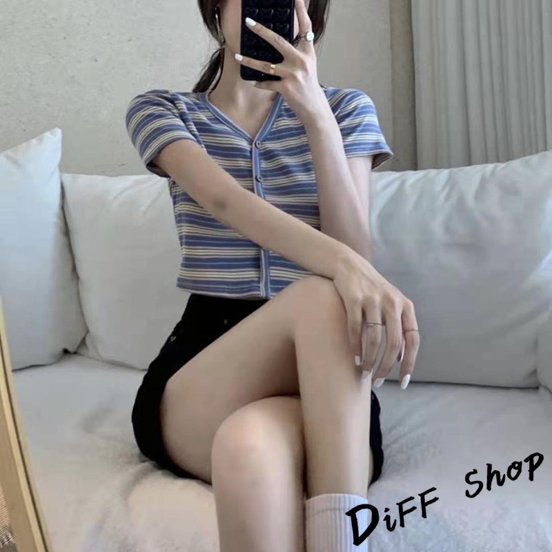 【DIFF】韓版小清新V領條紋短版上衣 條紋上衣 短袖上衣 短袖t恤 女裝 顯瘦上衣 衣服 短板上衣【T387】【T387】藍色|【T387】白色T-shirtsDiFF shop