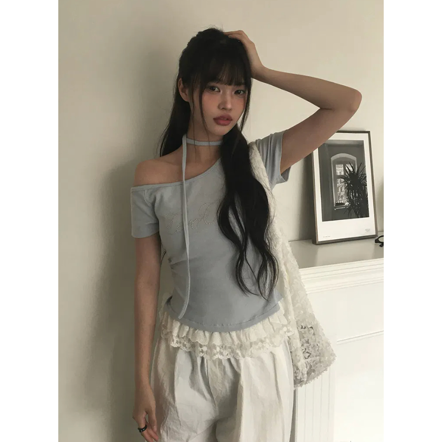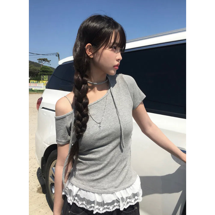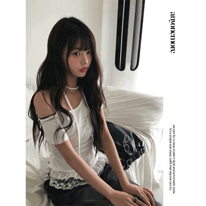 Codibook|韓國 anyonemore 蕾絲單肩吊帶短版T恤[預購]短袖上衣 T恤 女裝free,象牙白|free,天空藍|free,灰色|free,黑色T-shirtsCodibook 韓國女裝購物平台