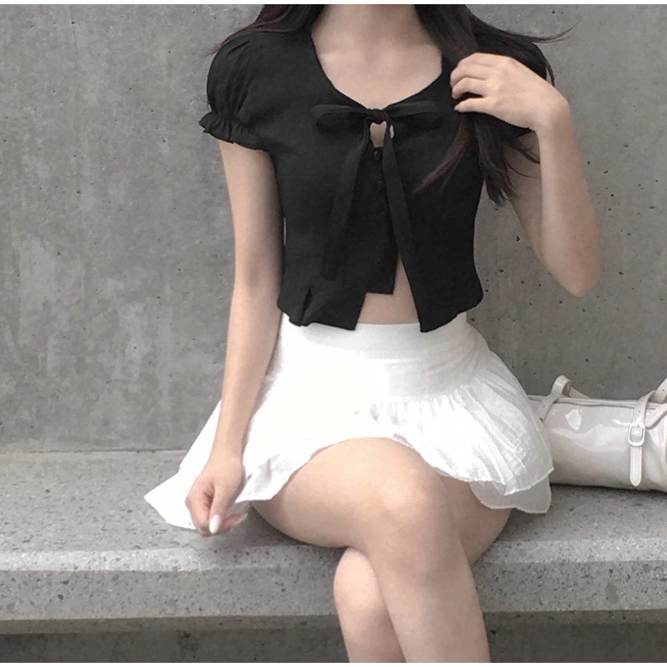 Codibook|韓國 J-BLIN 短版荷葉邊綁帶短袖襯衫[預購]雪紡襯衫 女裝白色|黑色Shirts & BlousesCodibook 韓國女裝購物平台