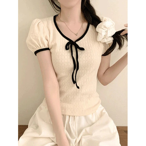 Codibook|韓國 peachmode U領拼色緞帶鏤空澎袖短版T恤[預購]短袖上衣 T恤 女裝象牙白,FREE|奶油色,FREE|黑色,FREET-shirtsCodibook 韓國女裝購物平台