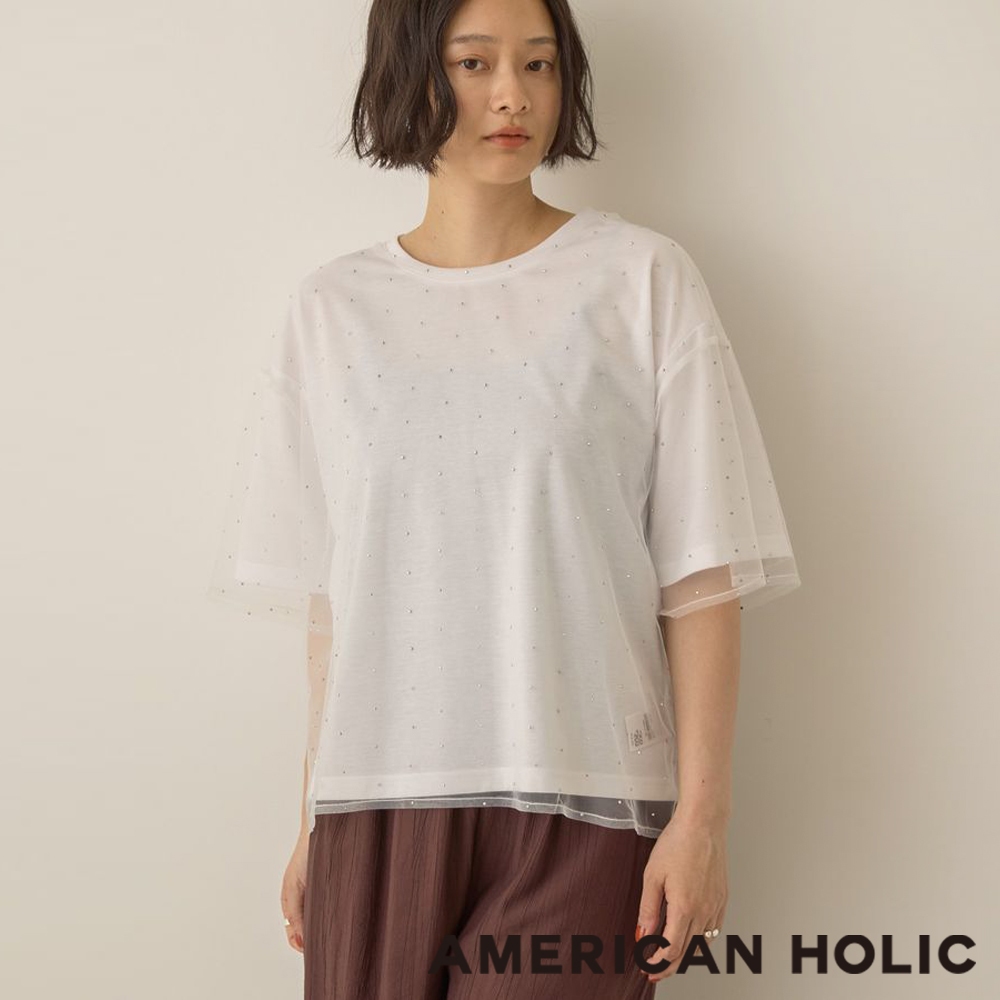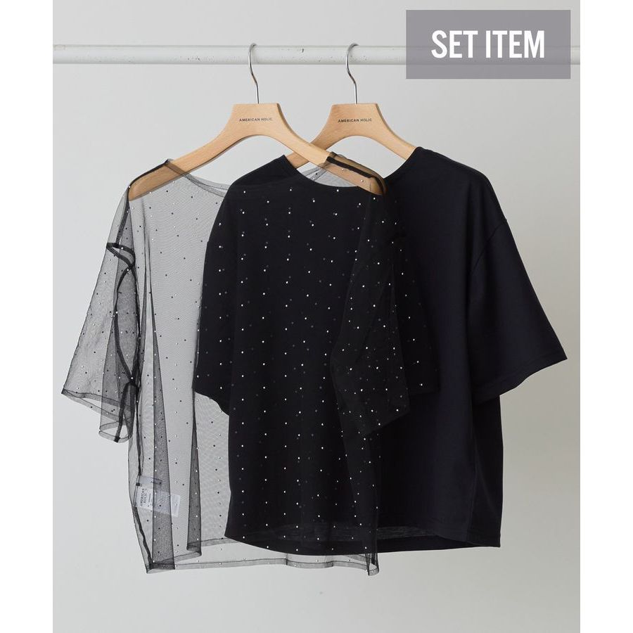 AMERICAN HOLIC 【SET ITEM】水鑽鑲嵌薄紗上衣+素面落肩T恤(0H000429700)本白M|本白L|黑色M|黑色LT-shirtsearth music&ecology Select Store