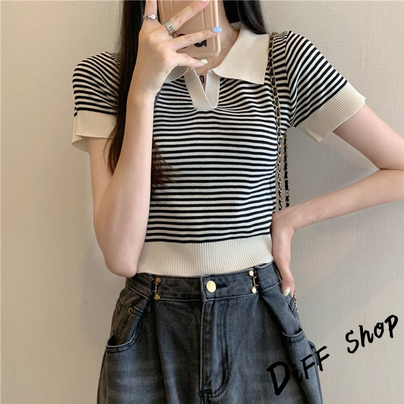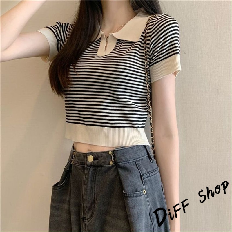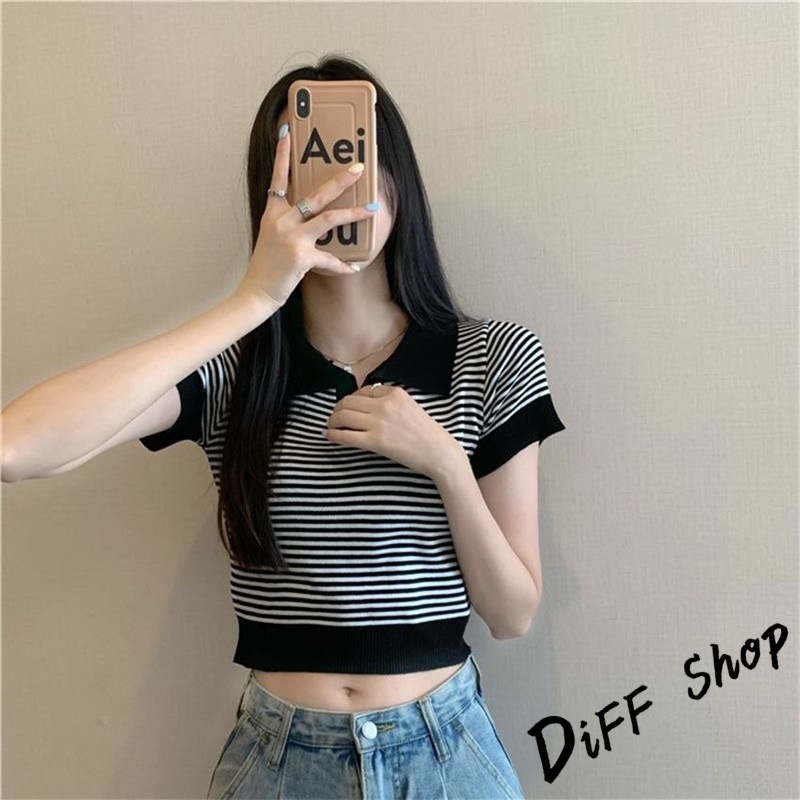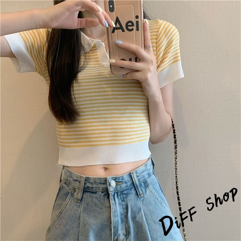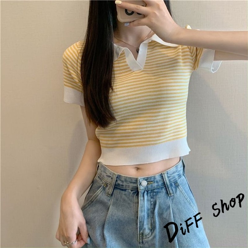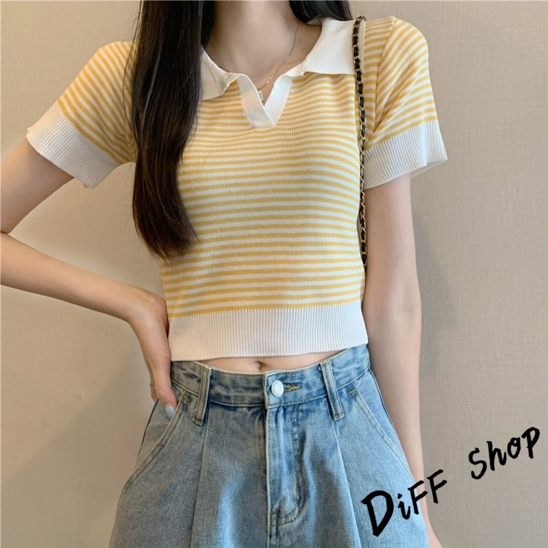 【DIFF】韓版條紋顯瘦短版上衣 針織上衣 短袖上衣 衣服 夏天女裝 短板上衣 短版t恤 女裝 短袖t恤女【T650】【T650】黃色|【T650】杏色|【T650】黑色Polo ShirtsDiFF shop