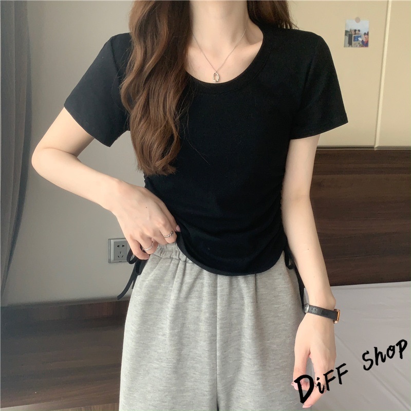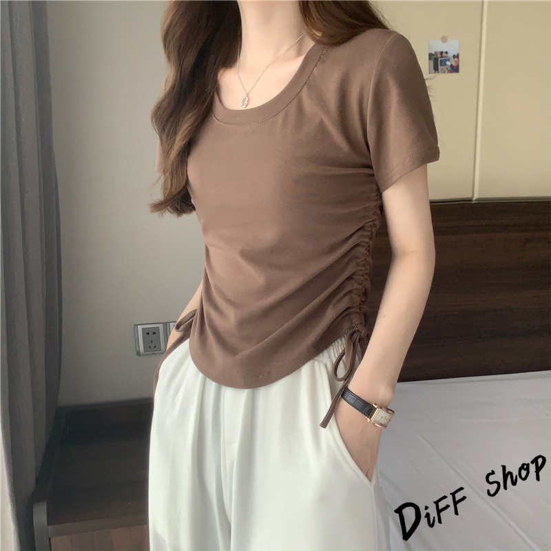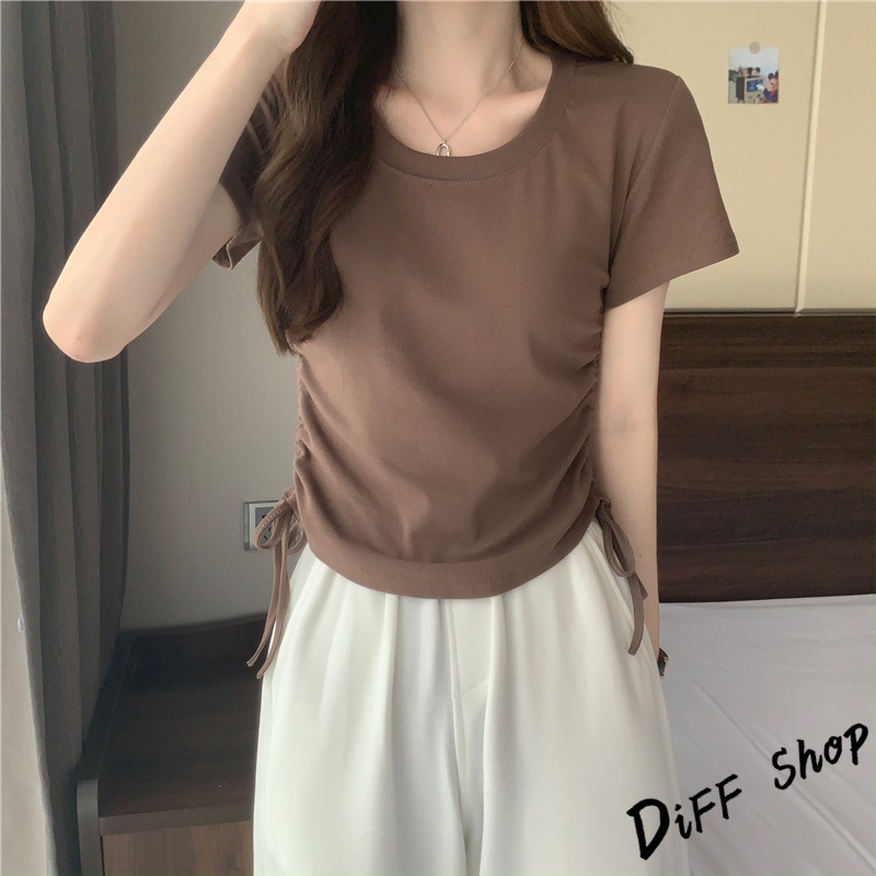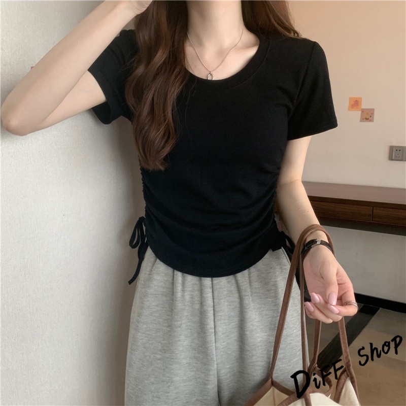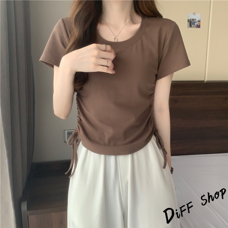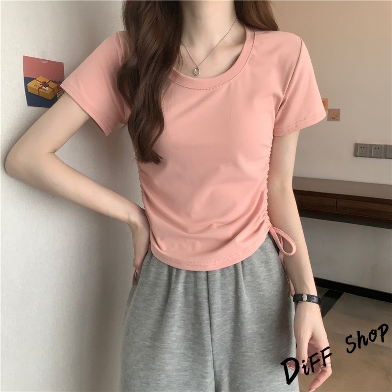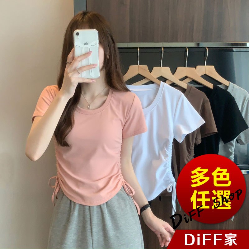 【DIFF】韓版設計感抽繩修身顯瘦短版上衣 短袖上衣 短袖t恤 女裝 顯瘦上衣 衣服 素T 短板上衣【T590】【T590】灰色|【T590】白色|【T590】黑色|【T590】粉色|【T590】咖色T-shirtsDiFF shop