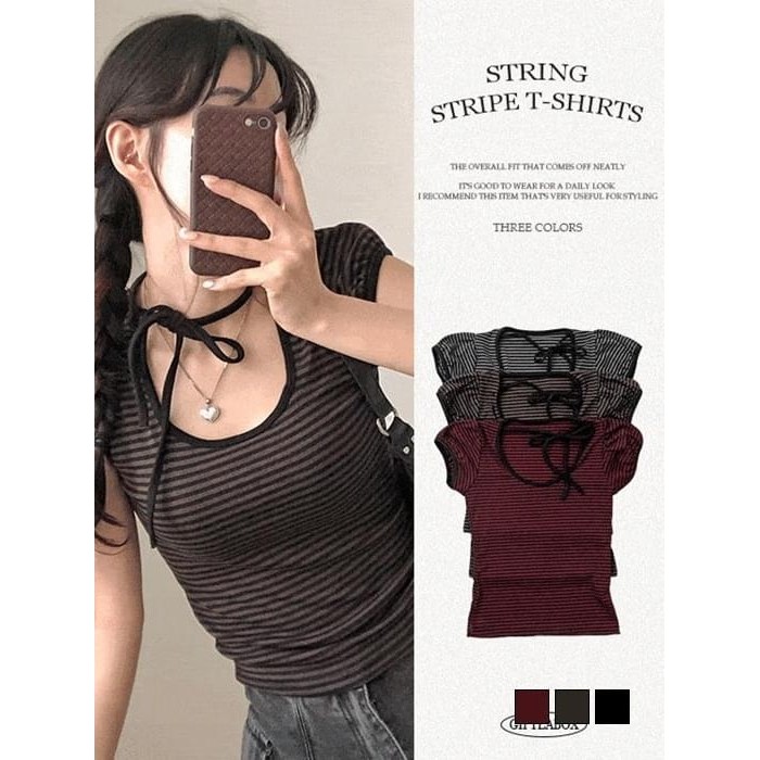 Codibook|韓國 gifteabox 綁帶條紋U領泡泡袖短版T恤[預購]短袖上衣 T恤 女裝紅酒,FREE|咖啡色,FREE|黑色,FREET-shirtsCodibook 韓國女裝購物平台