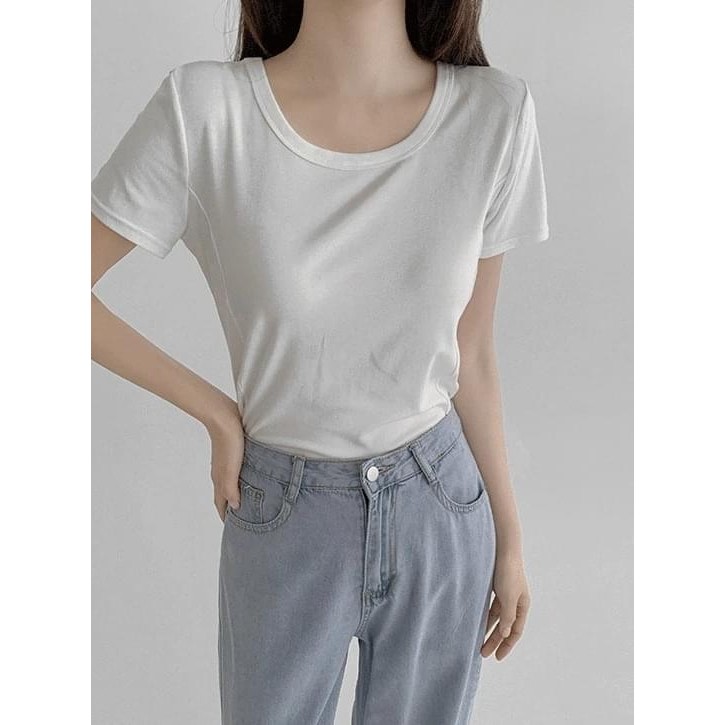 Codibook|韓國 Qnigirls 圓領方型剪裁柔軟棉質短袖T恤[預購]短袖上衣 女裝白色-Dani 著用|咖啡色|深灰色|黑色T-shirtsCodibook 韓國女裝購物平台