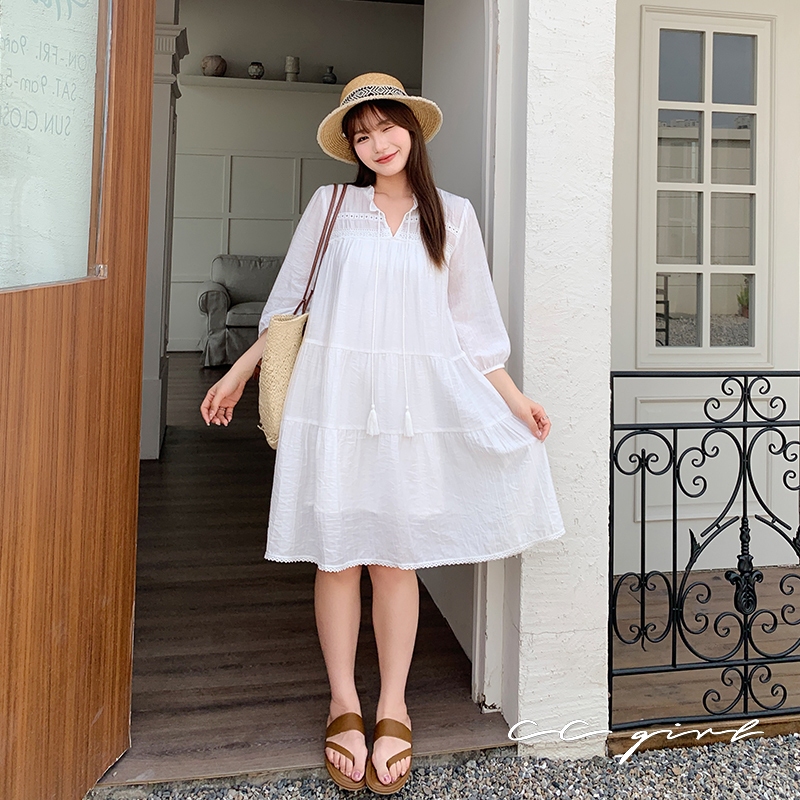 CCGIRL中大尺碼 浪漫微甜若隱若現鏤空微透感蕾絲花邊領流蘇繫帶洋裝-適L~5L《32178》大尺碼女裝 中大尺碼洋裝