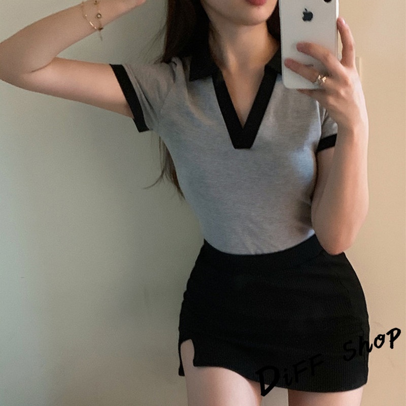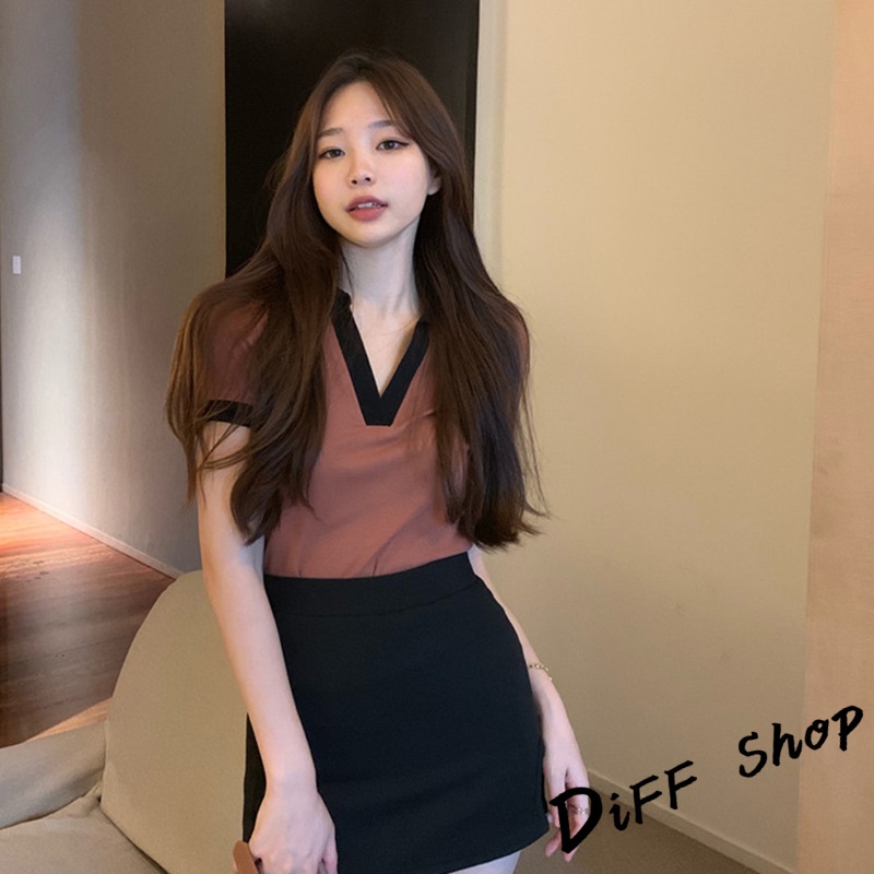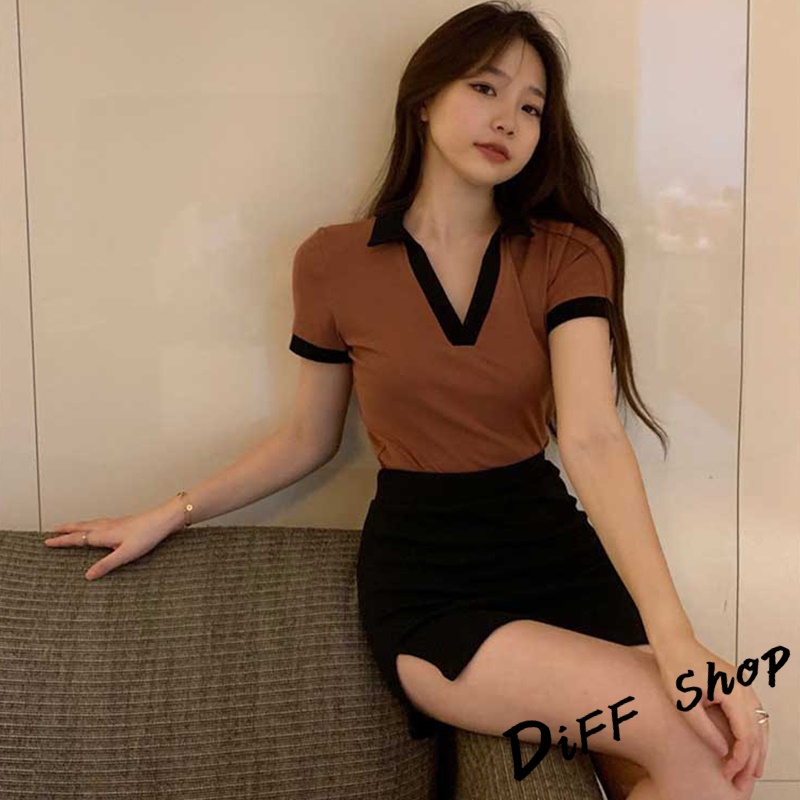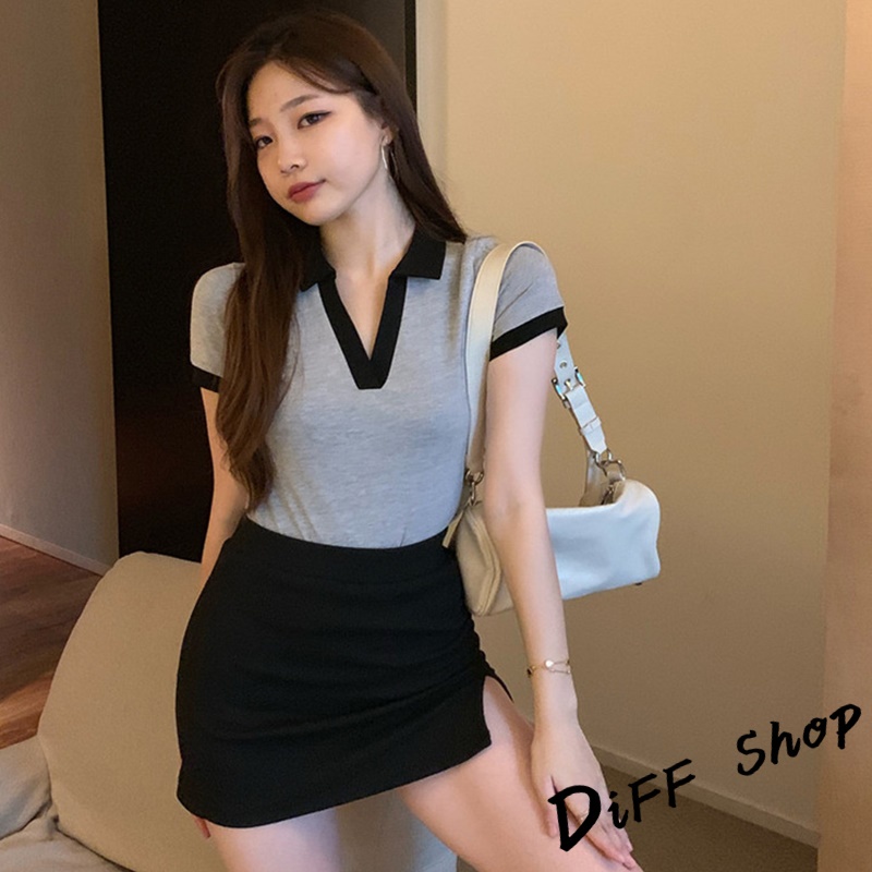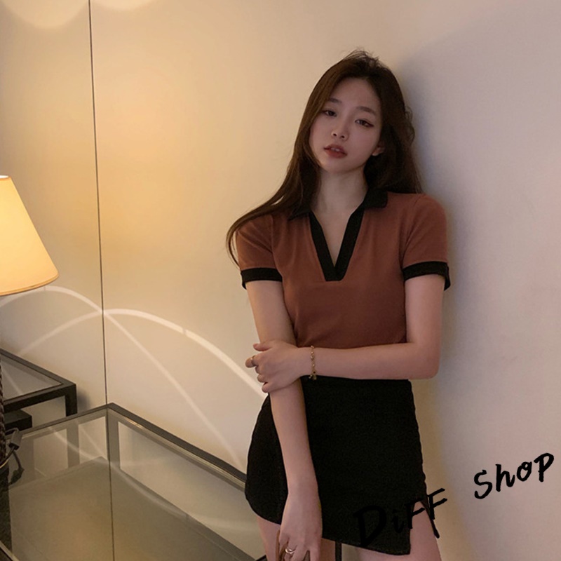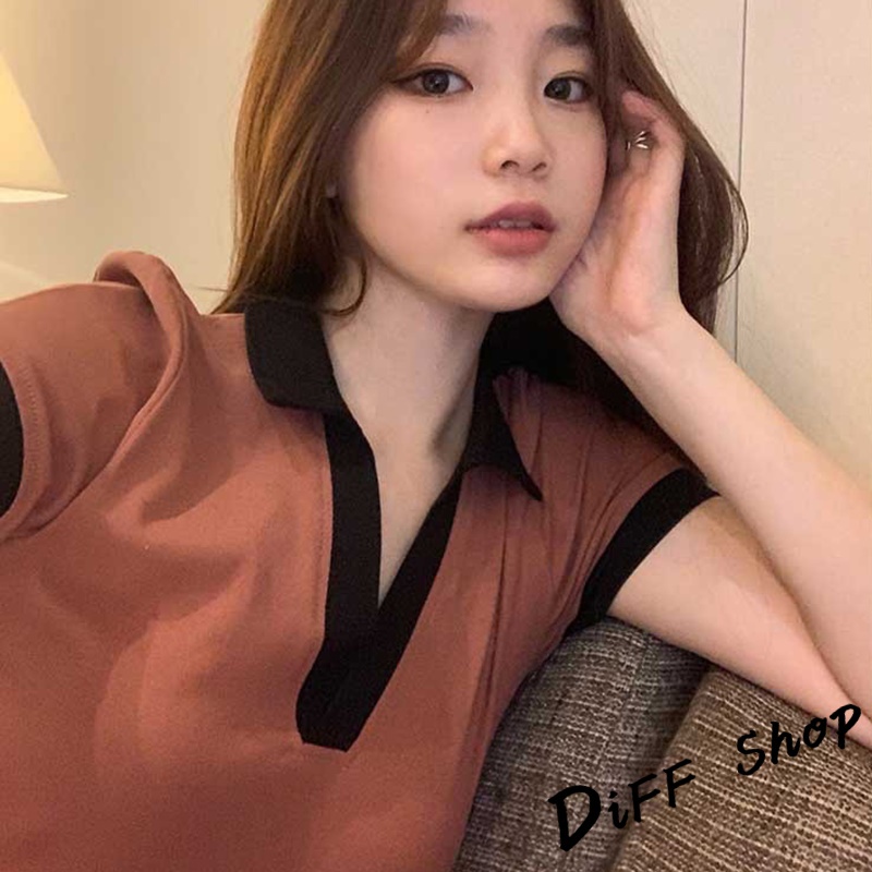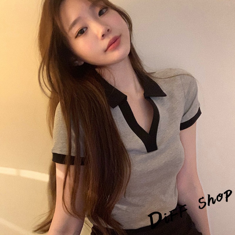 【DIFF】韓版撞色翻領設計感小眾短版上衣 短袖上衣 短袖t恤 女裝 顯瘦上衣 衣服素T 短板上衣【T449】【T449】灰色|【T449】咖啡T-shirtsDiFF shop