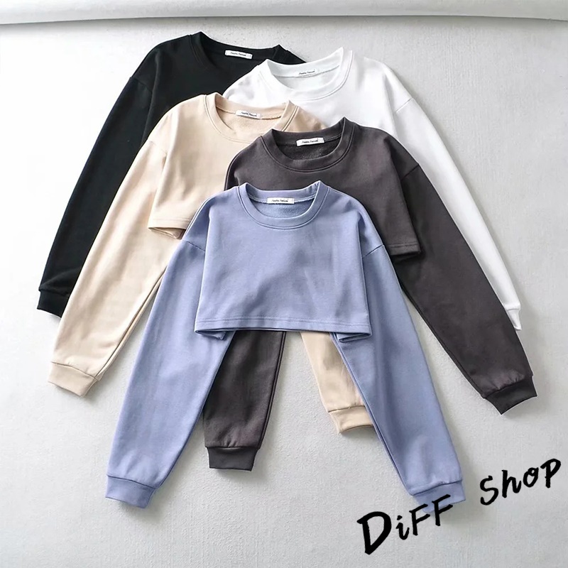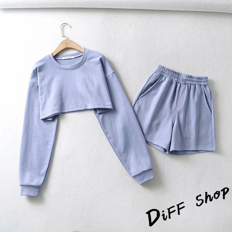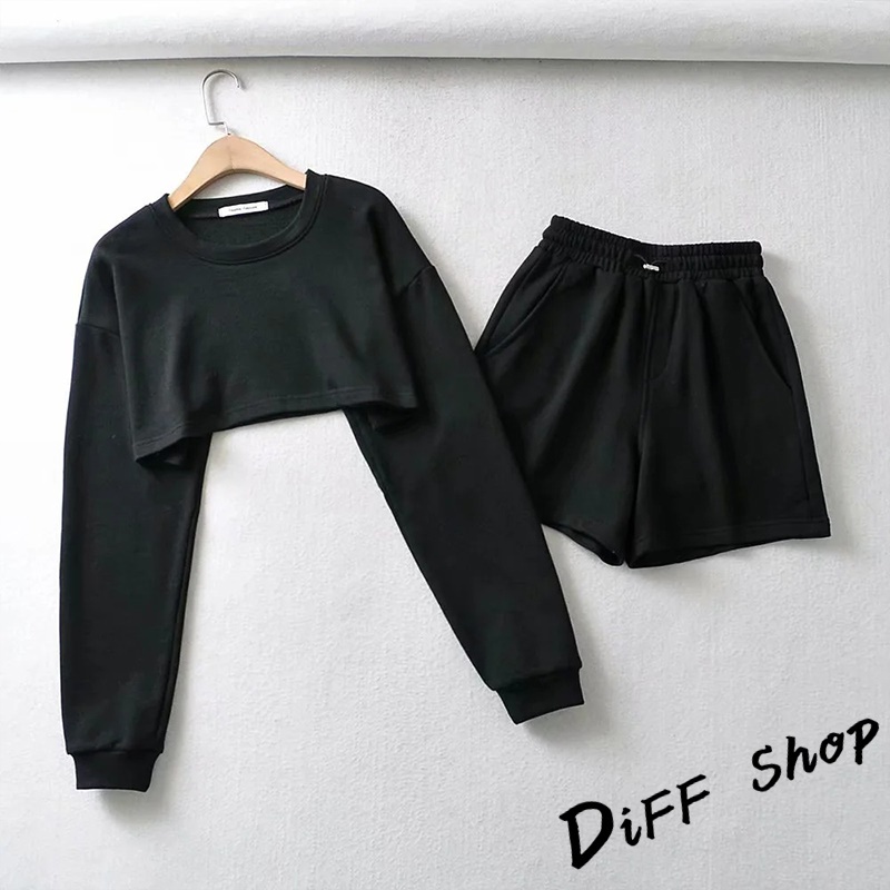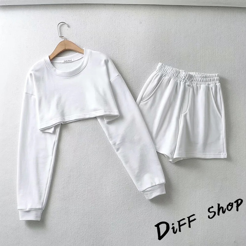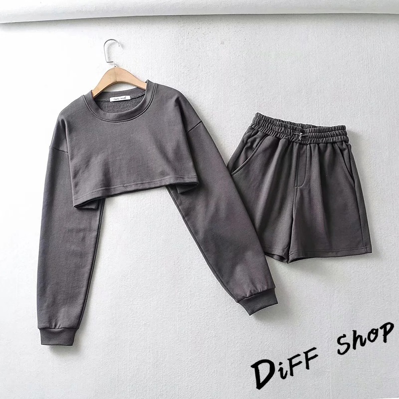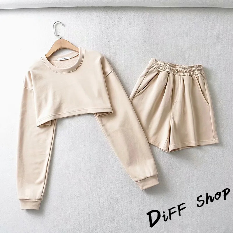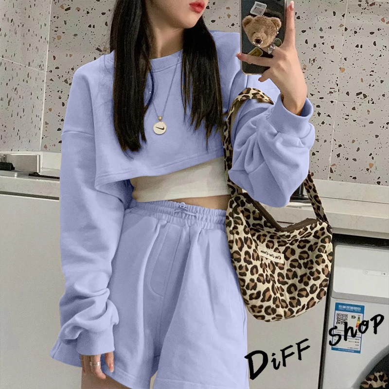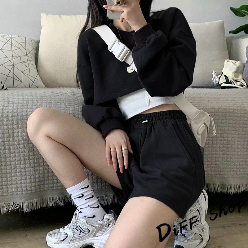 【DIFF】韓版寬鬆短版運動套裝 運動上衣 短版上衣 長袖上衣 女裝 衣服 寬鬆上衣 長袖t恤 短褲 褲子【S229】【S229】白色|【S229】藍色|【S229】杏色|【S229】黑色|【S229】深灰Individual SetsDiFF shop