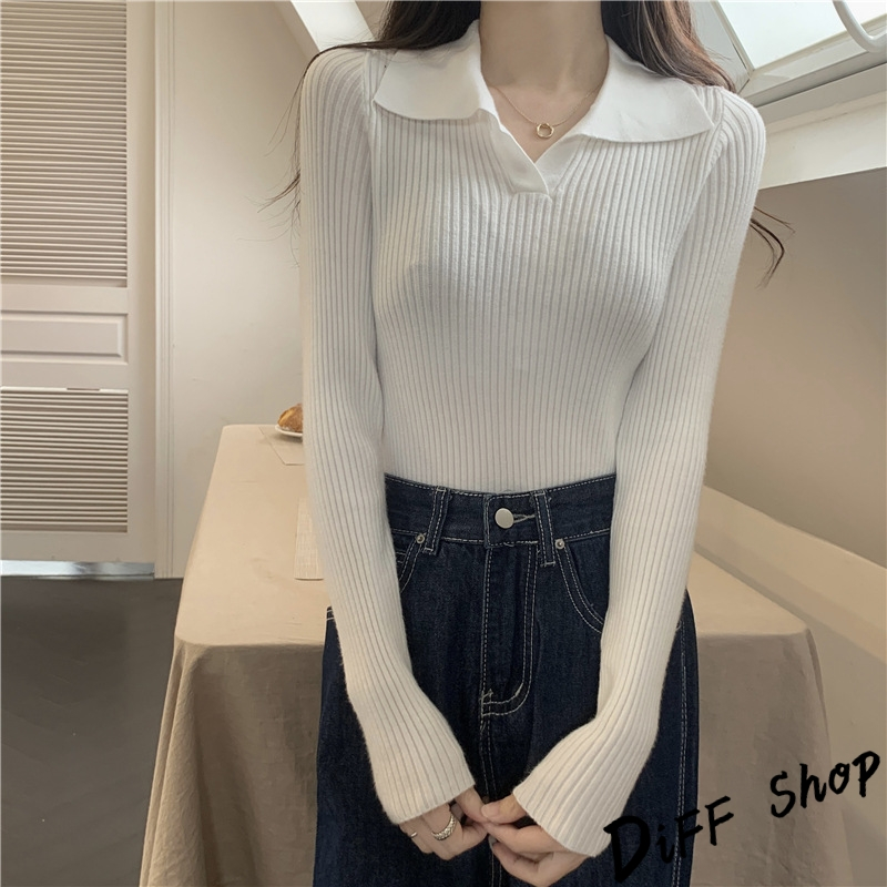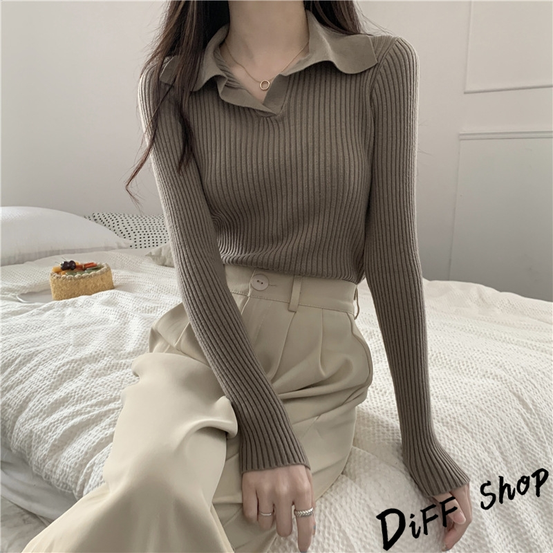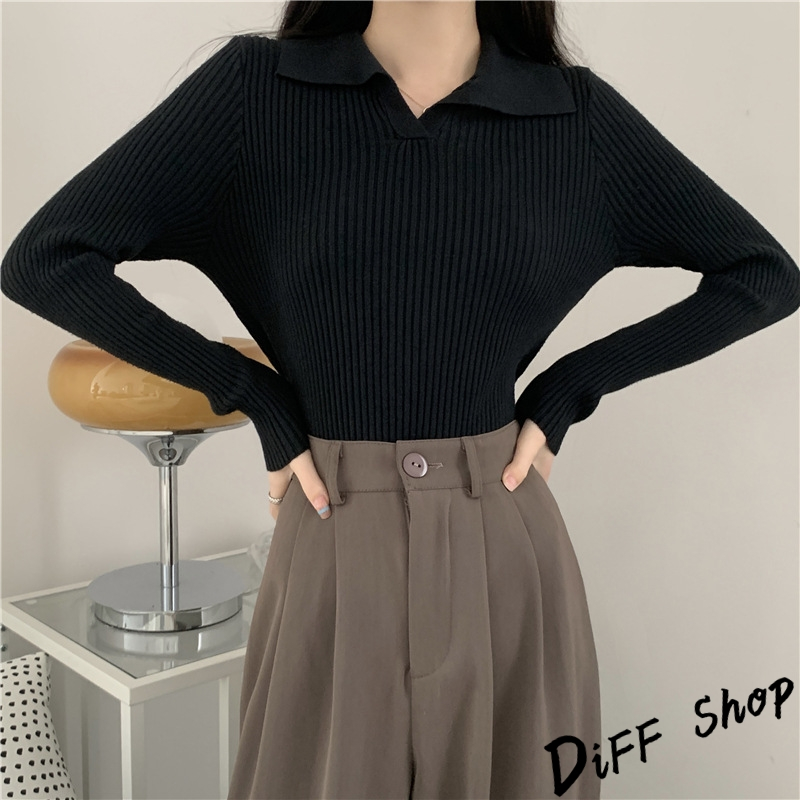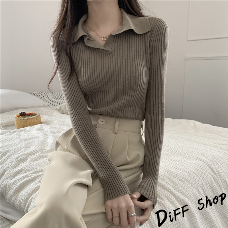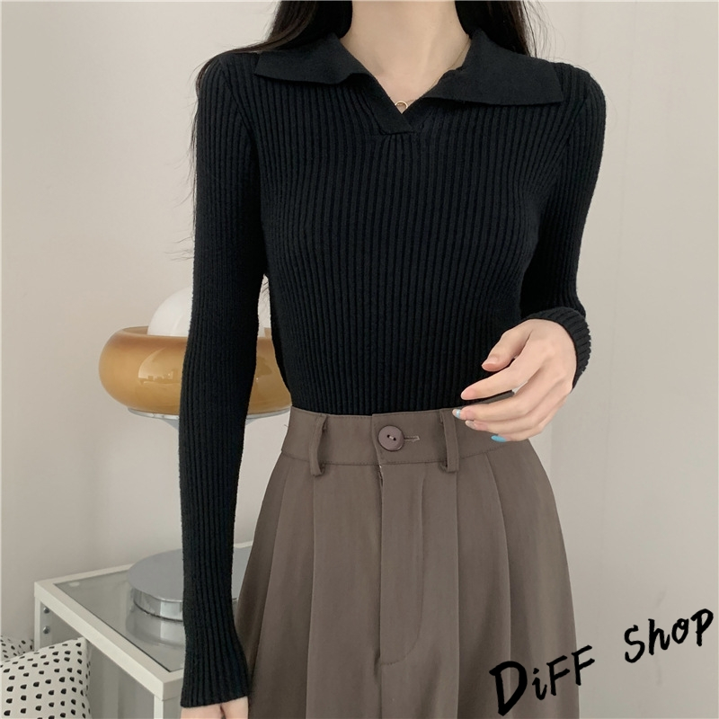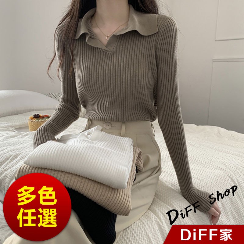 【DIFF】韓版法式別緻翻領顯瘦針織上衣 長袖上衣 女裝 衣服 寬鬆上衣 顯瘦上衣 長袖t恤【W482】【W482】黑色|【W482】白色|【W482】杏色|【W482】卡其色Polo ShirtsDiFF shop