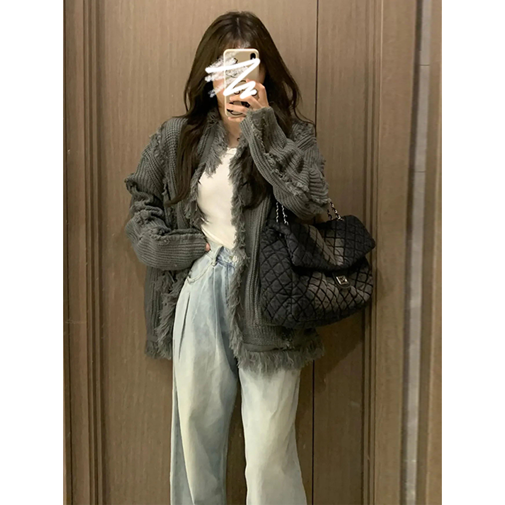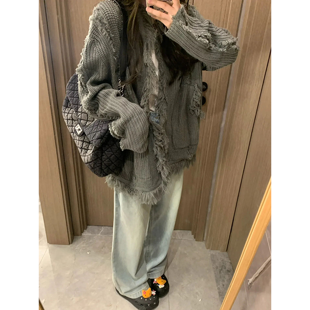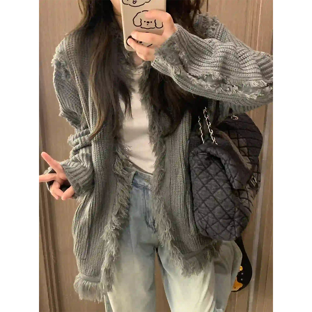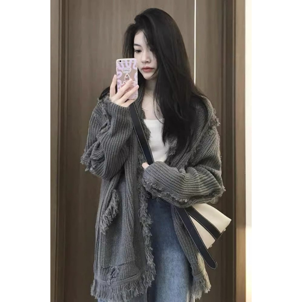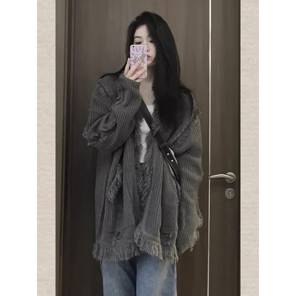CHAOO 針織 針織外套 毛衣 慵懶風 薄 針織外套 流蘇 氣質上衣 寬鬆上衣 针织毛衣 寬鬆外套 針織開衫 素色灰色,均碼|灰色【優質版】,均碼CHAOO 台北原創服飾品牌