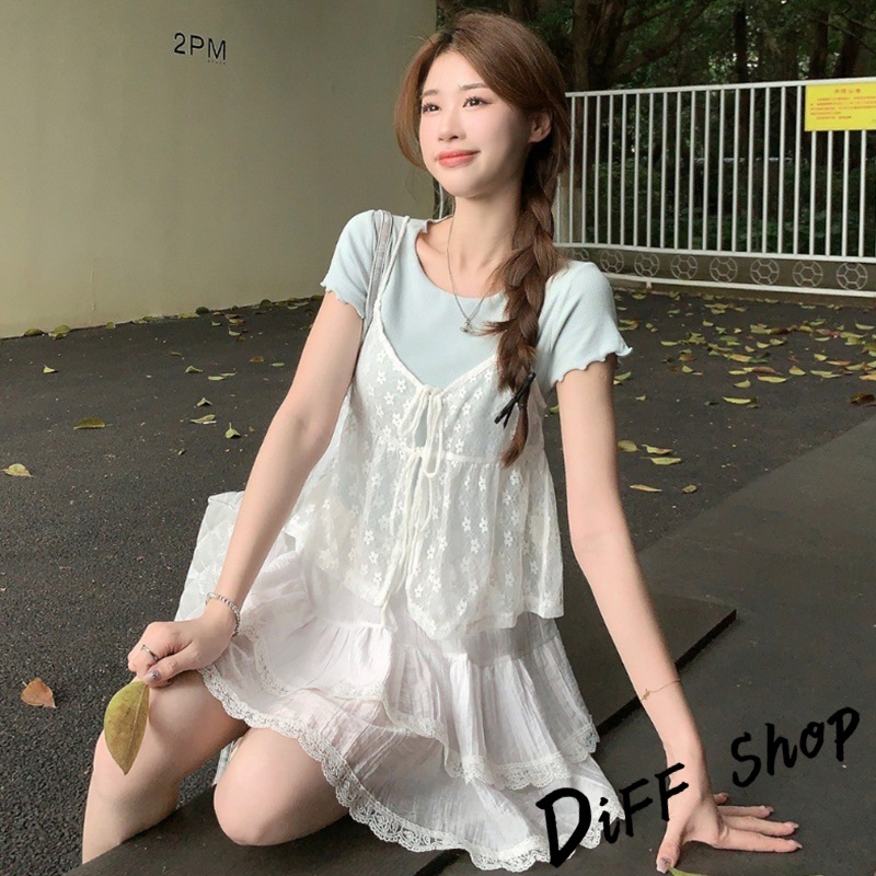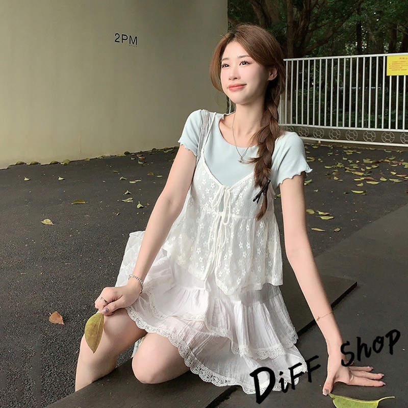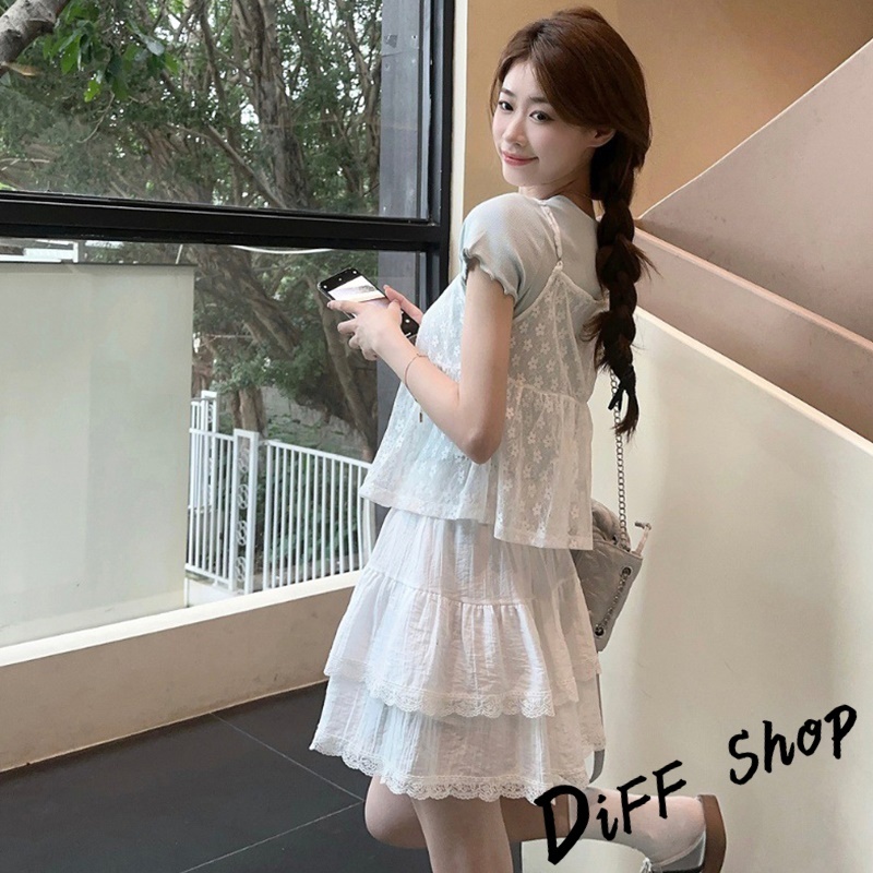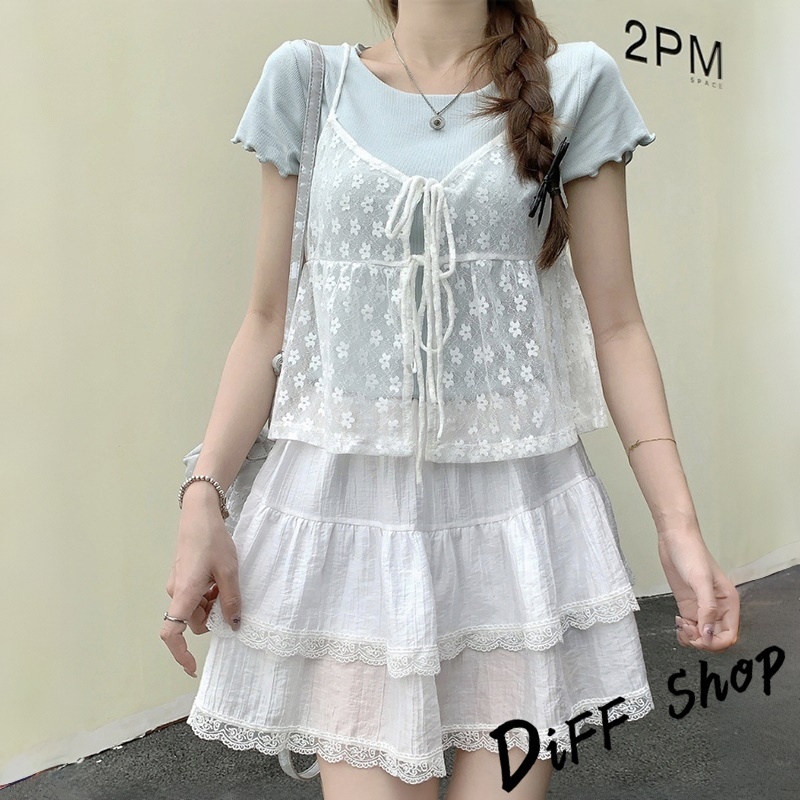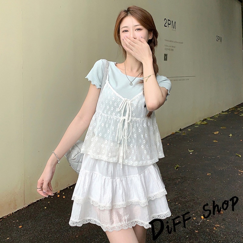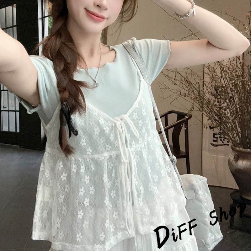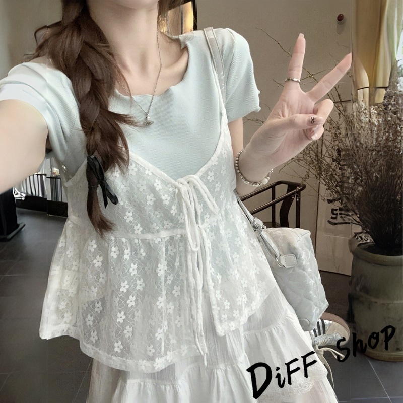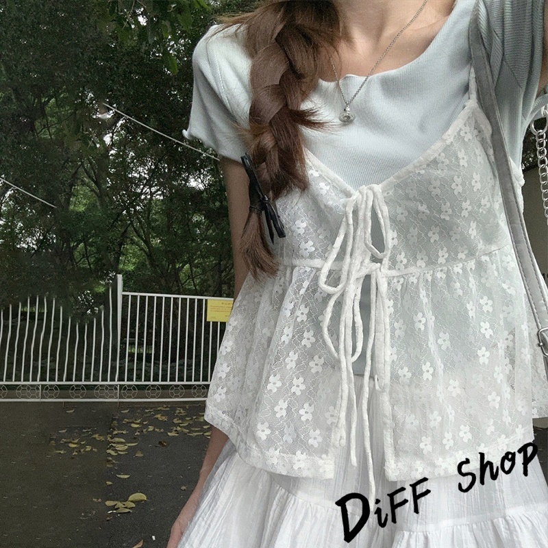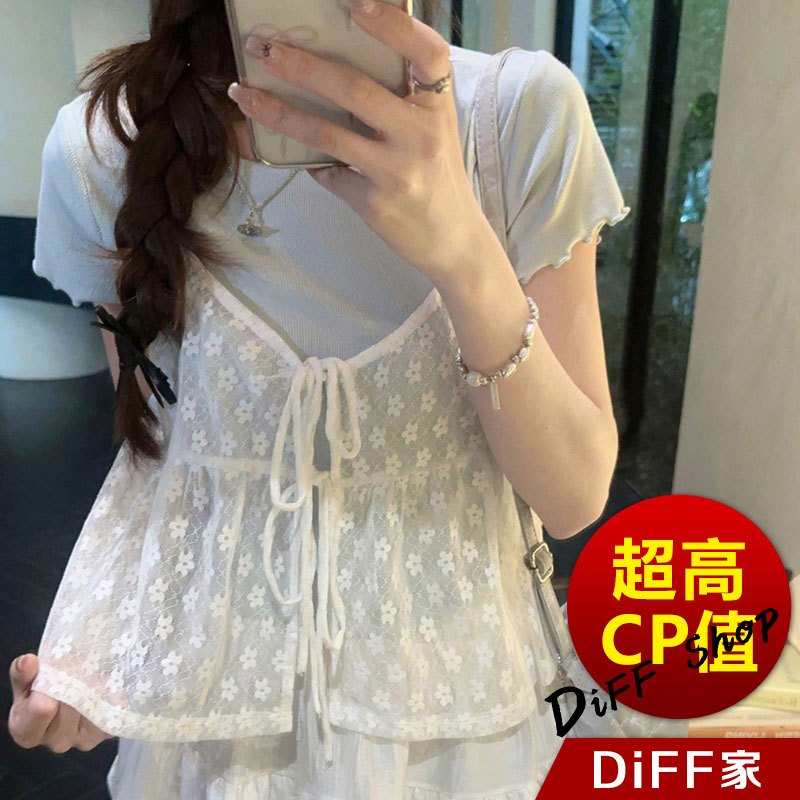 【DIFF】韓版蕾絲網紗疊穿背心 小可愛 女裝 衣服 短版上衣 夏天女裝 薄外套 罩衫 蕾絲外套 T614【V379】【V379】背心白色|【T614】上衣藍色Individual SetsDiFF shop