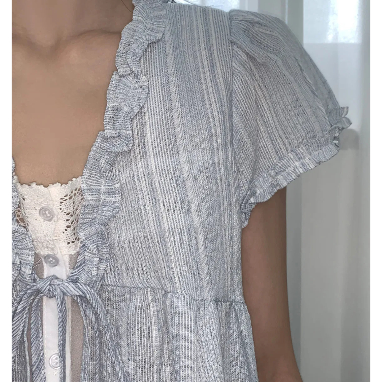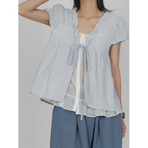 Codibook|韓國 EEZEE 直條紋荷葉短袖襯衫套裝SH015[預購]雪紡襯衫 女裝深藍色,Free|天空藍,FreeShirts & BlousesCodibook 韓國女裝購物平台