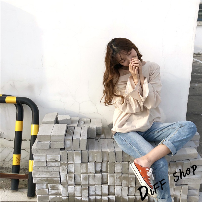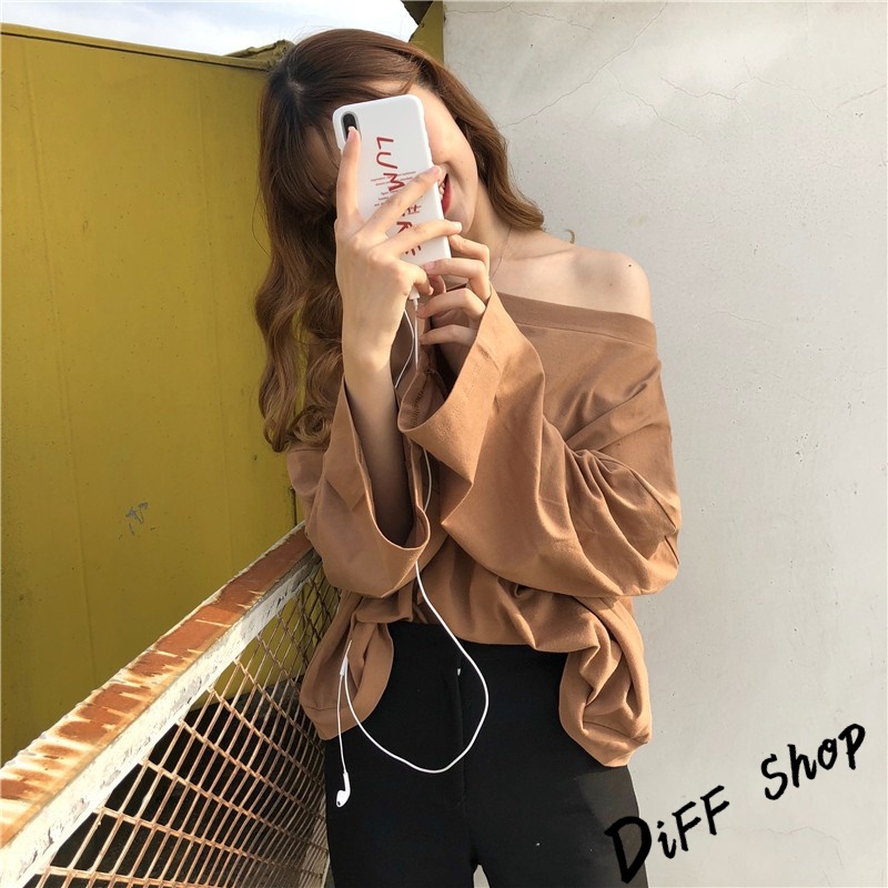 【DIFF】韓版寬鬆一字領露肩平口長袖上衣 長袖上衣 女裝 衣服 寬鬆上衣 顯瘦上衣 長袖t恤 冬裝【W347】【W347】卡其|【W347】杏色T-shirtsDiFF shop