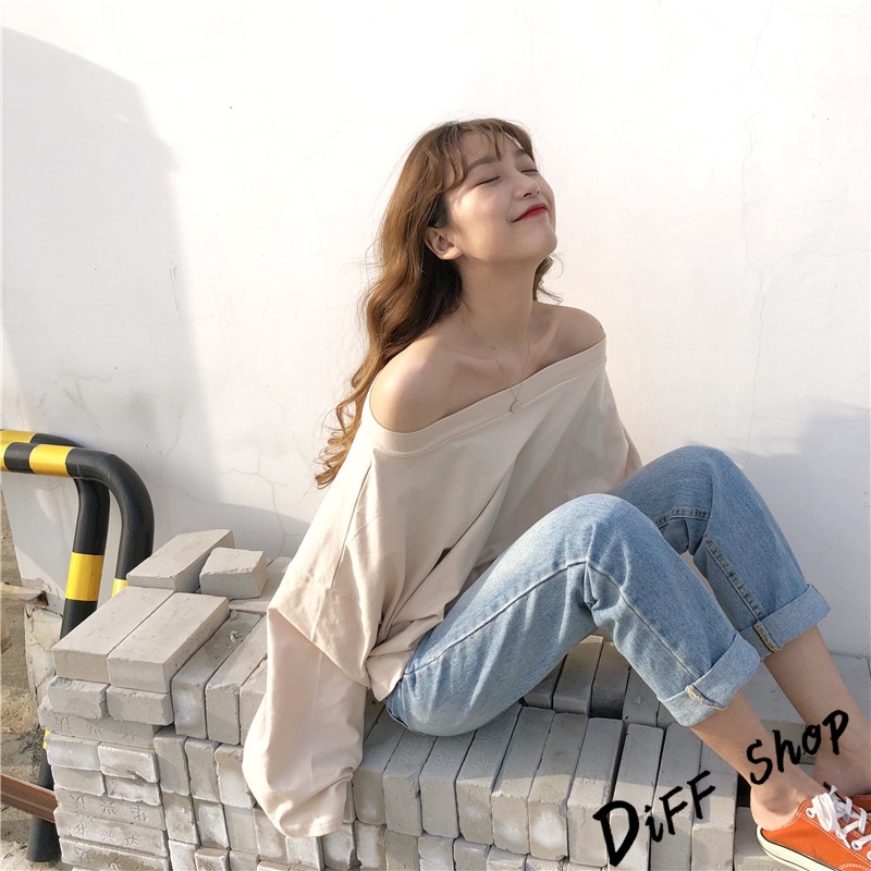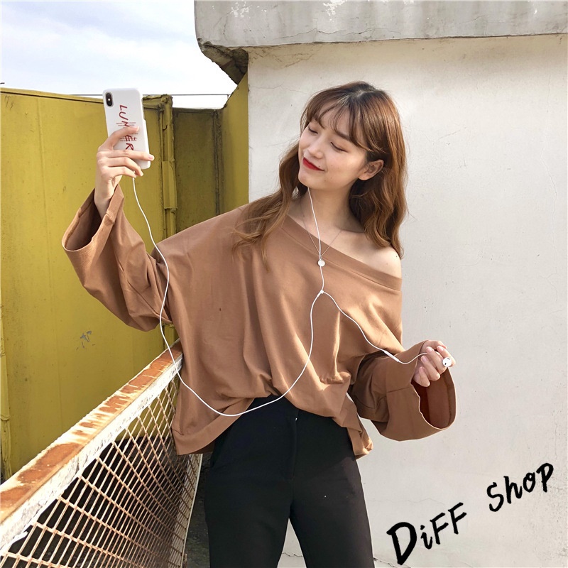 【DIFF】韓版寬鬆一字領露肩平口長袖上衣 長袖上衣 女裝 衣服 寬鬆上衣 顯瘦上衣 長袖t恤 冬裝【W347】