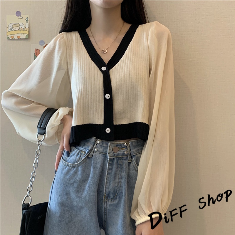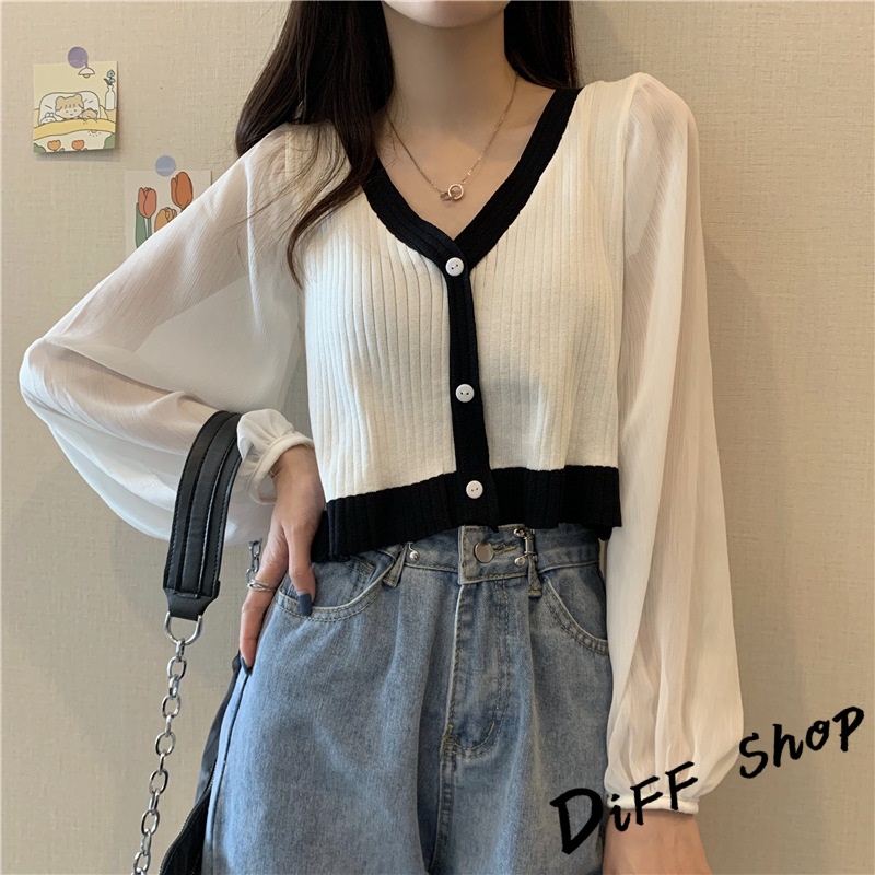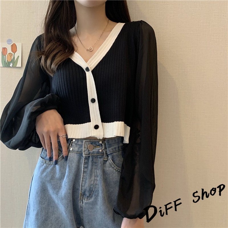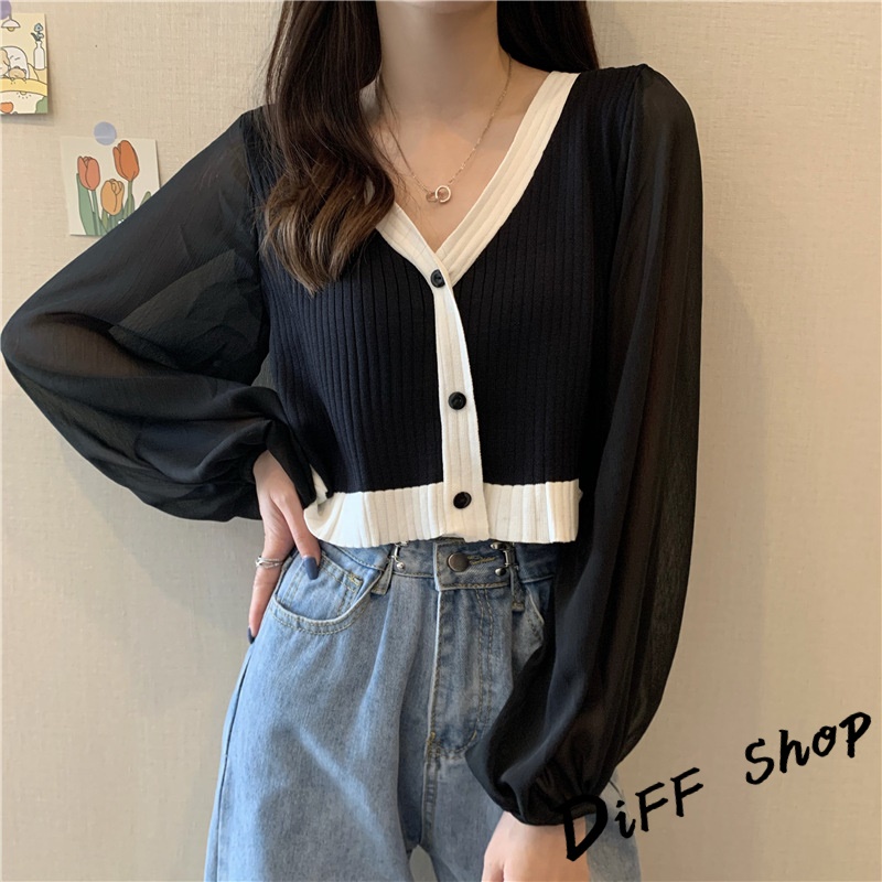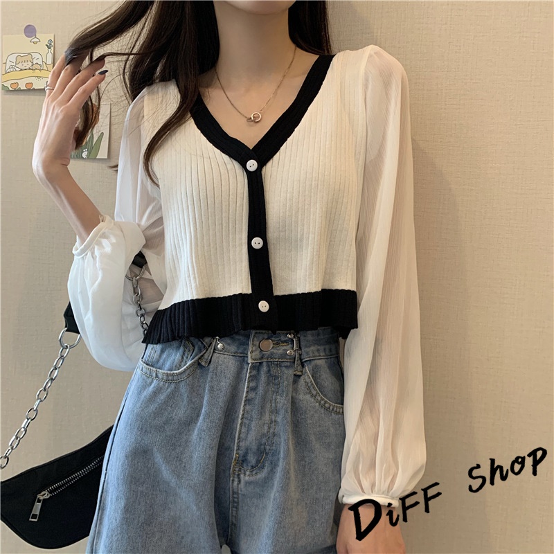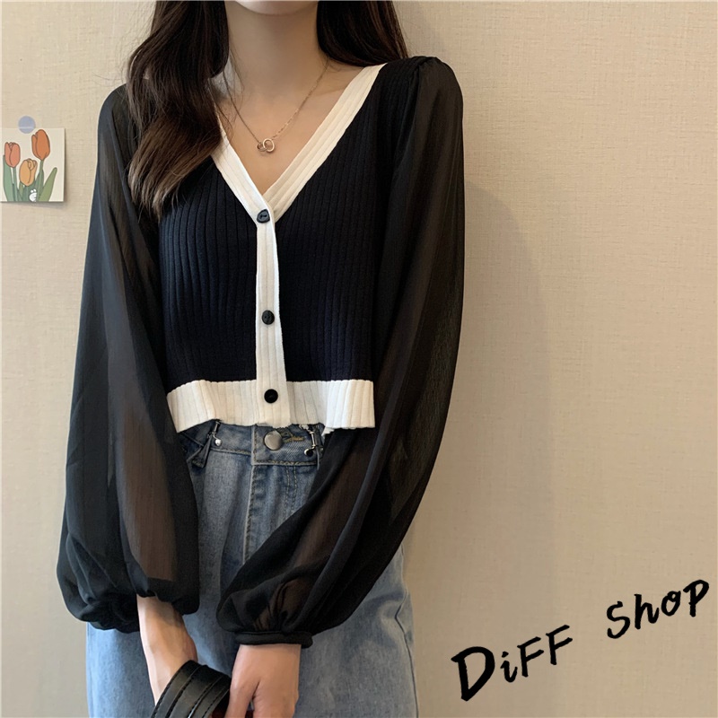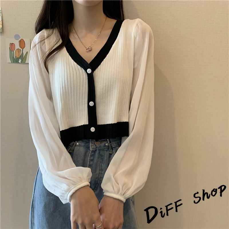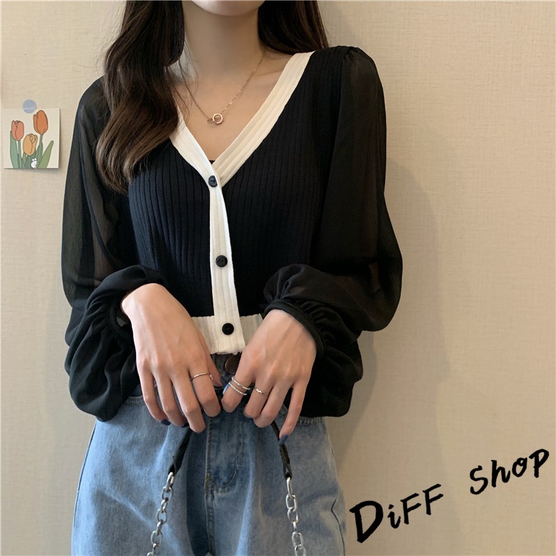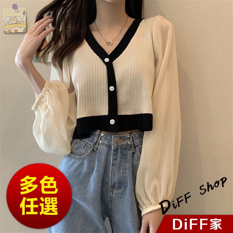 【DIFF】韓版寬鬆V領網紗拼接外套 薄外套 長袖上衣 針織上衣 女裝 衣服 顯瘦上衣 短版上衣 長袖t恤【J173】【J173】白色|【J173】黑色OthersDiFF shop