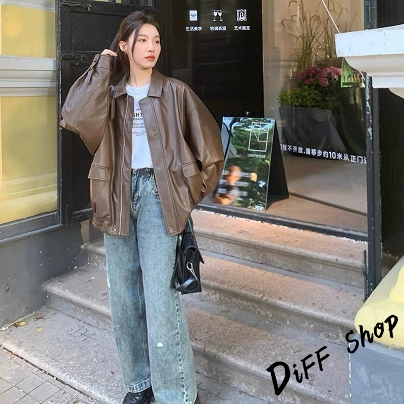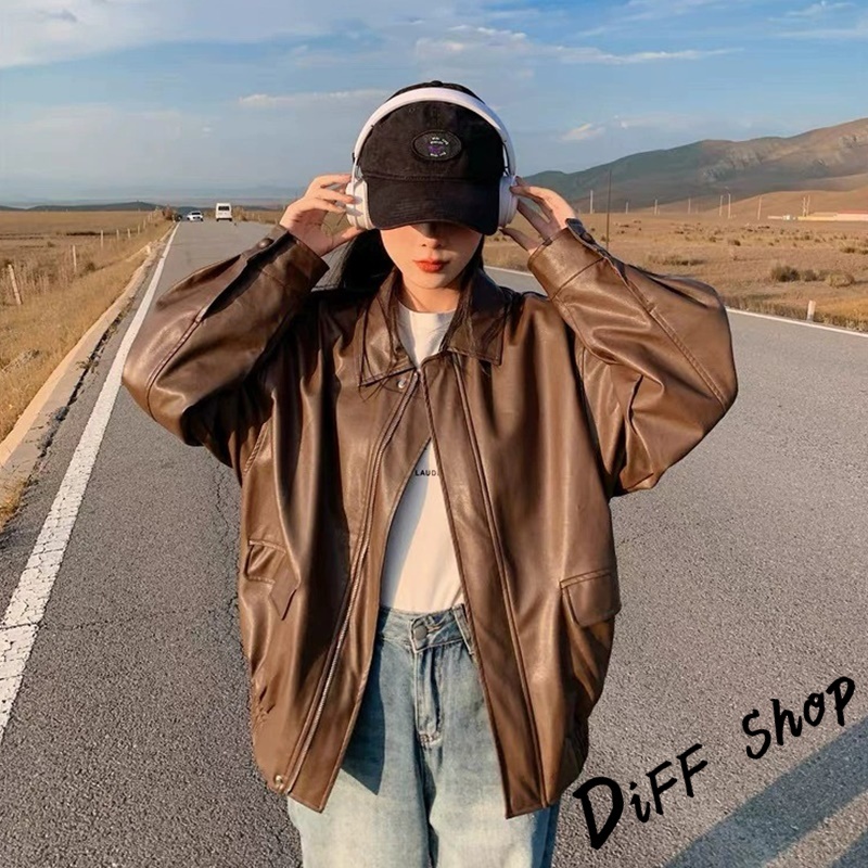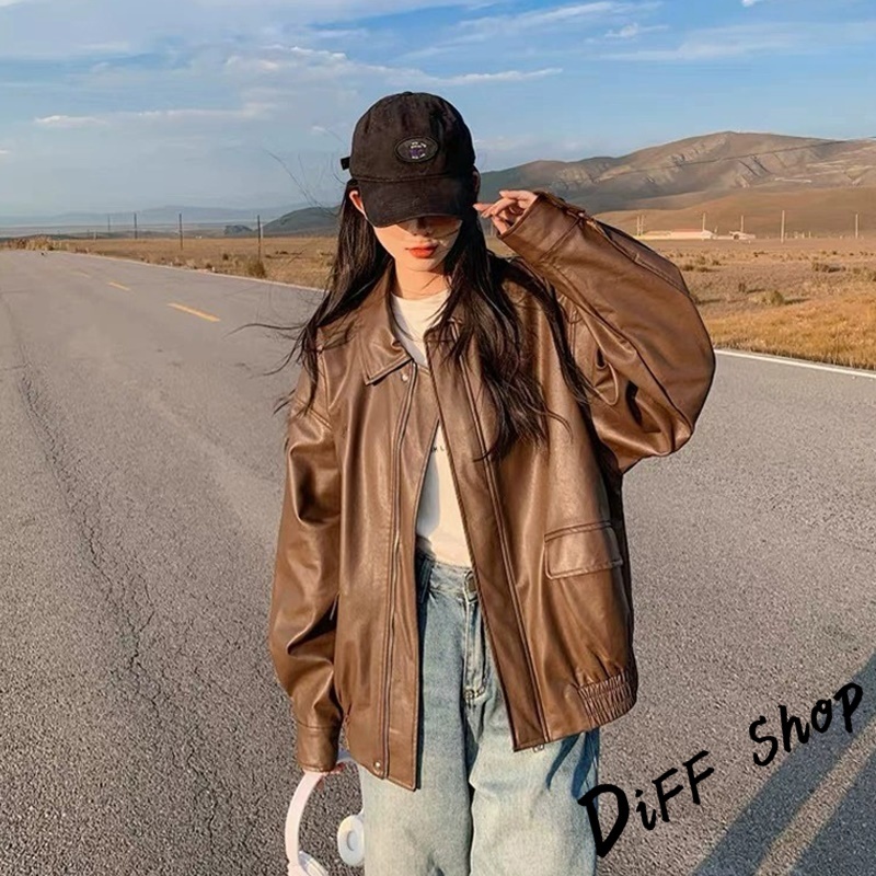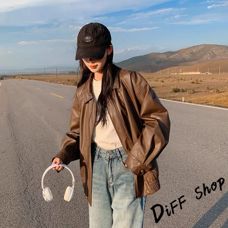 【DIFF】韓版寬鬆復古棕色皮衣 皮夾克 機車外套 皮外套 女裝 衣服 上衣 保暖外套 保暖上衣 冬天外套【J382】
