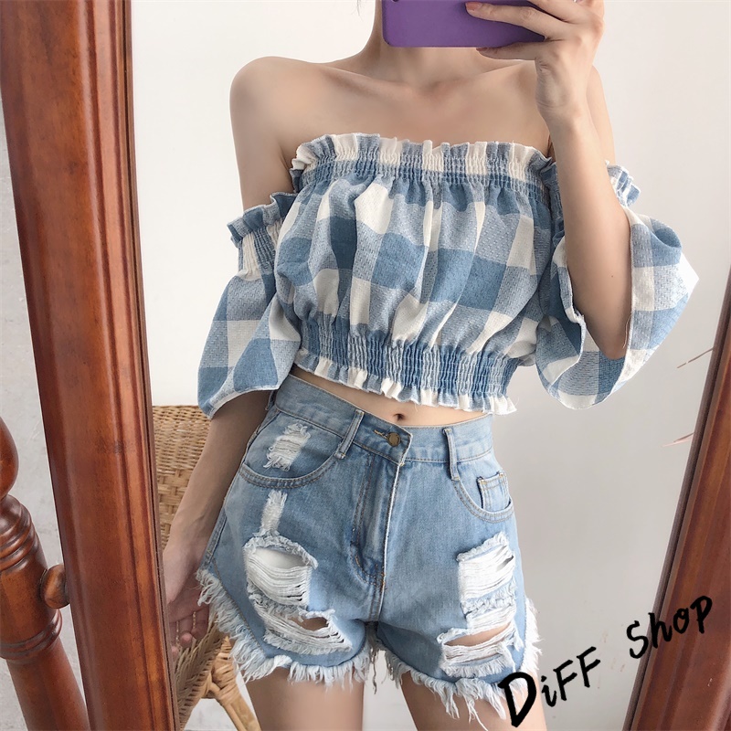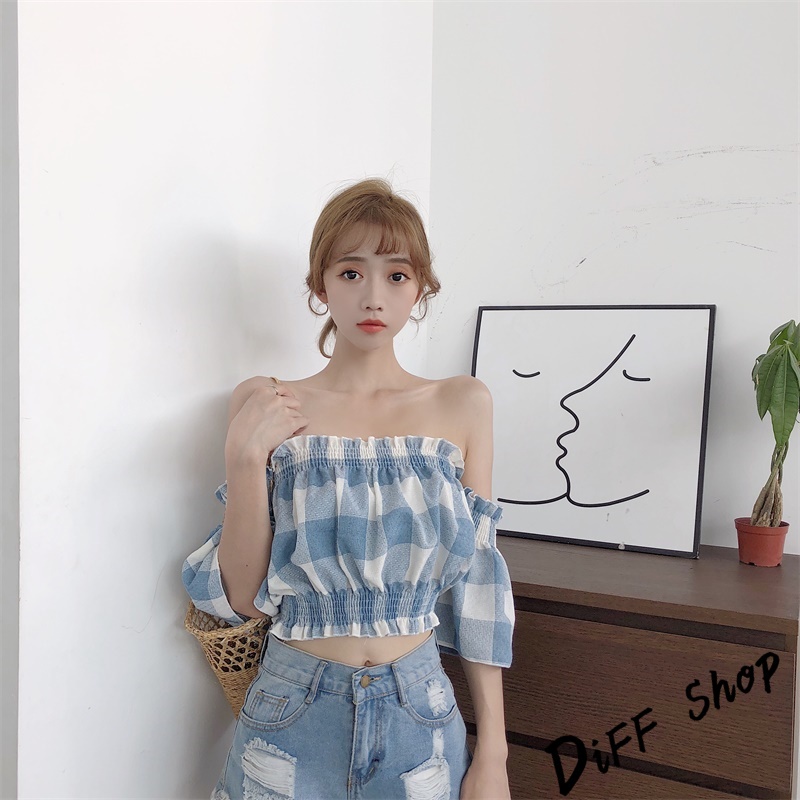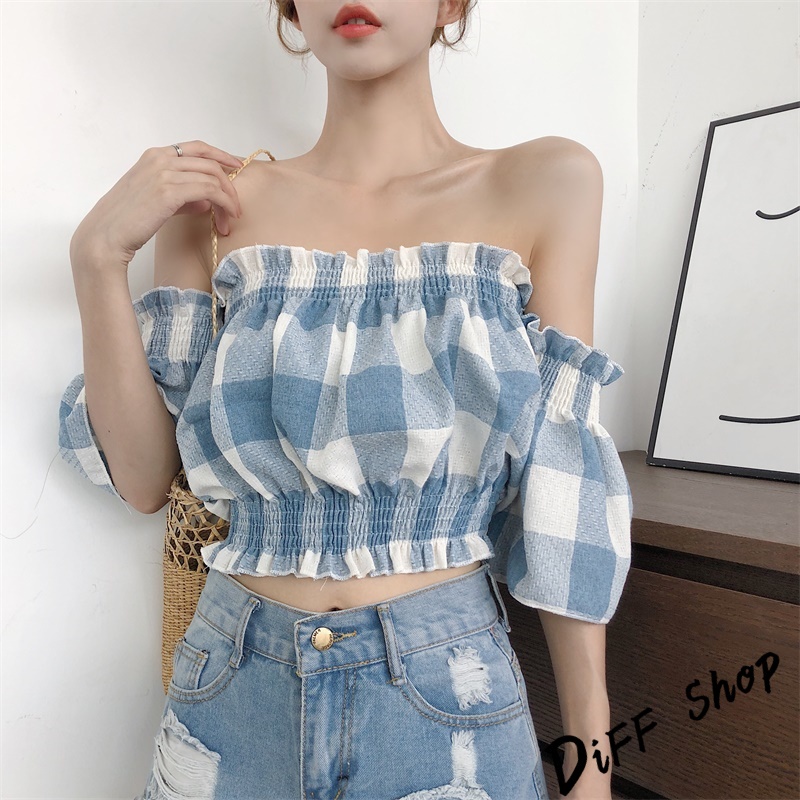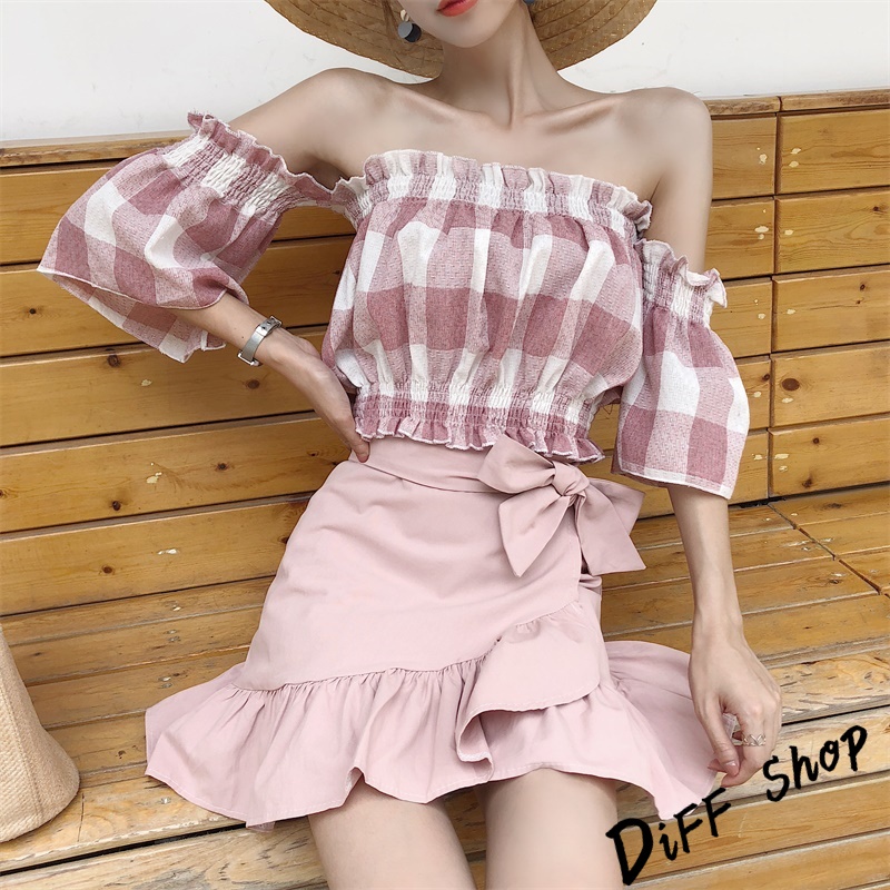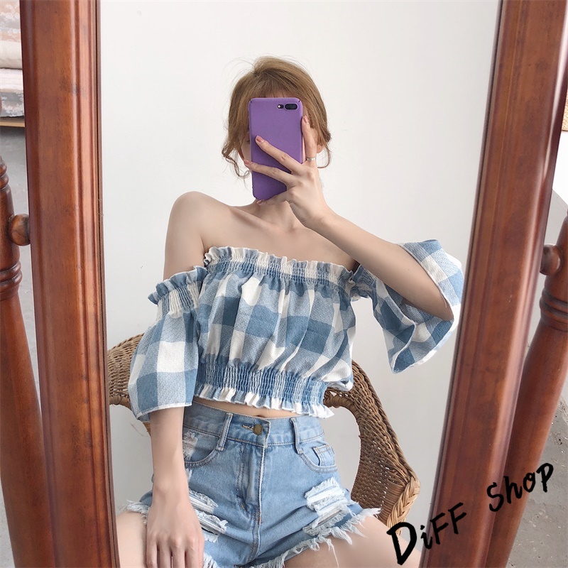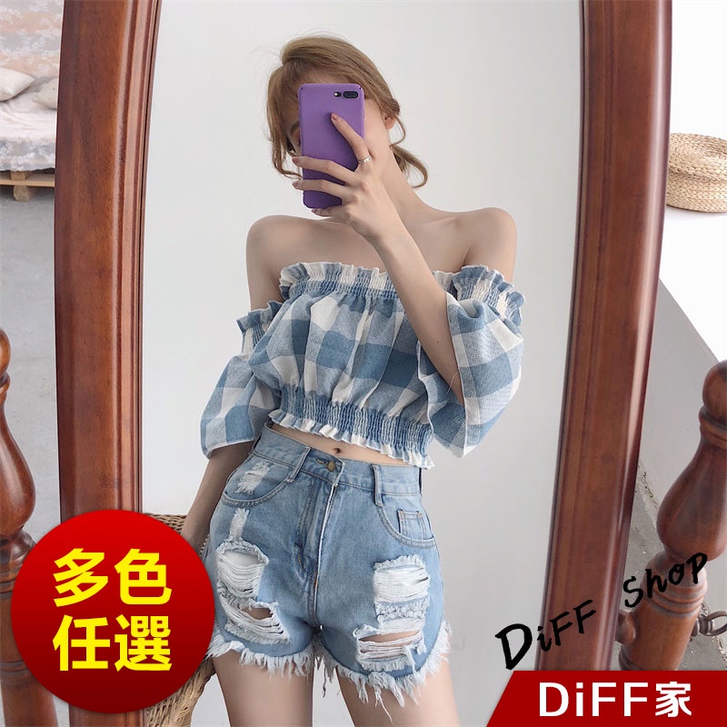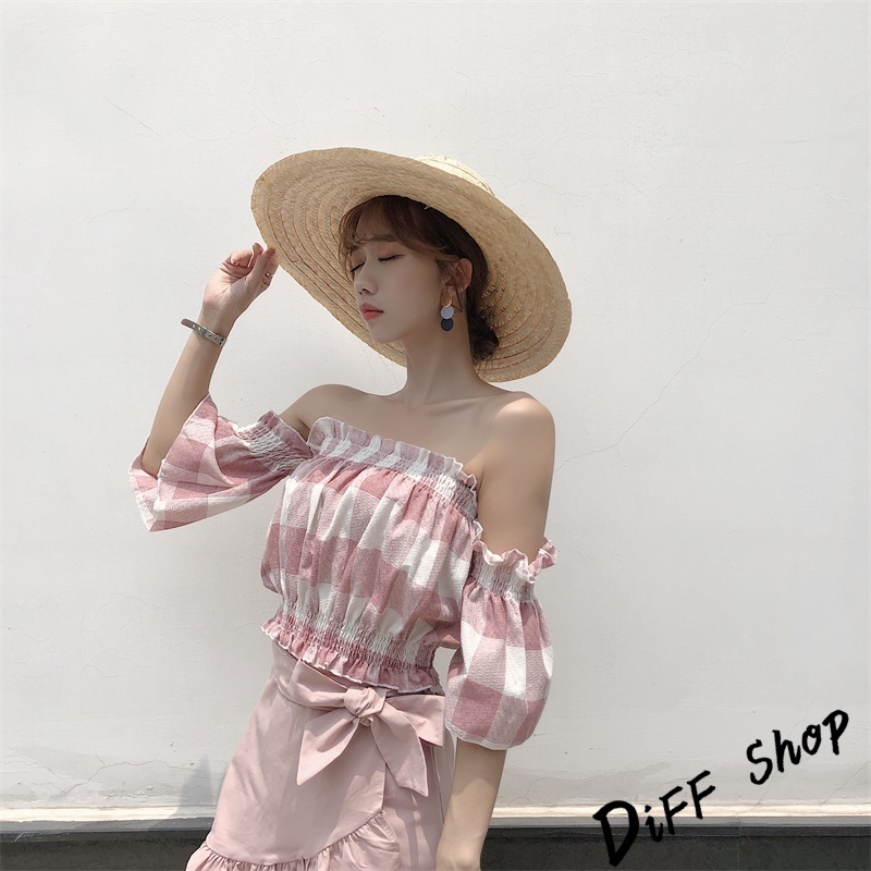 【DIFF】韓版一字領喇叭袖格子短袖上衣 短版上衣 短袖t恤 女裝 露肩上衣 衣服 夏天女裝 短袖t恤女【T203】【T203】藍色|【T203】粉色T-shirtsDiFF shop
