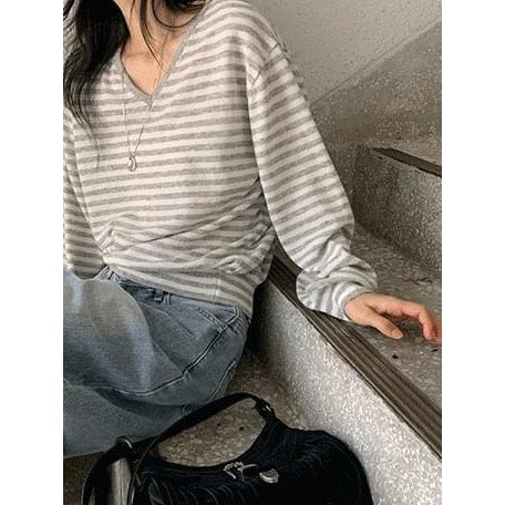 Codibook|韓國 DAILYJOU 灰色條紋寬鬆V領夏季針織上衣[預購]針織衫 T恤 女裝黃色|天空藍(天藍色)|粉紅色|紅色|紫色|綠色|摩卡色(摩卡)|灰色|黑色Codibook 韓國女裝購物平台
