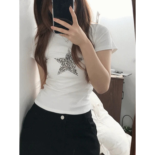 Codibook|韓國 lipkko Y2K豹紋星星修身短袖T恤[預購]短袖上衣 T恤 女裝白色,one sizeT-shirtsCodibook 韓國女裝購物平台