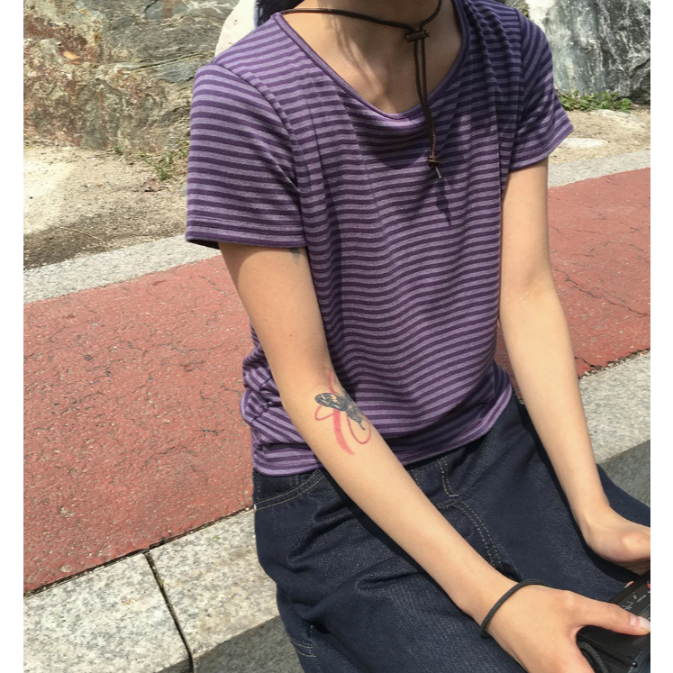 Codibook|韓國 DAILYJOU 條紋短袖圓領T恤[預購]長袖上衣 T恤 女裝棕色(咖啡色)-短袖|綠色-短袖|紫色-短袖|黑色-短袖T-shirtsCodibook 韓國女裝購物平台