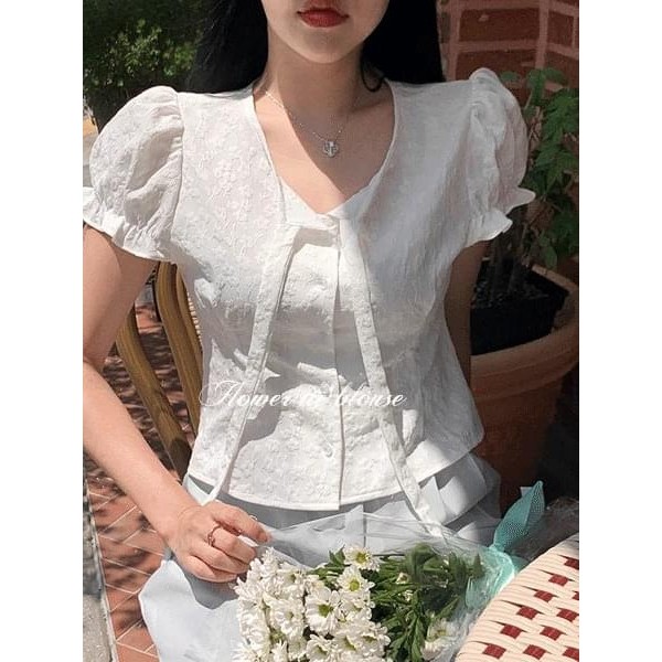 Codibook|韓國 secon’de secon 花朵綁帶V領短袖襯衫[預購]雪紡襯衫 女裝象牙白|天空藍|黑色Shirts & BlousesCodibook 韓國女裝購物平台