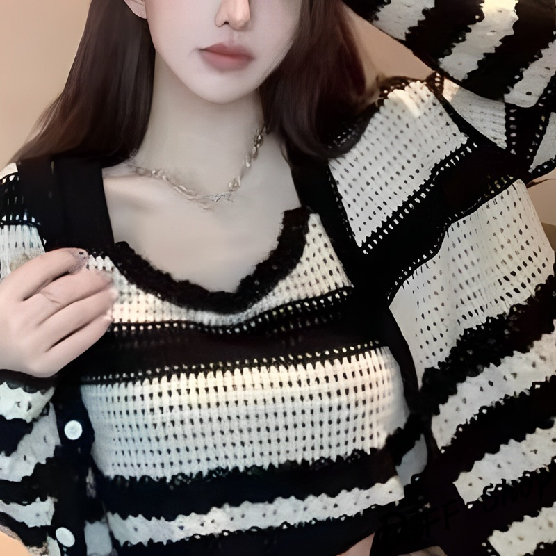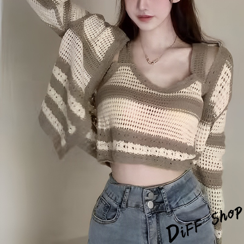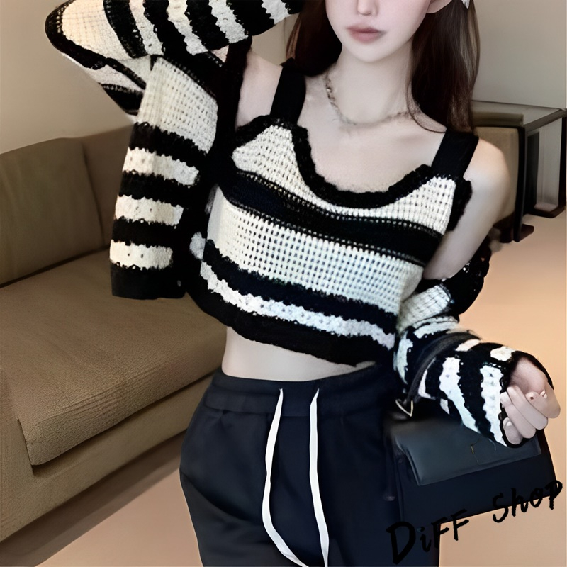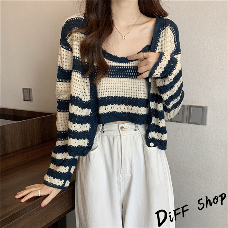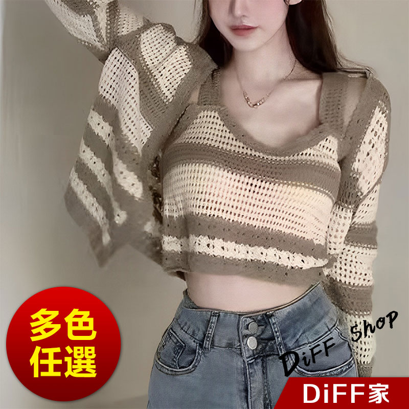 【DIFF】韓版鏤空撞色條紋薄針織外套+短版針織背心 兩件套 套裝 針織上衣 長袖上衣 小可愛 女裝 衣服【S276】【S276】黑色|【S276】杏色|【S276】藏青色Individual SetsDiFF shop