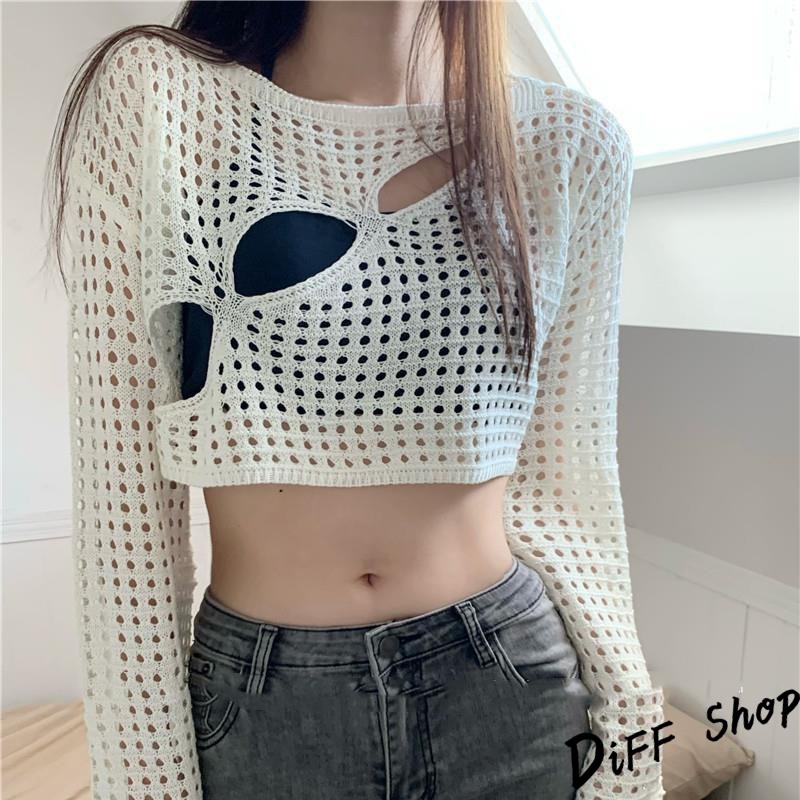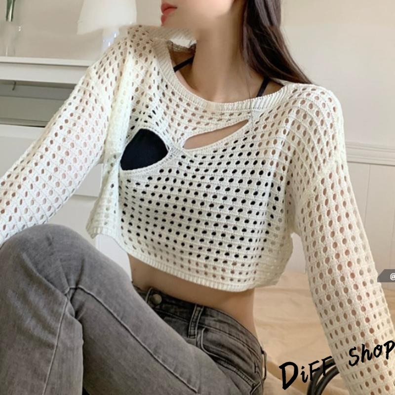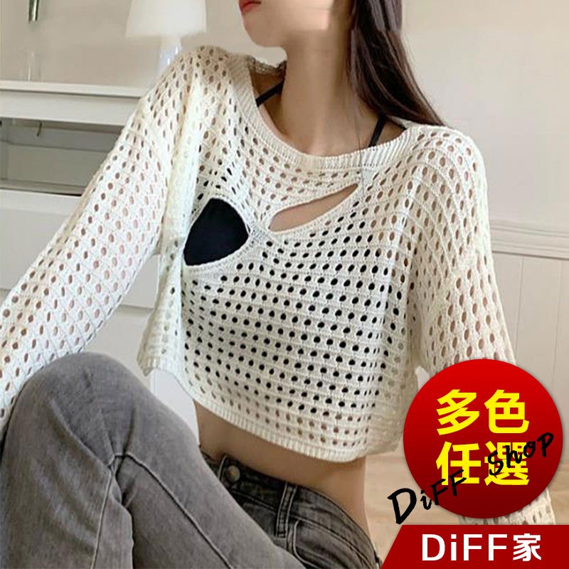 【DIFF】韓版設計感小心機縷空防曬上衣 針織上衣 長袖上衣 女裝 衣服 顯瘦上衣 長袖t恤 冬裝【W430】【W430】黑色|【W430】白色|【W430】卡其色DiFF shop