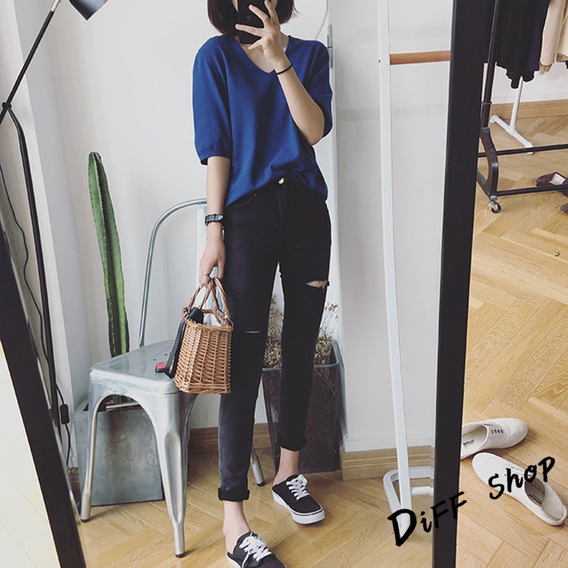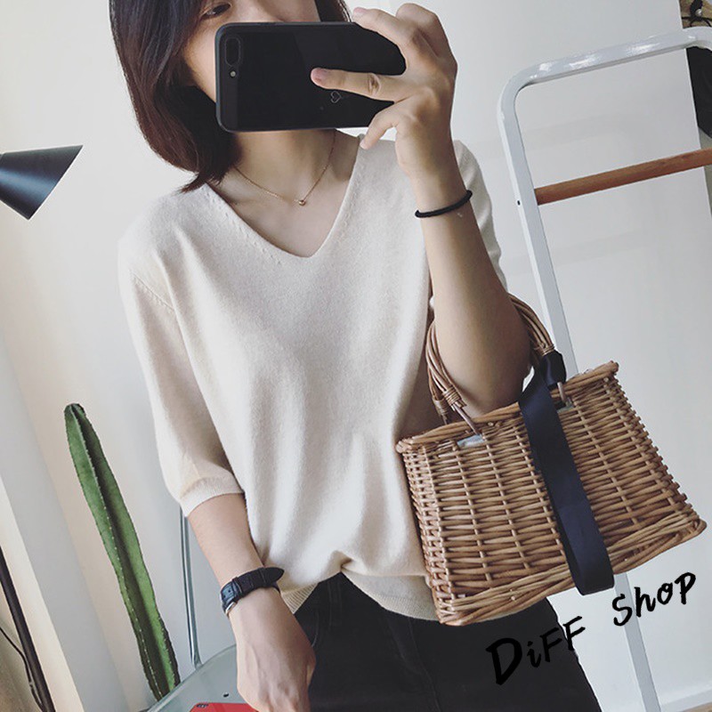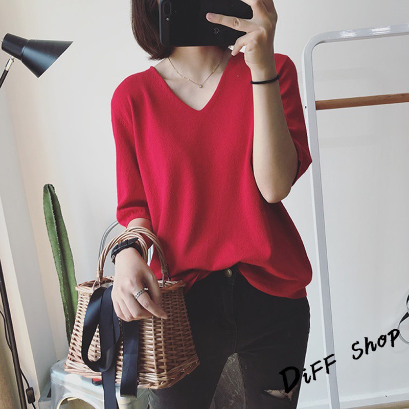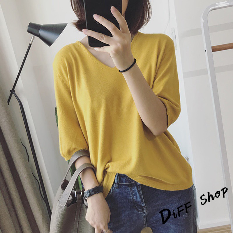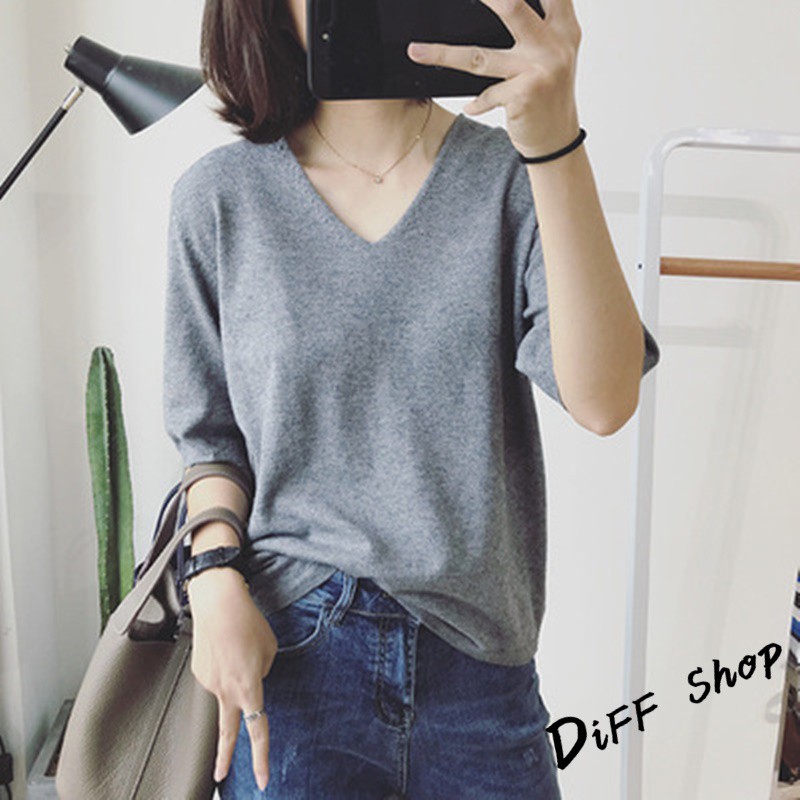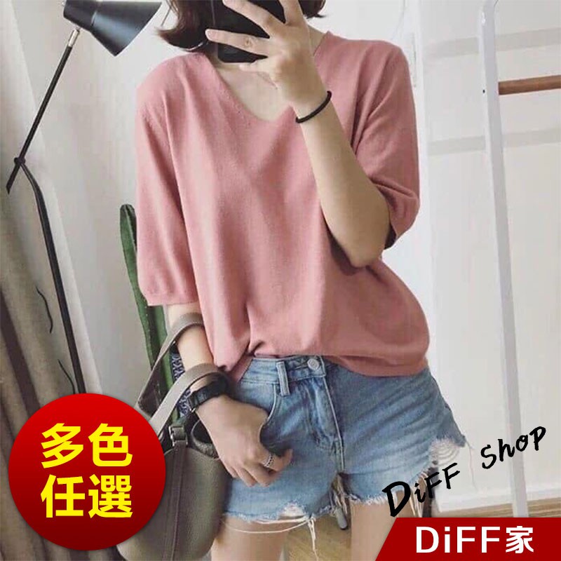【DIFF】韓版素色寬鬆V領針織上衣 短袖上衣 短袖t恤 女裝 顯瘦上衣 衣服 寬鬆上衣 素T【T246】【T246】粉色|【T246】藍綠色|【T246】灰色|【T246】黑色|【T246】紫色|【T246】卡其|【T246】米白|【T246】深藍T-shirtsDiFF shop