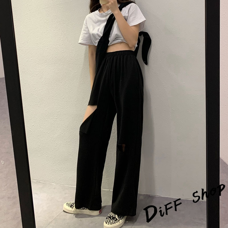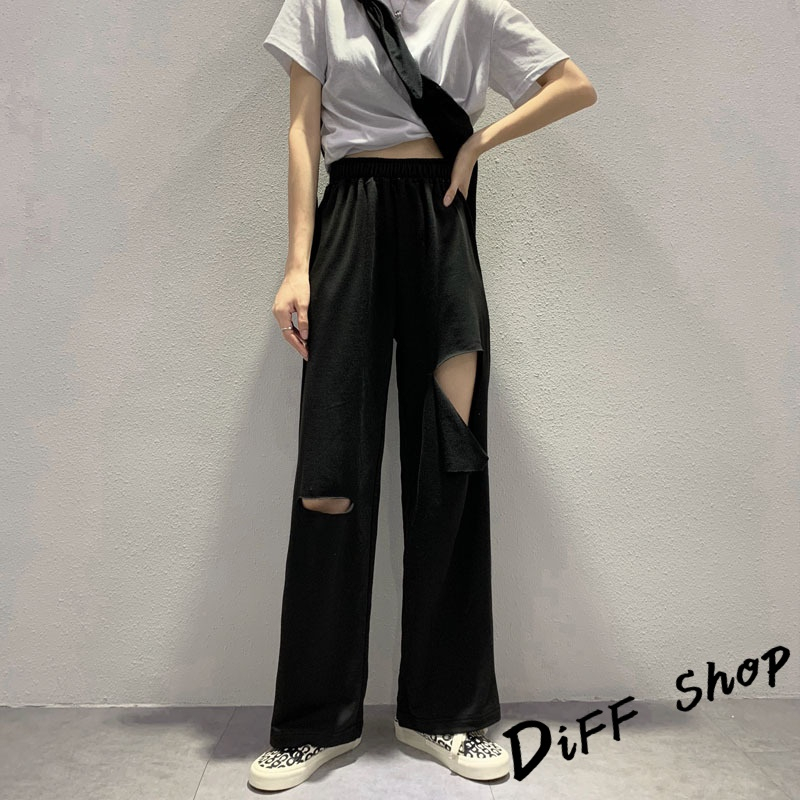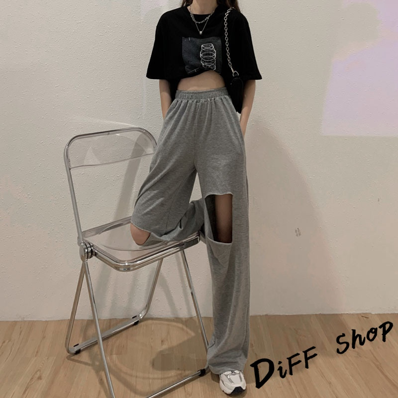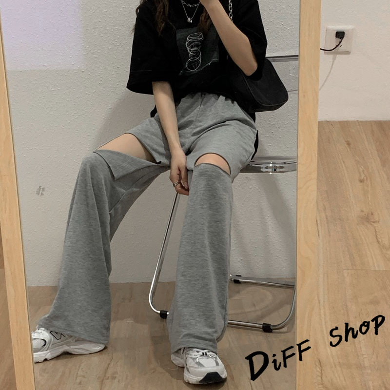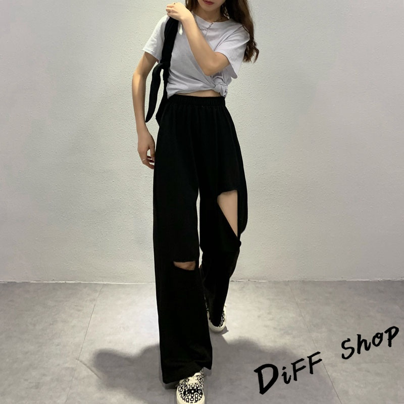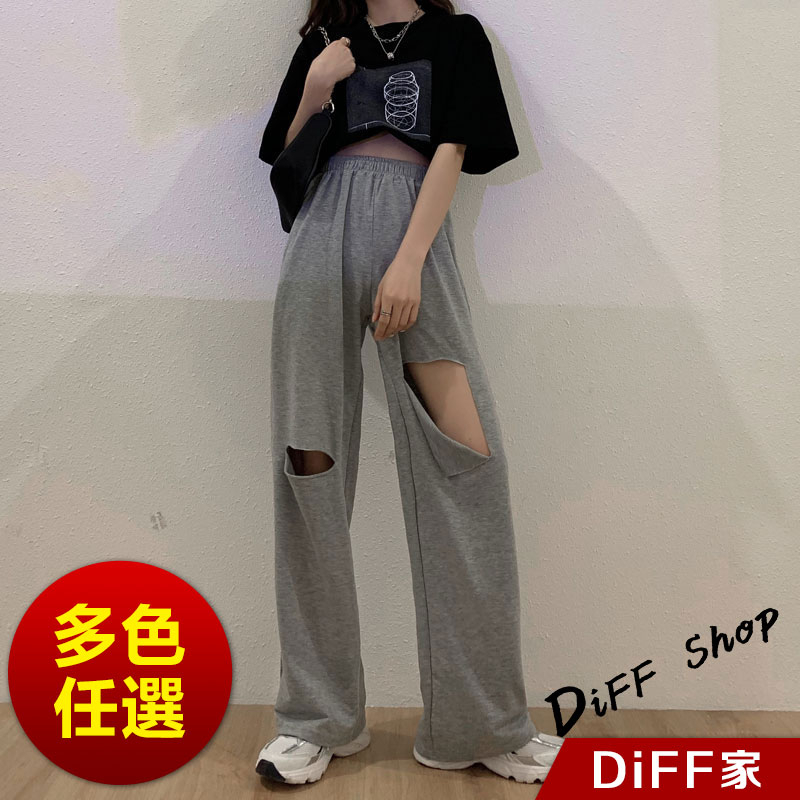 【DIFF】韓版大破洞運動褲 休閒長褲 破洞褲 破洞長褲 寬褲 褲子 長褲 休閒褲 女裝 高腰褲 直筒褲【P158】【P158】灰色|【P158】黑色PantsDiFF shop