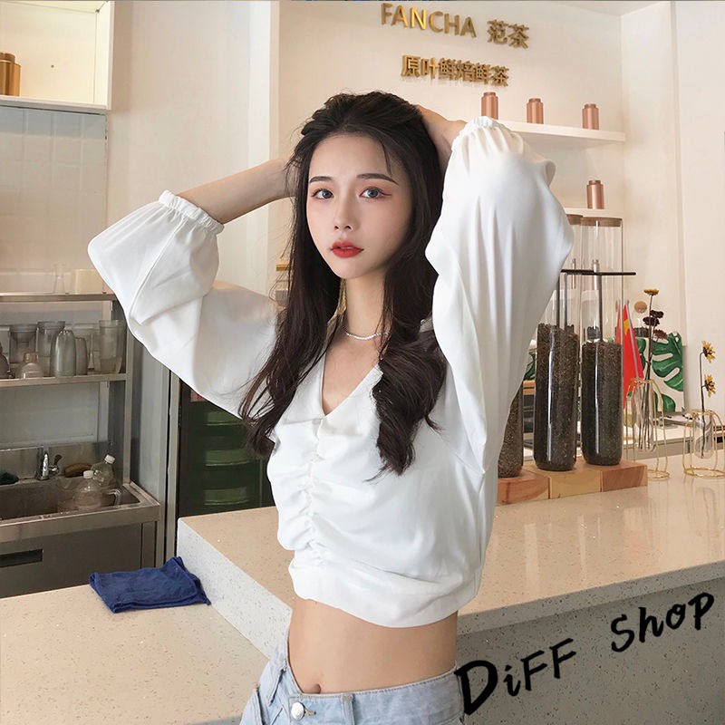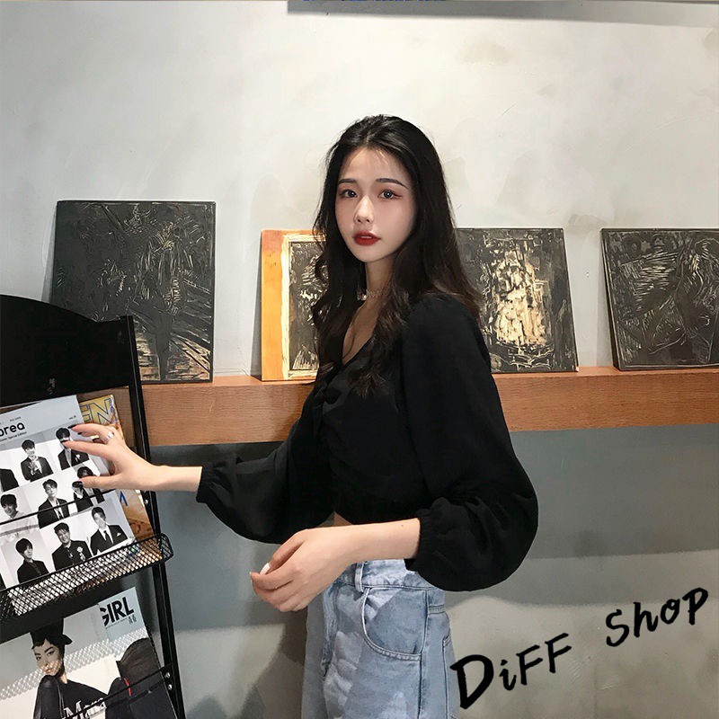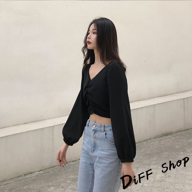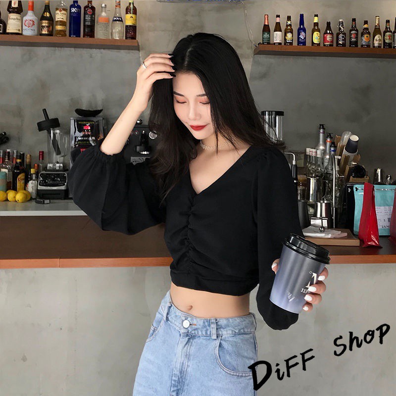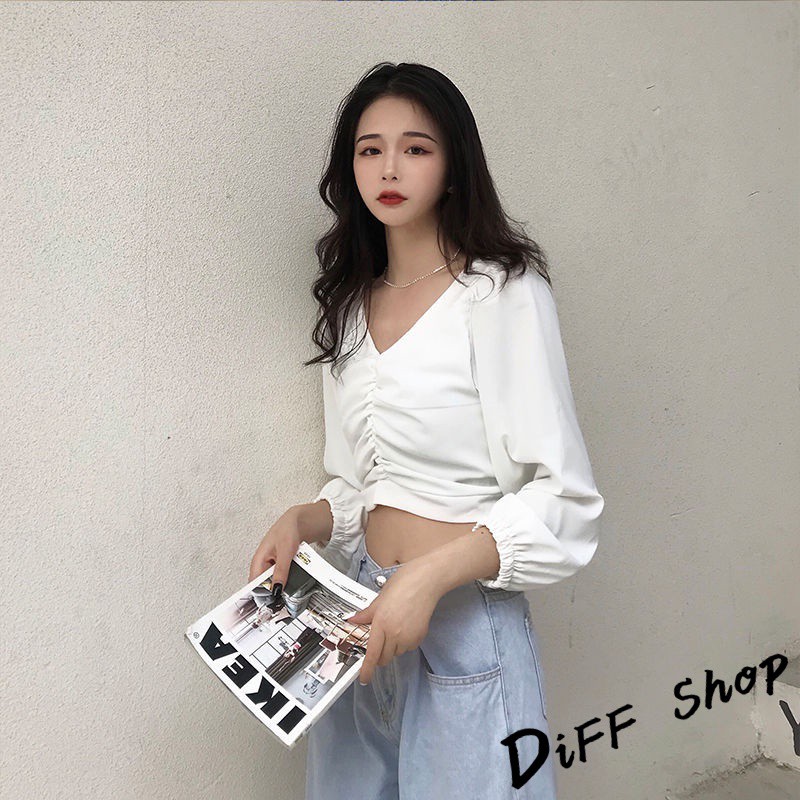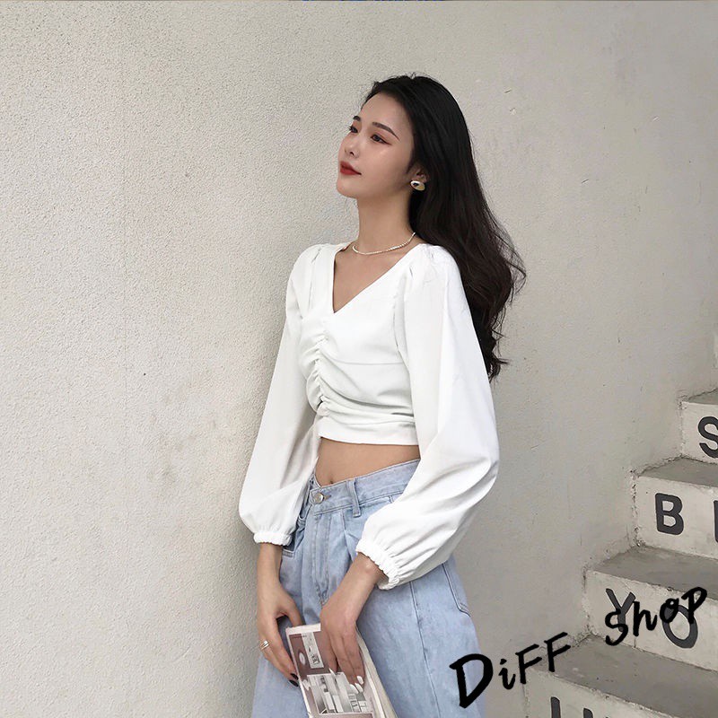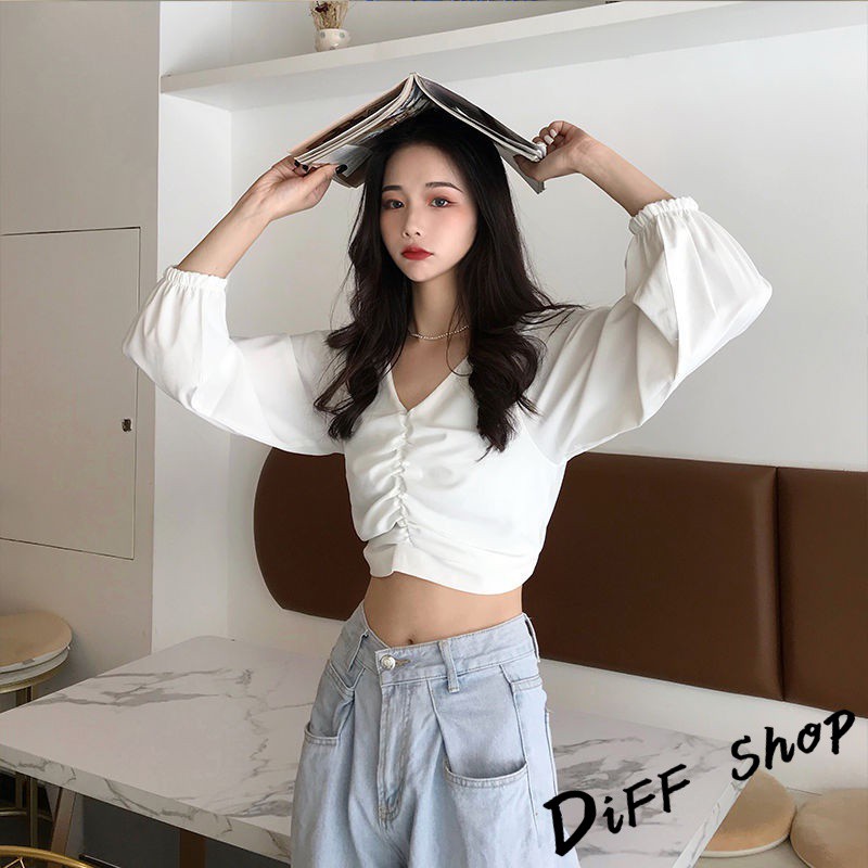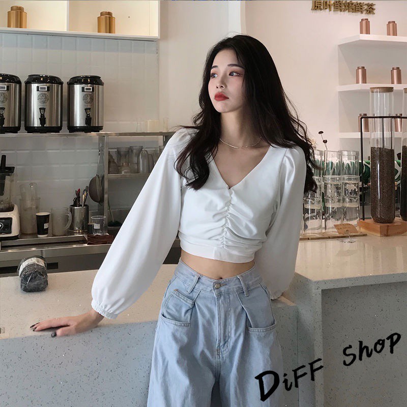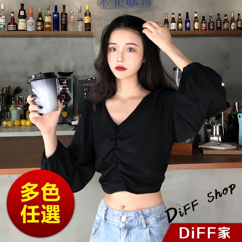【DIFF】韓版復古設計感V領短版長袖上衣 長袖t恤 女裝 衣服 寬鬆上衣 顯瘦上衣 素T 素色 冬天【W172】【W172】白色.|【W172】黑色.T-shirtsDiFF shop