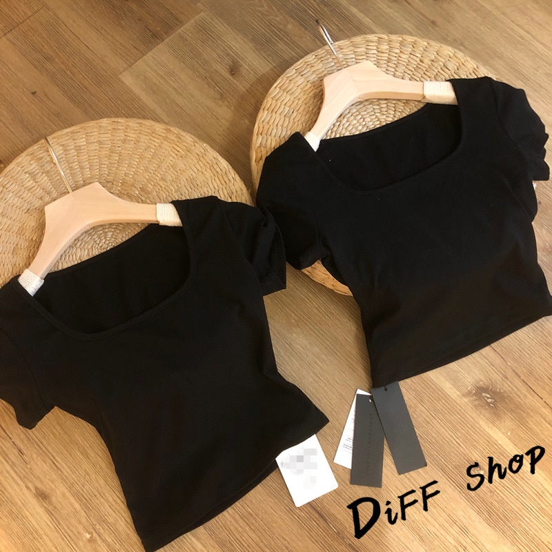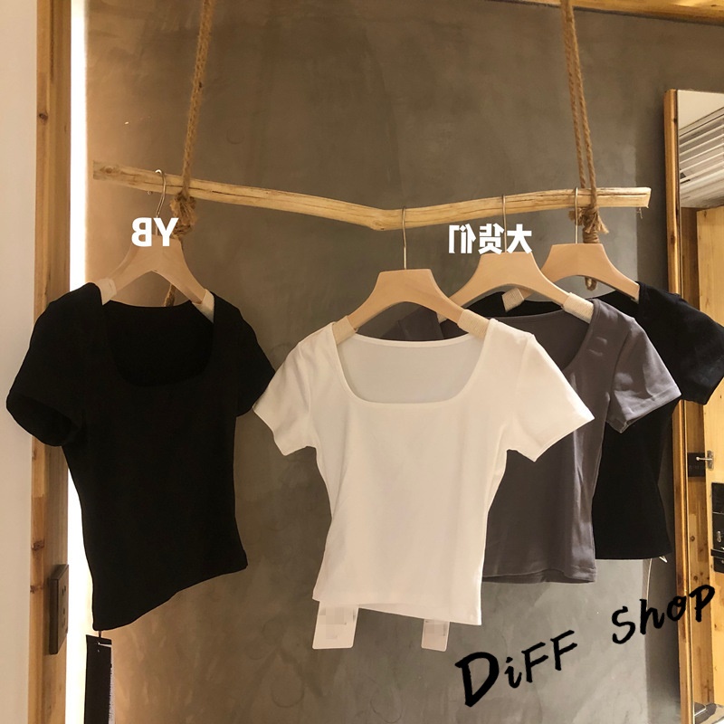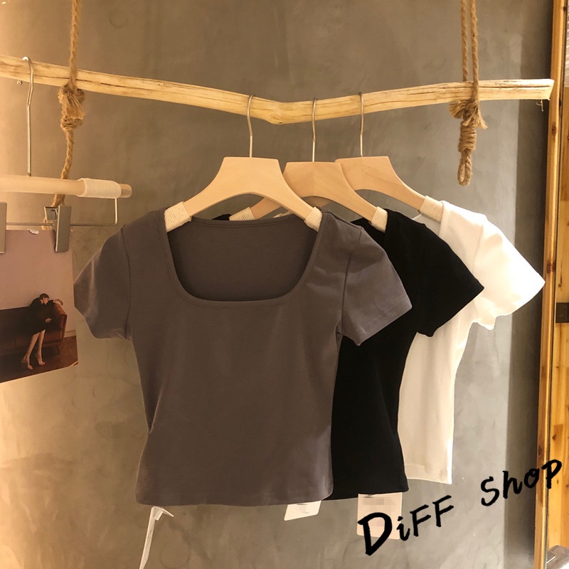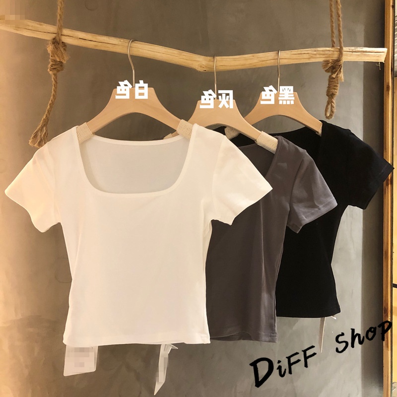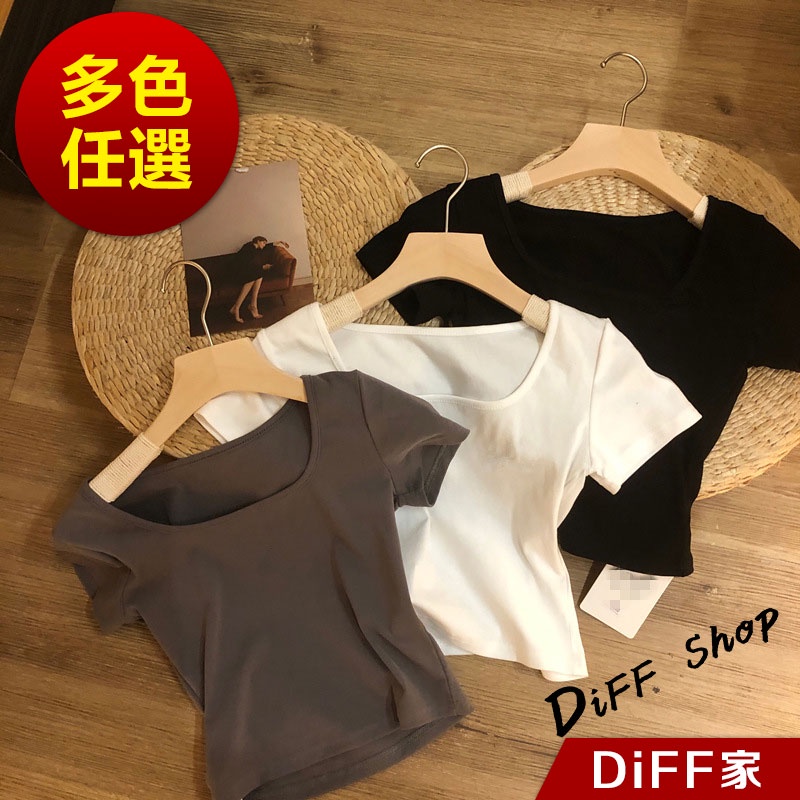 【DIFF】韓版方領彈性緊身短版上衣 短袖上衣 短袖t恤 女裝 顯瘦上衣 衣服 寬鬆上衣 素T 短板上衣【T355】