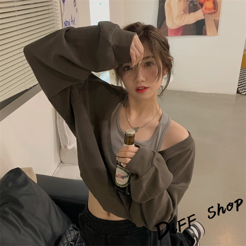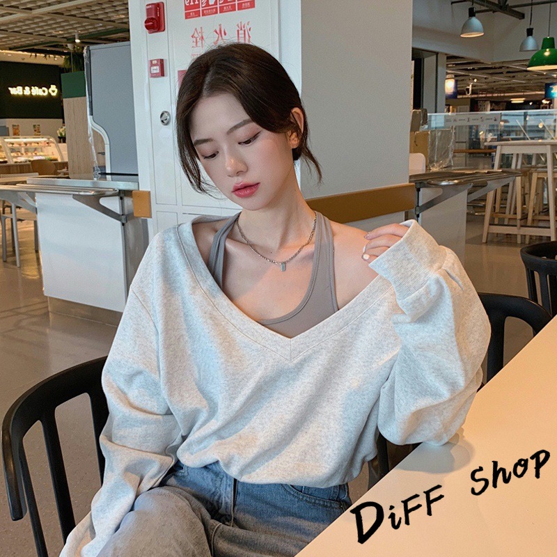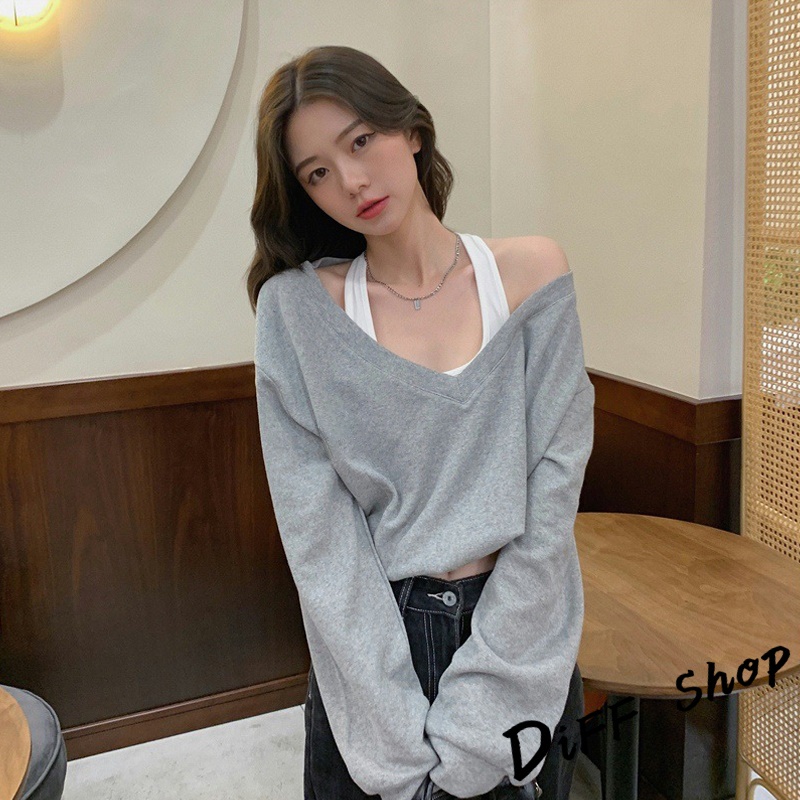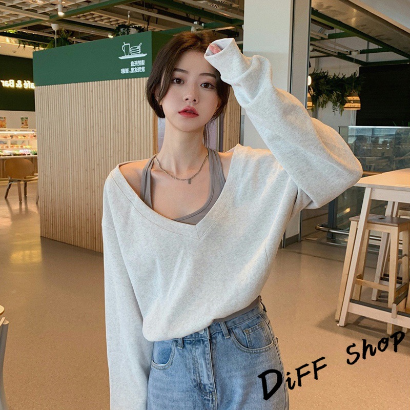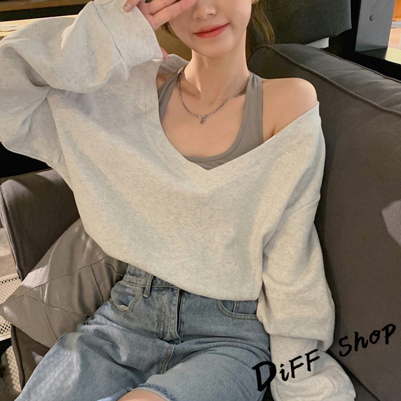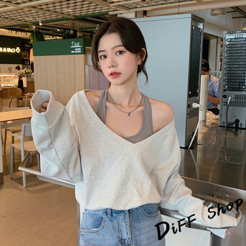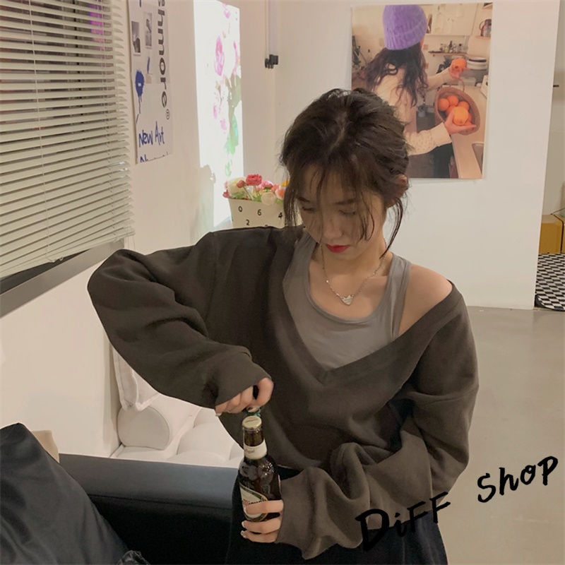 【DIFF】韓版寬鬆V領假兩件運動風薄款長袖上衣 女裝 衣服 寬鬆上衣 顯瘦上衣 長袖t恤 冬裝【W343】【W343】淺灰|【W343】白灰|【W343】灰咖 T-shirtsDiFF shop