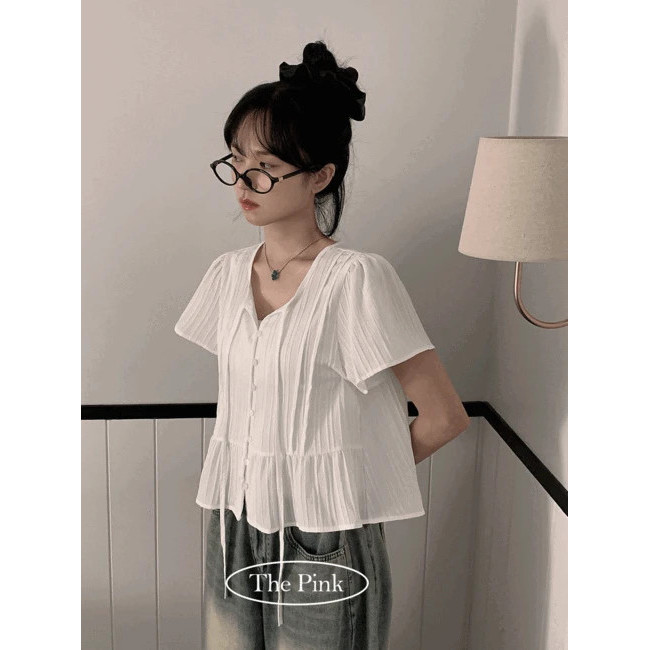 Codibook|韓國 thepink V領緞帶百褶寬擺短袖上衣[預購]雪紡襯衫 女裝象牙白,free|粉紅色,free|天空藍,freeShirts & BlousesCodibook 韓國女裝購物平台