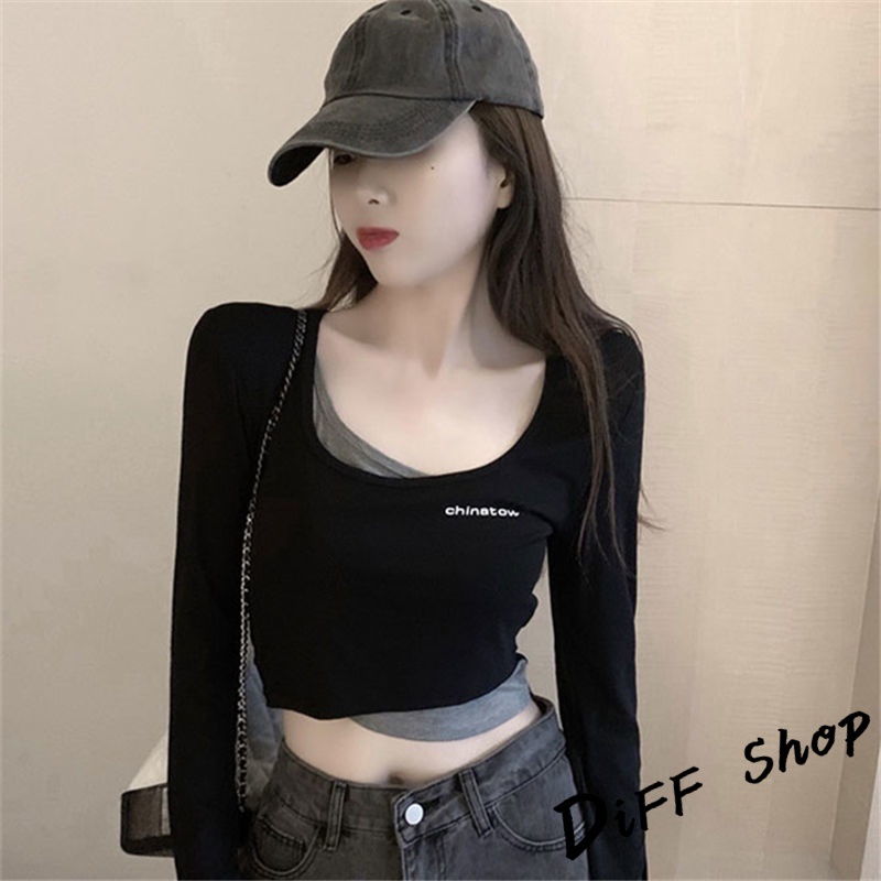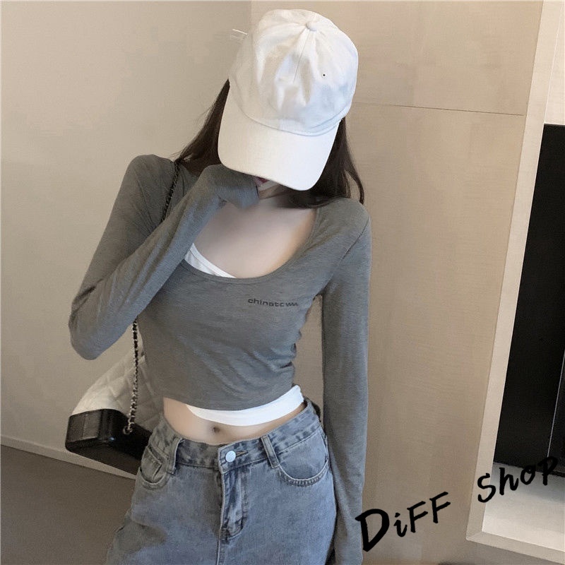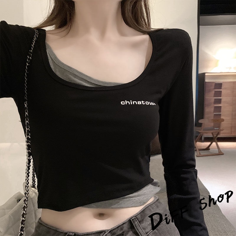 【DIFF】韓版假兩件短版長袖上衣 短版上衣 女裝 衣服 寬鬆上衣 顯瘦上衣 長袖t恤 冬裝 素T 素色【W304】【W304】黑色|【W304】灰色T-shirtsDiFF shop
