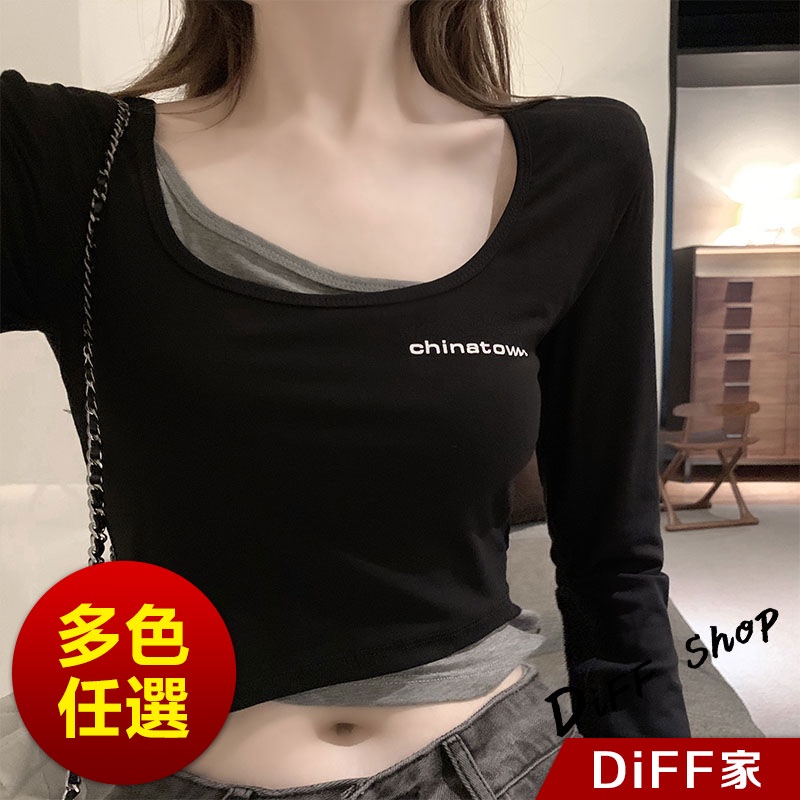 【DIFF】韓版假兩件短版長袖上衣 短版上衣 女裝 衣服 寬鬆上衣 顯瘦上衣 長袖t恤 冬裝 素T 素色【W304】