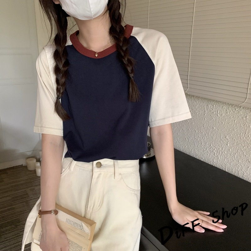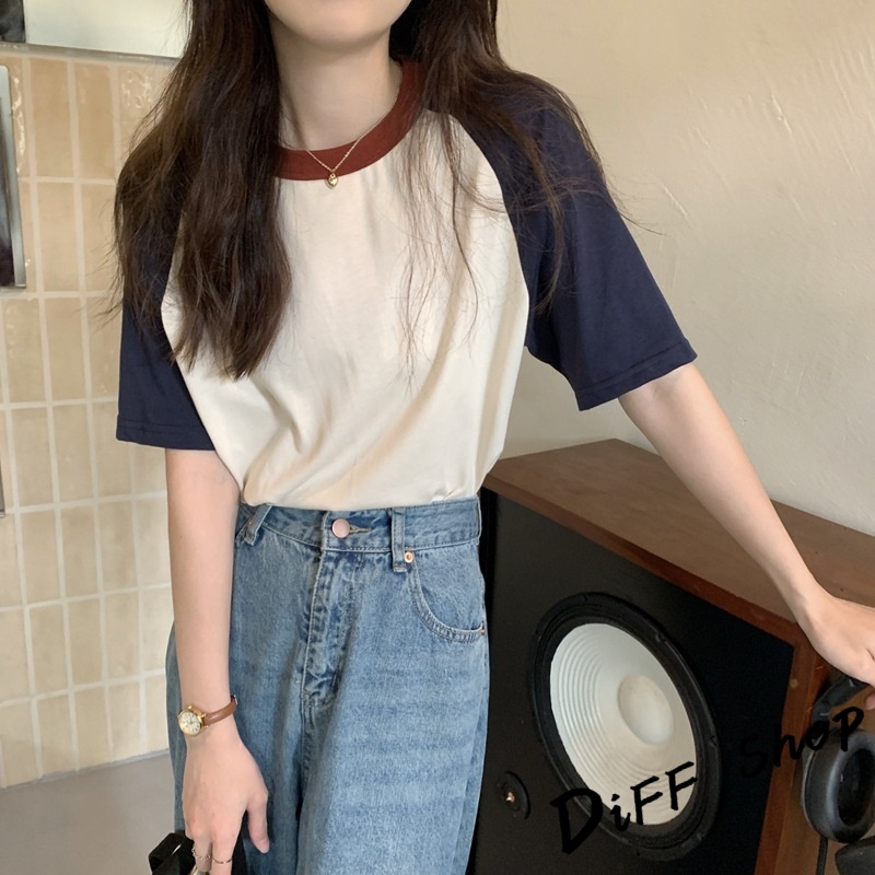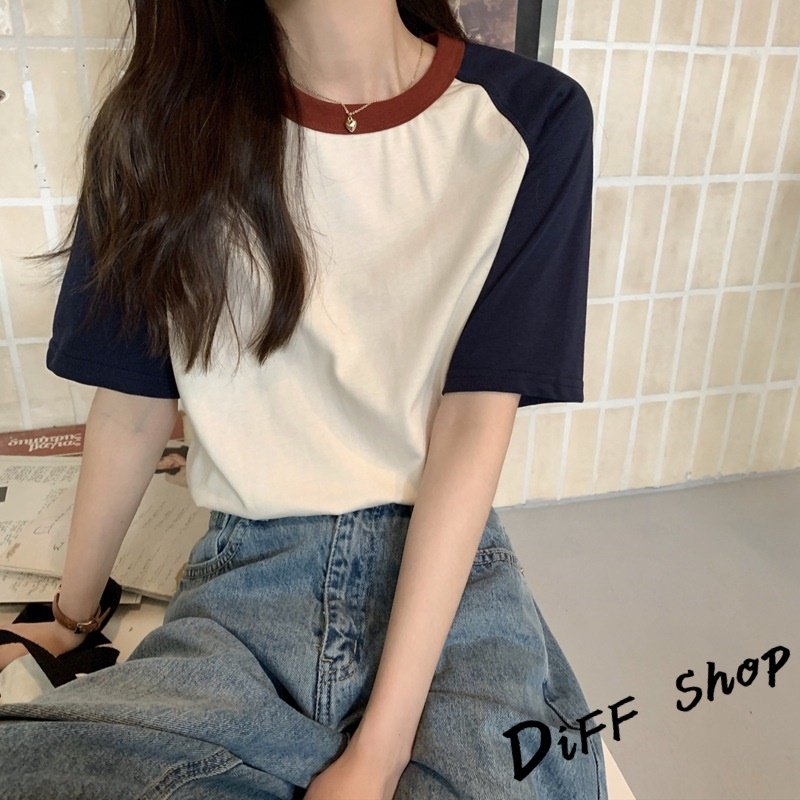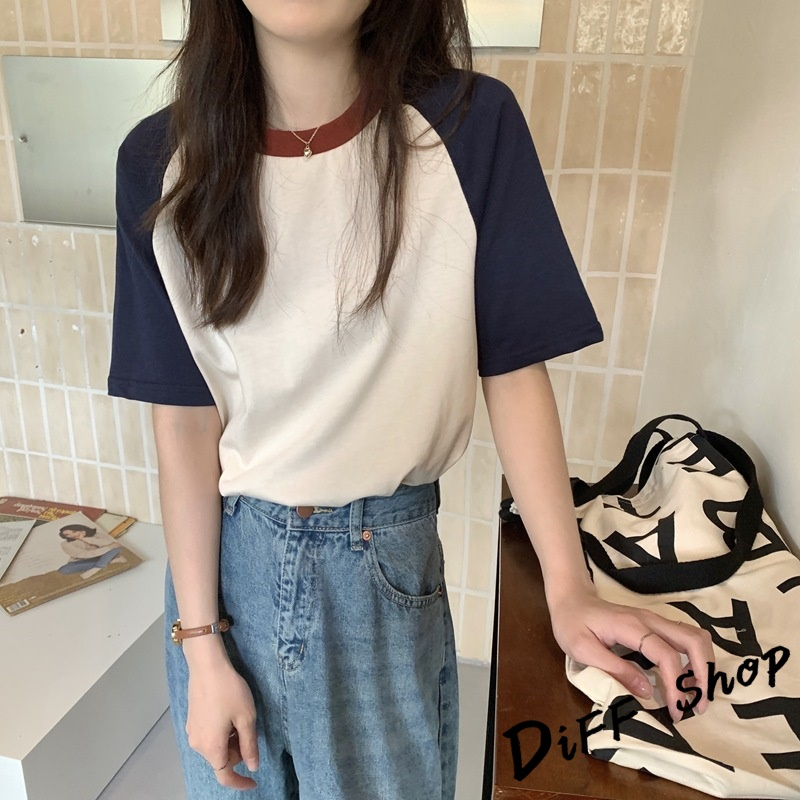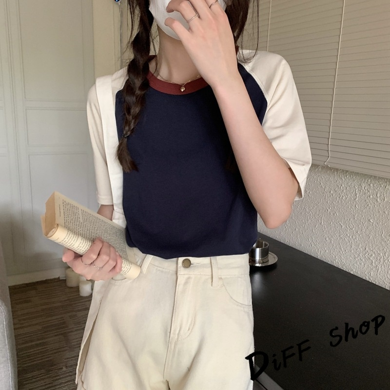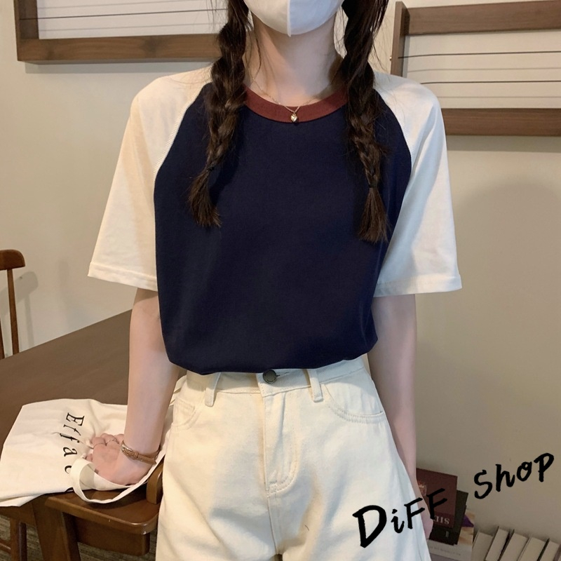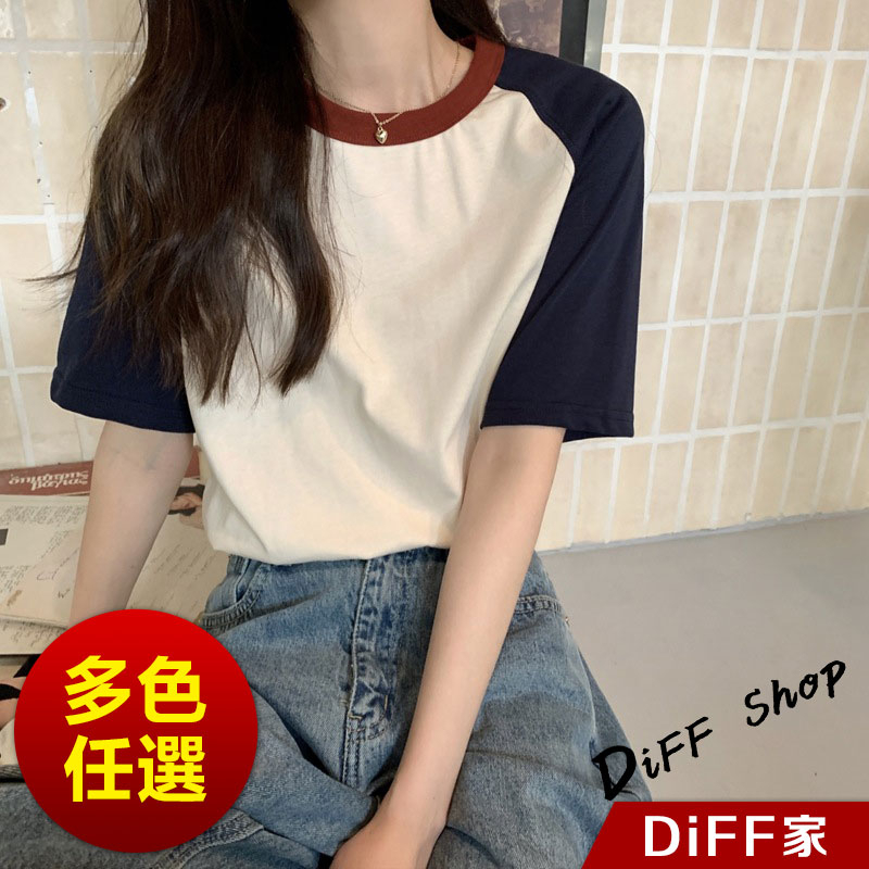 【DIFF】韓版簡約休閒寬鬆撞色短袖上衣 短袖t恤 女裝 顯瘦上衣 衣服 寬鬆上衣 素T 【T501】【T501】杏色|【T501】藏藍色T-shirtsDiFF shop