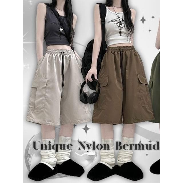 Codibook|韓國 ccomeng 尼龍卡其寬鬆及膝短褲(附褲頭鬆緊帶)[預購]短褲 女裝淺米色,one size|深米色,one size|卡其色,one size|黑色,one sizeShortsCodibook 韓國女裝購物平台