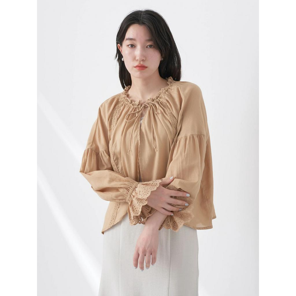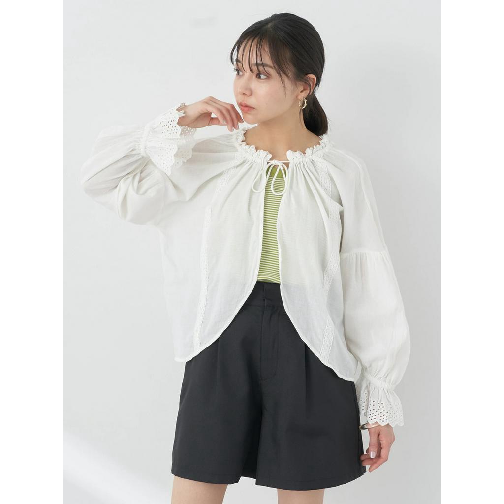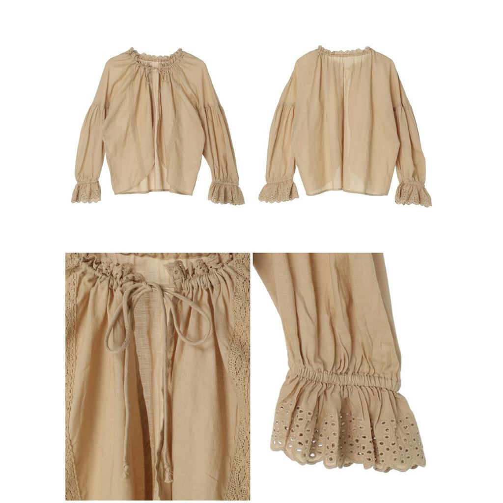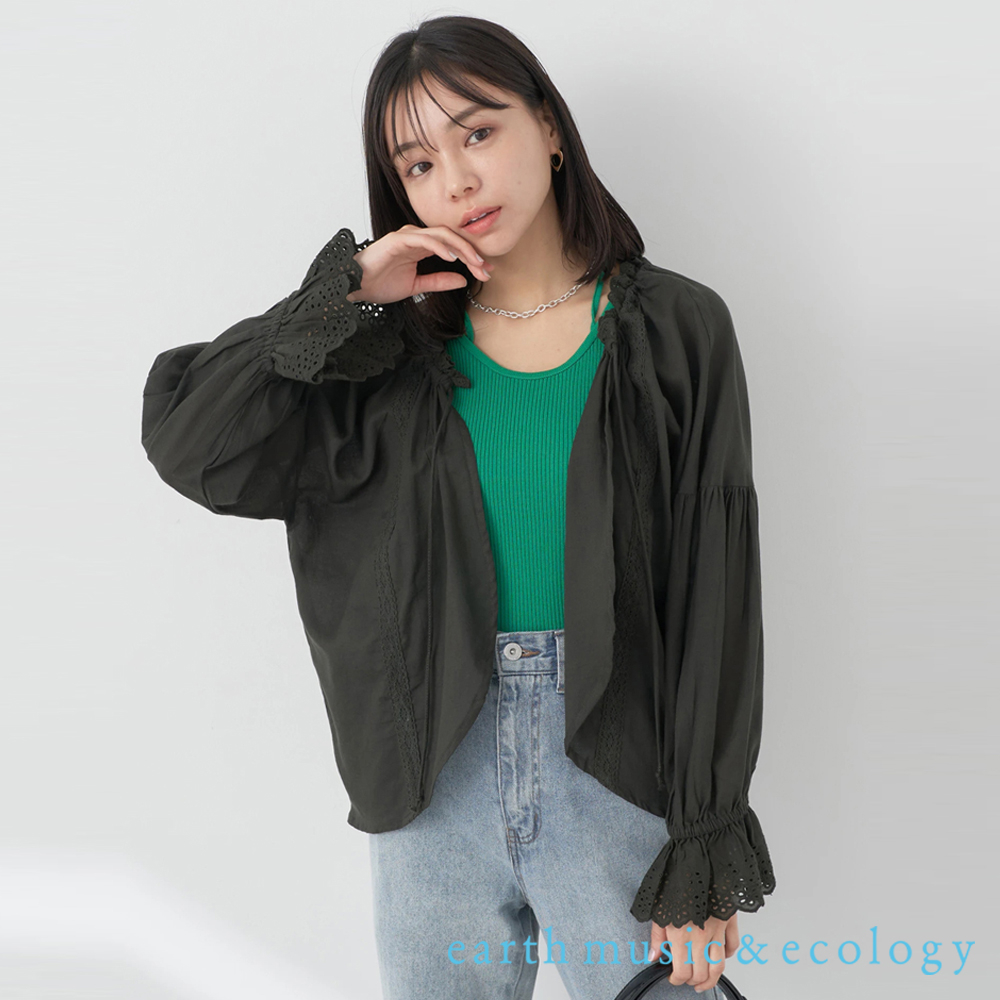 earth music&ecology 蕾絲摺邊綁帶設計喇叭袖純棉開襟上衣(1M32L0A0100)黑色F|米色F|本白FT-shirtsearth music&ecology Select Store