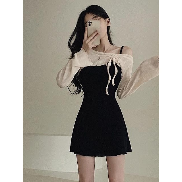 Codibook|韓國 LOVENSOME 一字領抓皺細肩帶兩件式短版及膝洋裝[預購]迷你短洋裝 露肩洋裝 女裝黑色,FREE|象牙白,FREE|米褐色,FREE|紫色,FREECodibook 韓國女裝購物平台