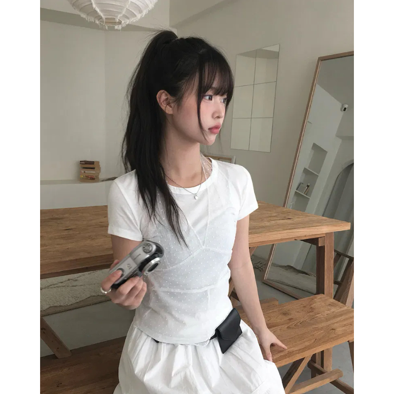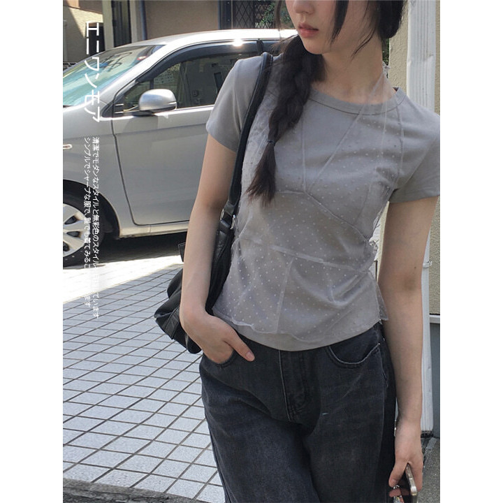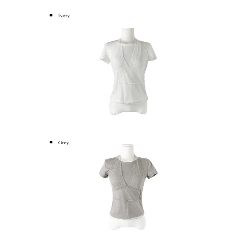Codibook|韓國 anyonemore 點點透膚蕾絲掛脖疊穿短袖T恤[預購]短袖上衣 T恤 女裝free,象牙白|free,灰色T-shirtsCodibook 韓國女裝購物平台